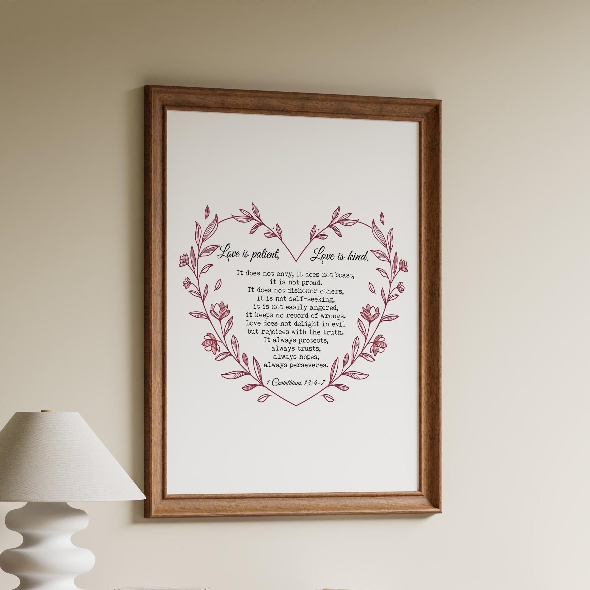 Bring timeless scripture and elegant design into your home with this beautifully crafted art print featuring 1 Corinthians 13:4-7. Arranged inside a delicate heart-shaped floral frame, this piece highlights the cherished words: