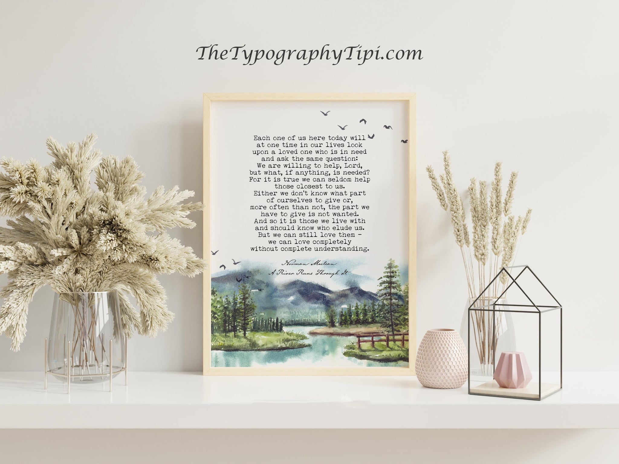 This beautiful art print features a heartfelt quote from Norman Maclean’s A River Runs Through It, set in classic black type over a serene watercolor landscape of mountains, forest, and river. The words reflect on love, understanding, and the often-elusive nature of helping those closest to us—offering a touching reminder of compassion and quiet strength.