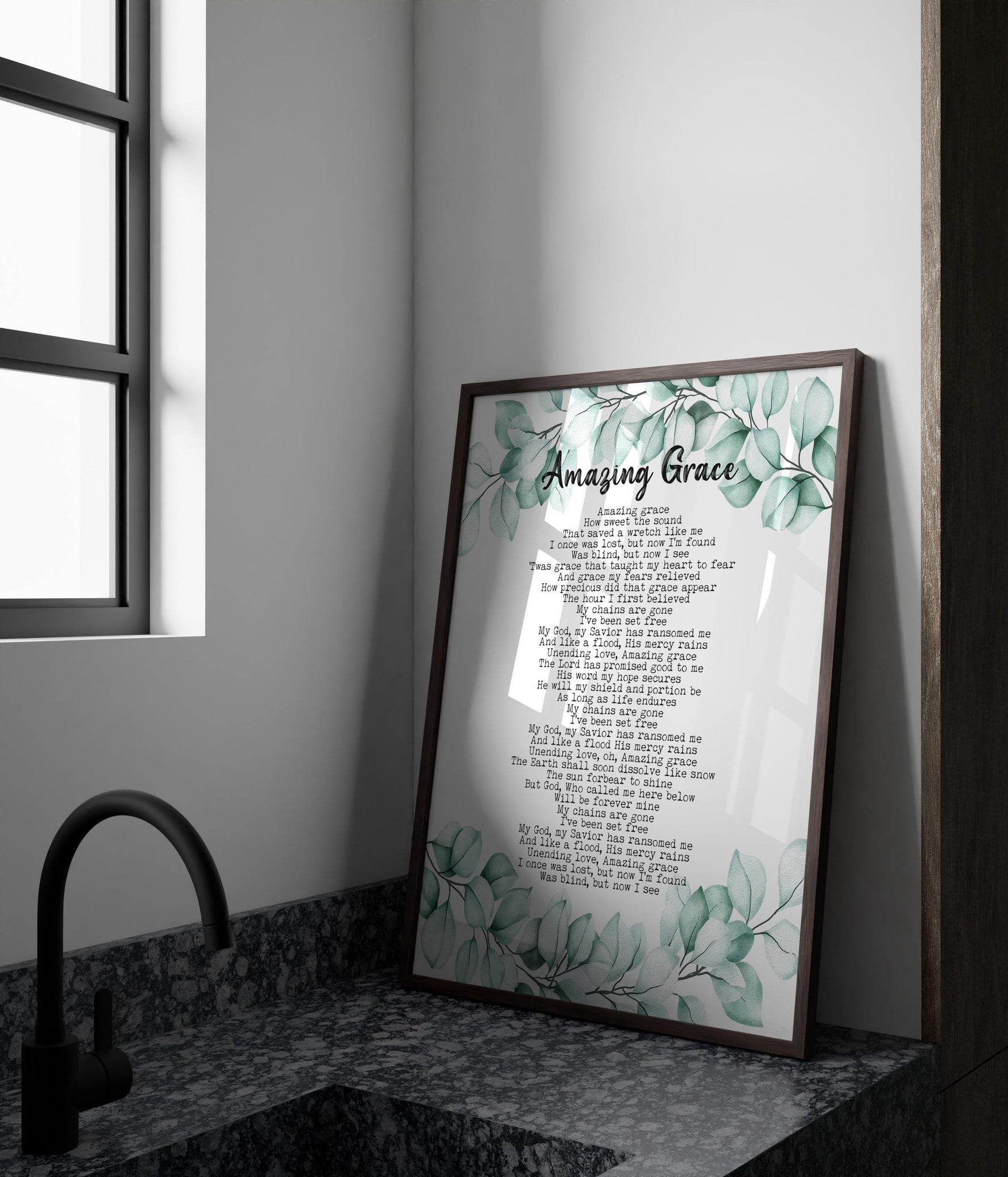 Bring timeless beauty and inspiration into your home with this unframed, high-quality art print featuring the beloved hymn “Amazing Grace.” The lyrics are elegantly displayed on a soft watercolor eucalyptus background, creating a design that feels both calming and uplifting.