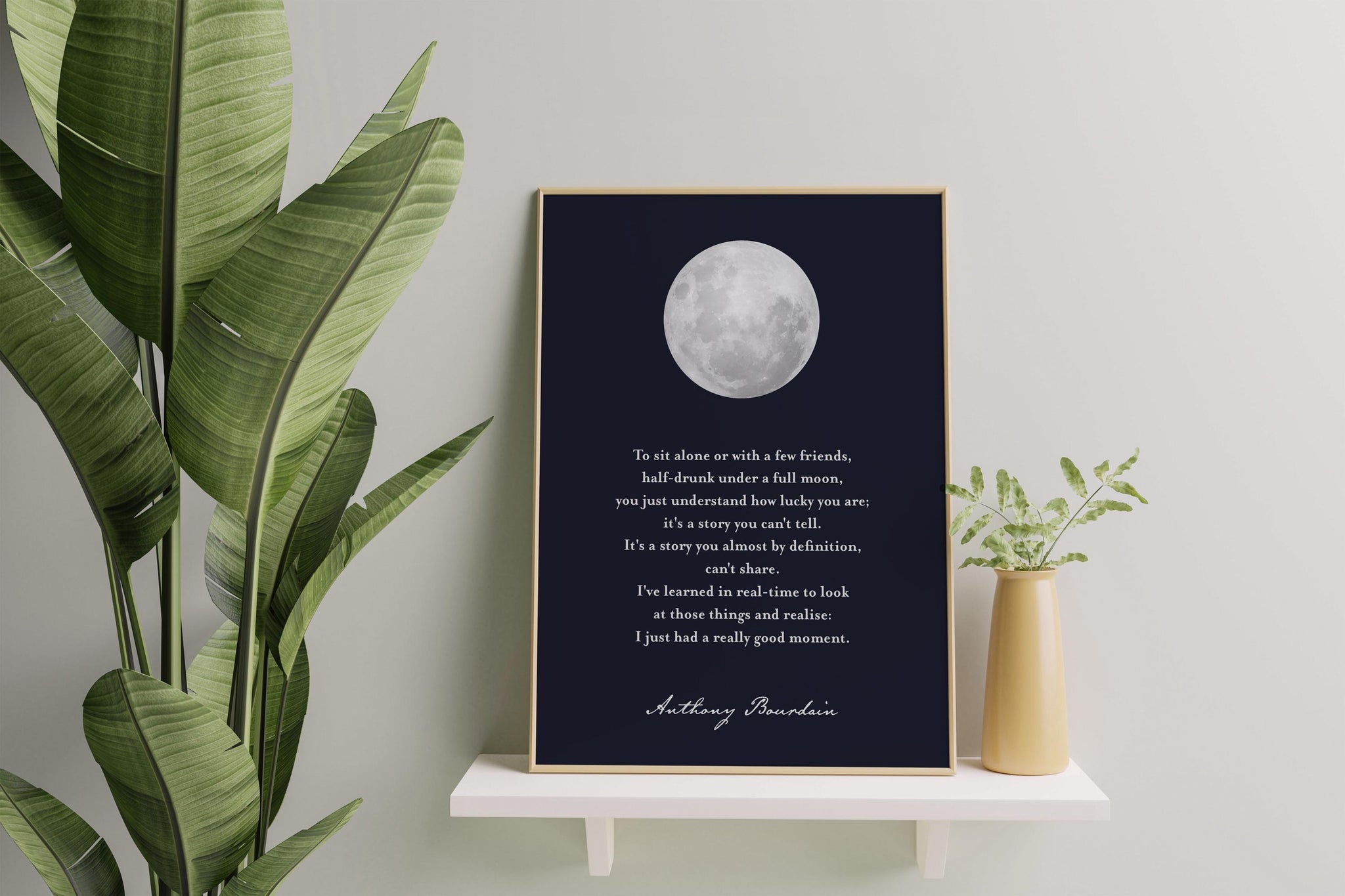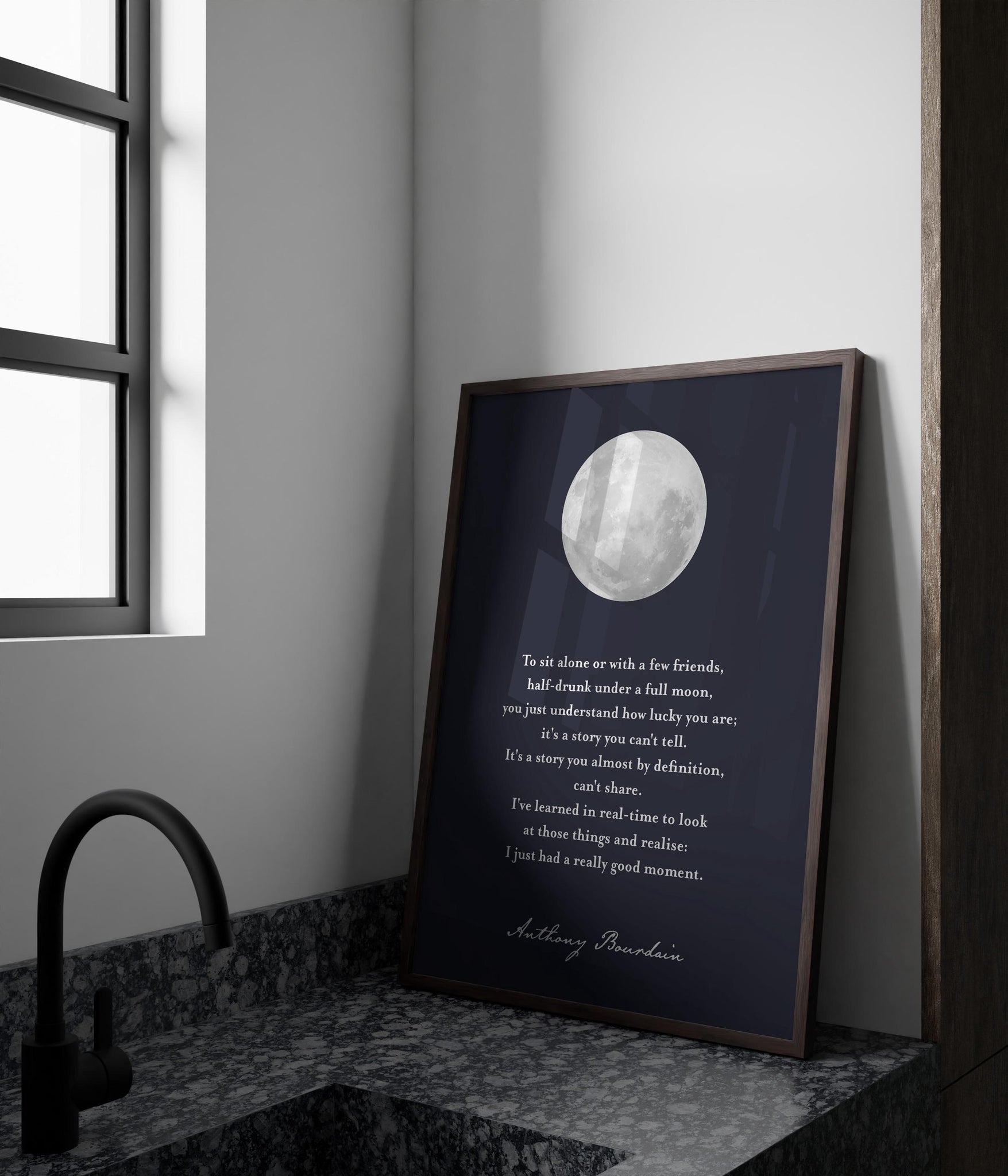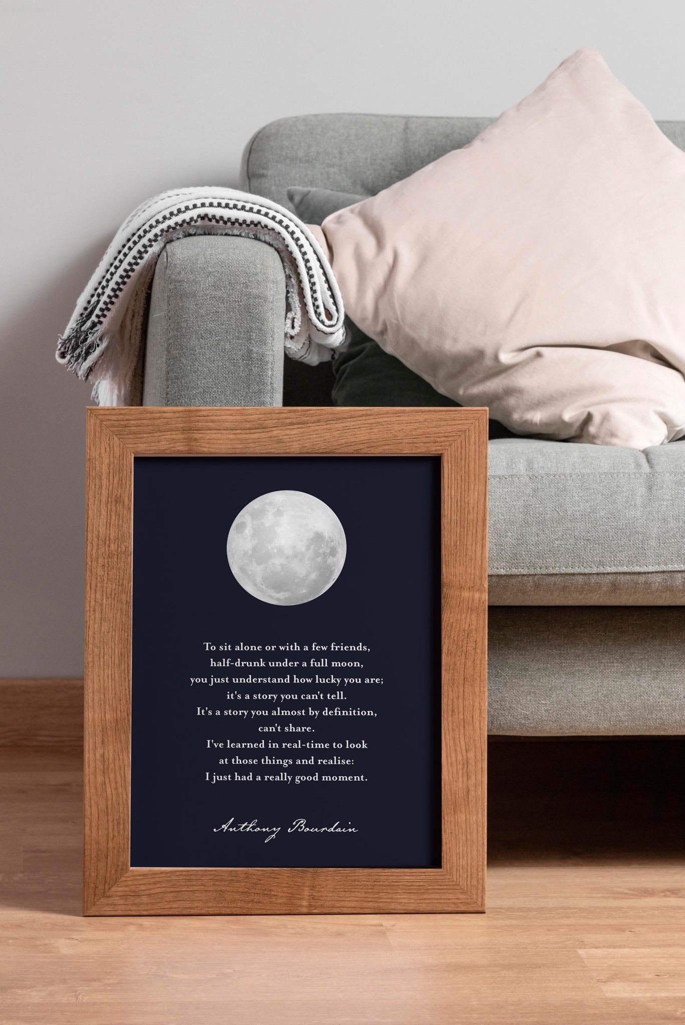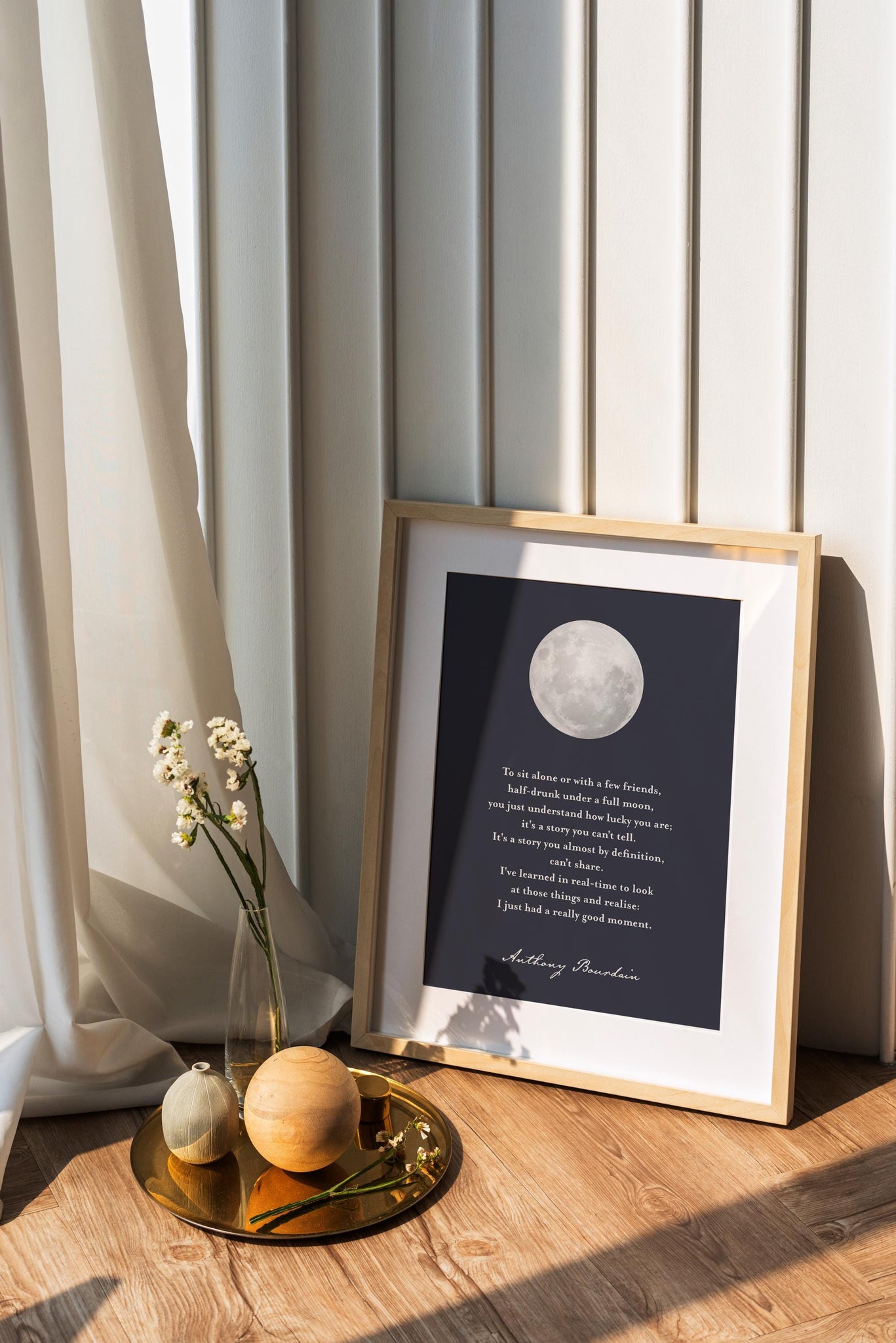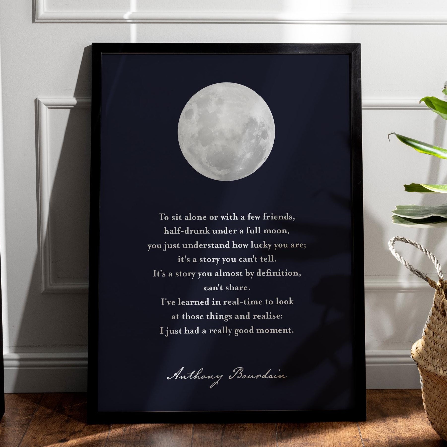 Capture the essence of life’s quiet yet profound moments with this striking Anthony Bourdain quote print. Featuring his reflective words on gratitude, presence, and the beauty of shared (or unshared) experiences, this design is set against a deep navy background with a luminous full moon, creating a mood of nostalgia and contemplation.