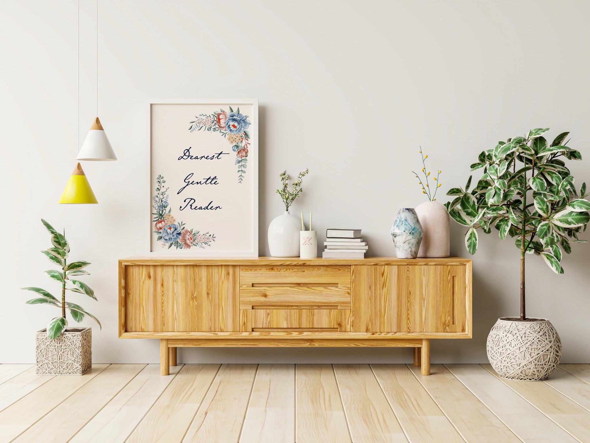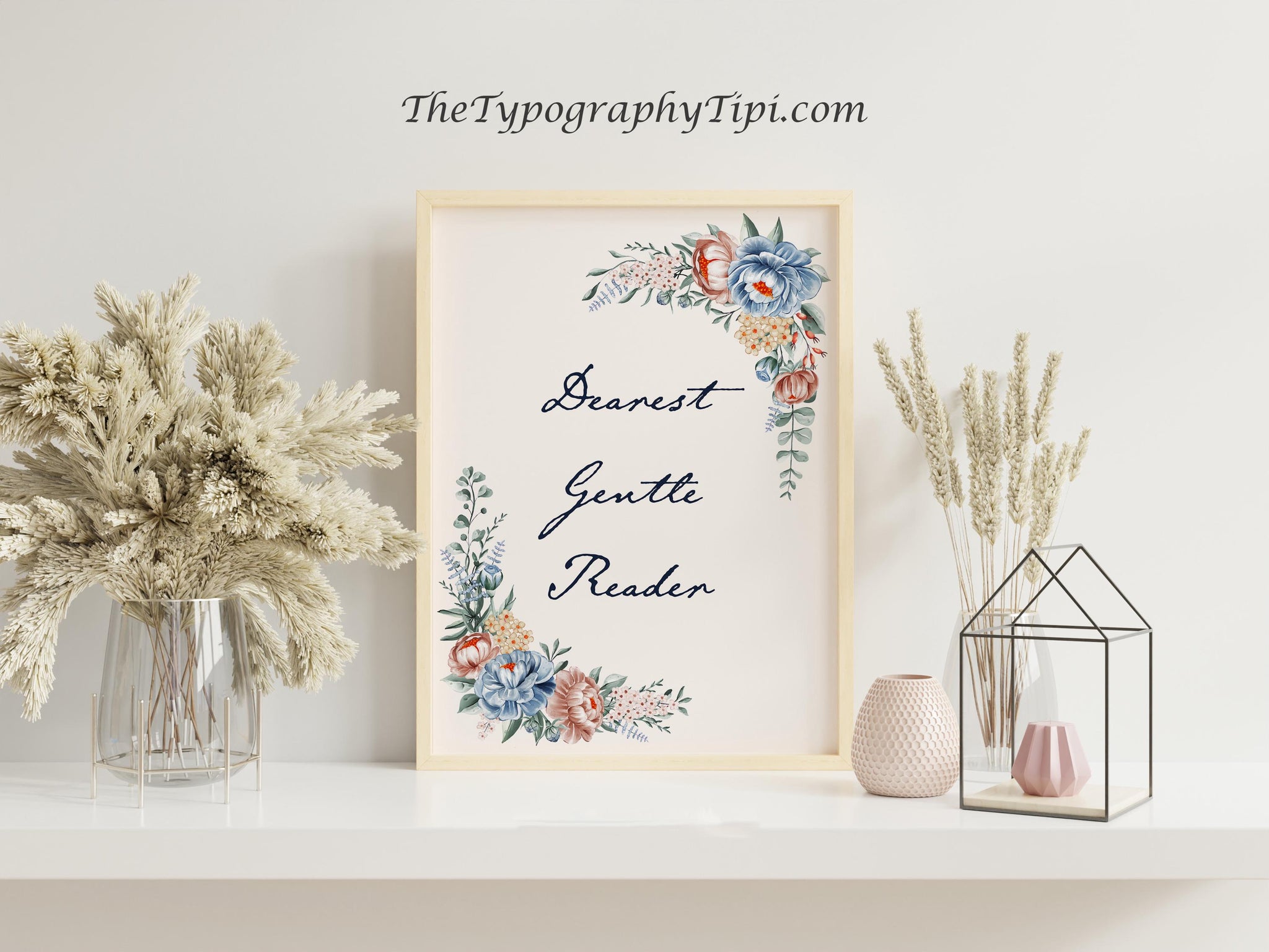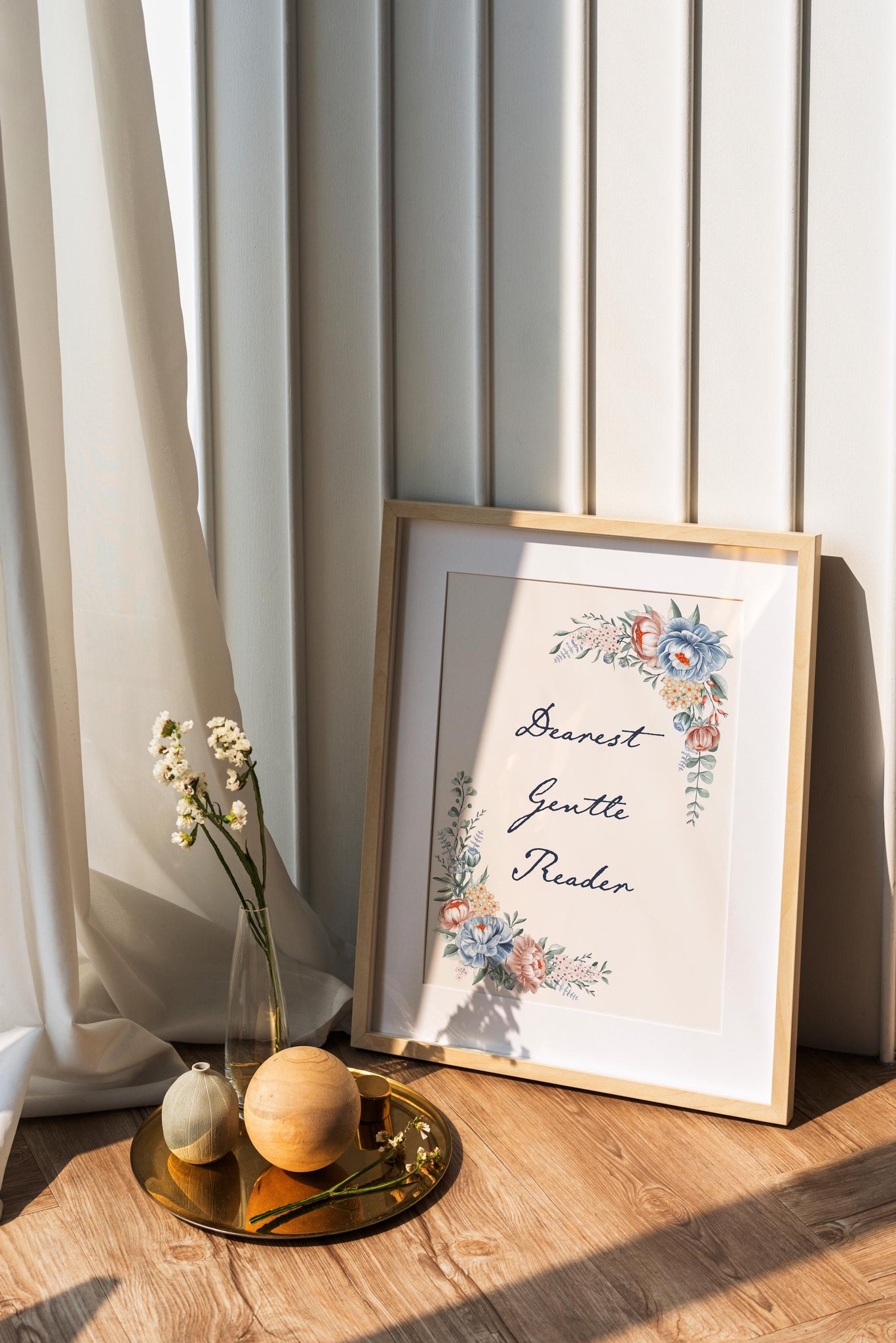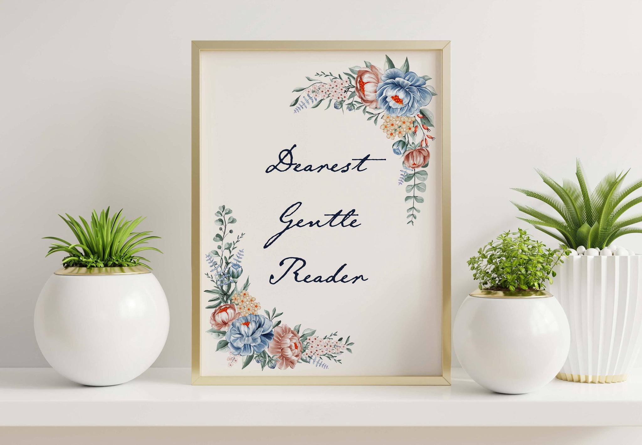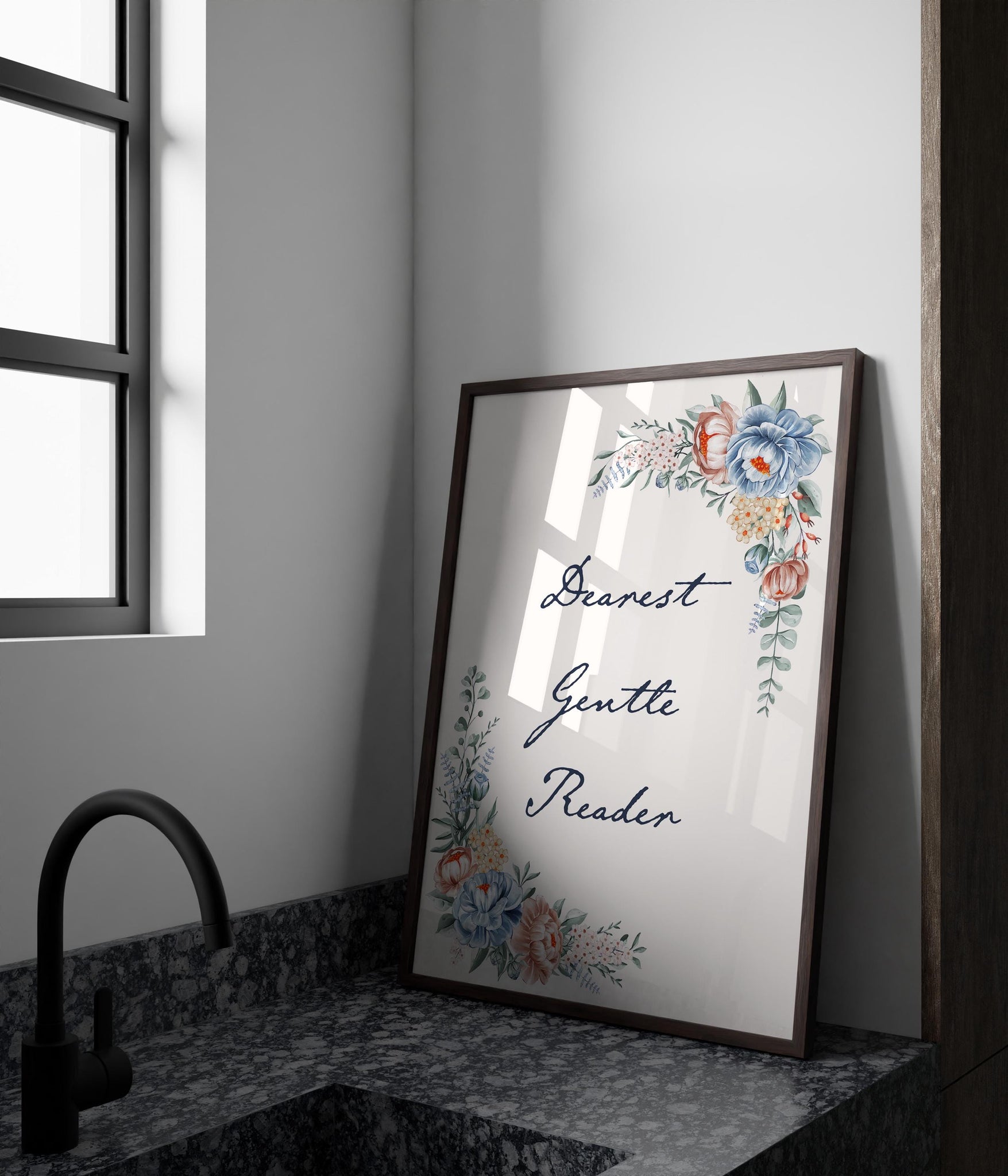 The design features soft, vintage-style botanical illustrations surrounding the phrase “Dearest Gentle Reader,” creating a timeless piece that feels both literary and romantic. The gentle color palette, warm off white background, and flowing typography in a dark navy bring a sense of sophistication and warmth, making it a beautiful addition to spaces inspired by Regency aesthetics, cottagecore style, and vintage decor.