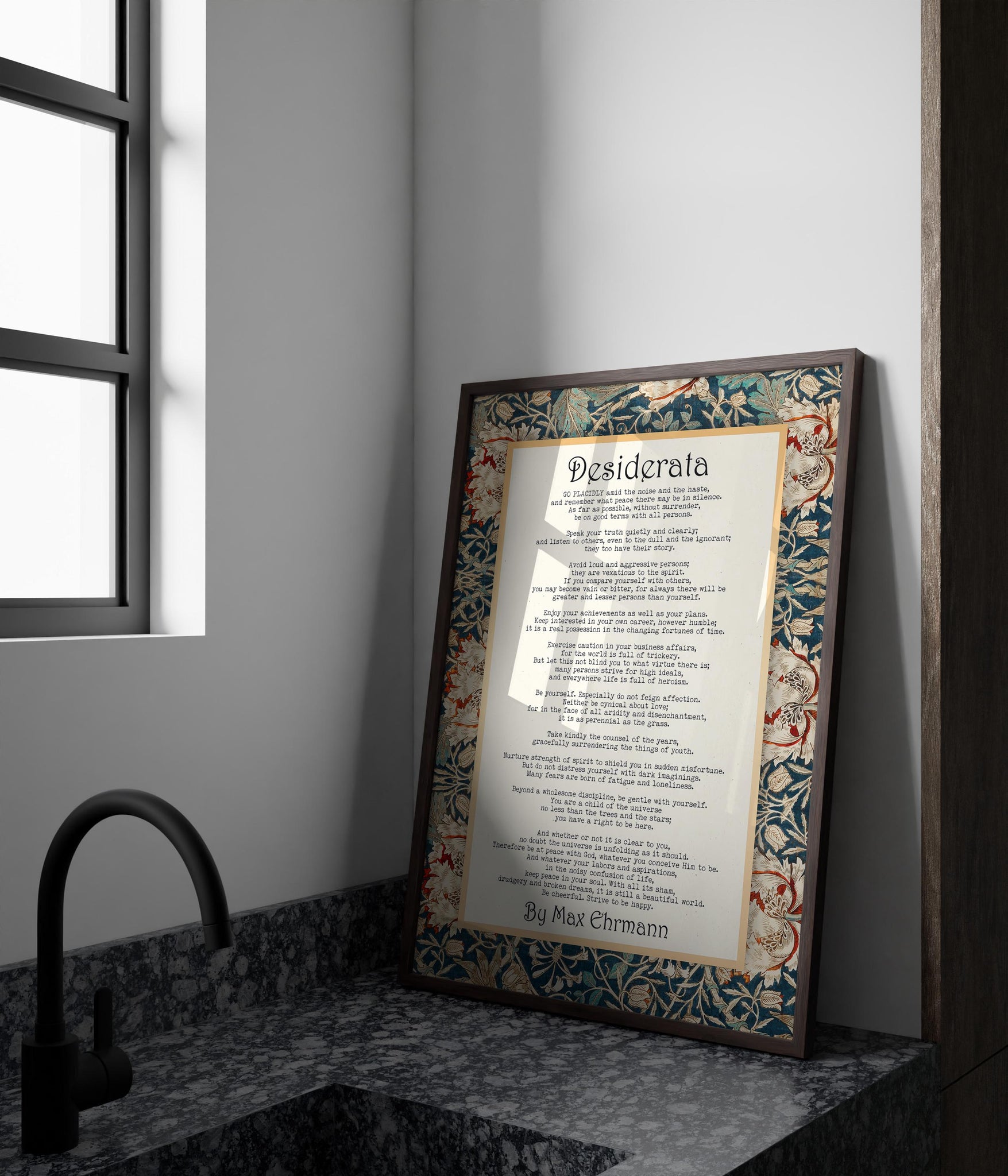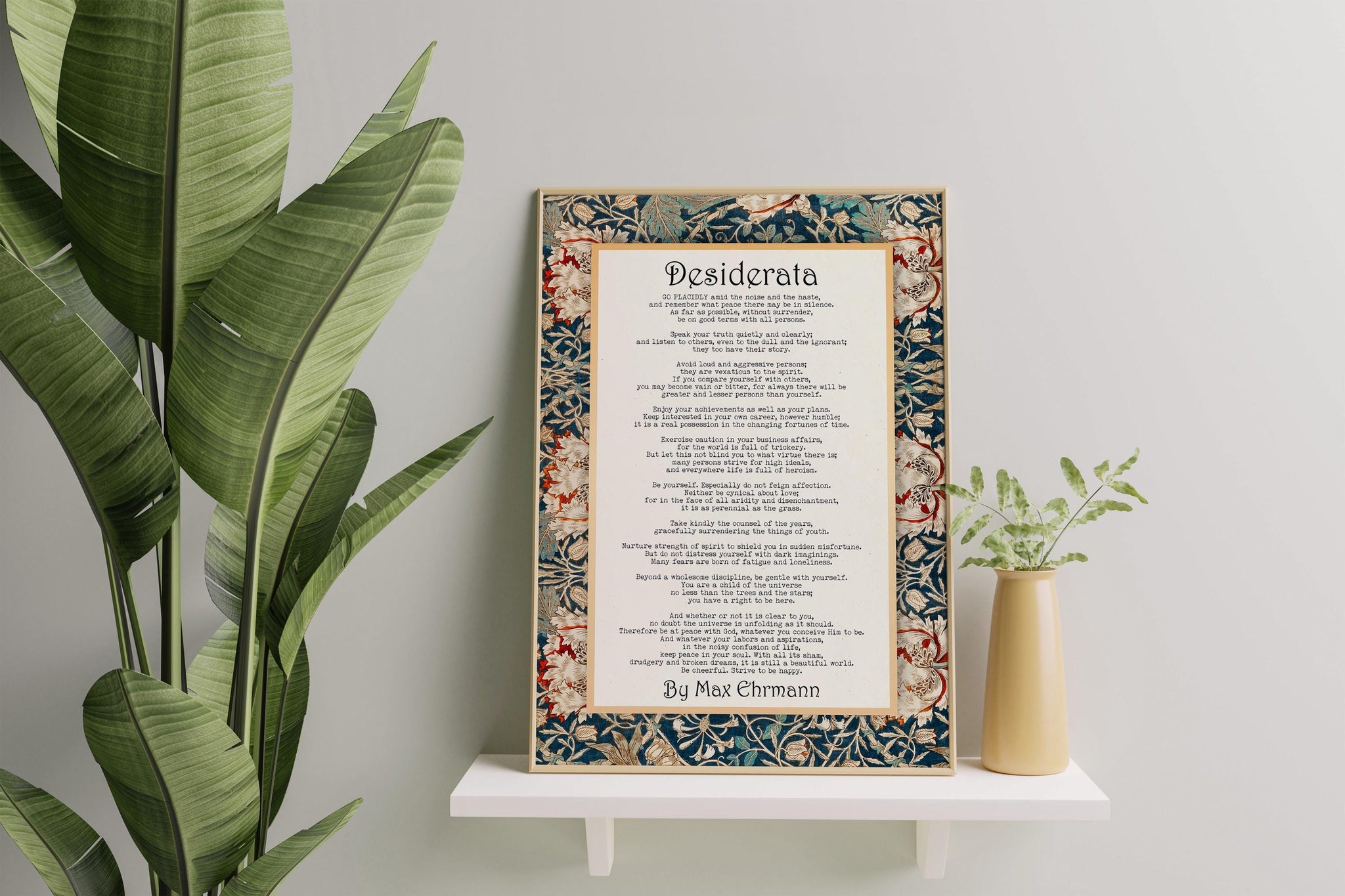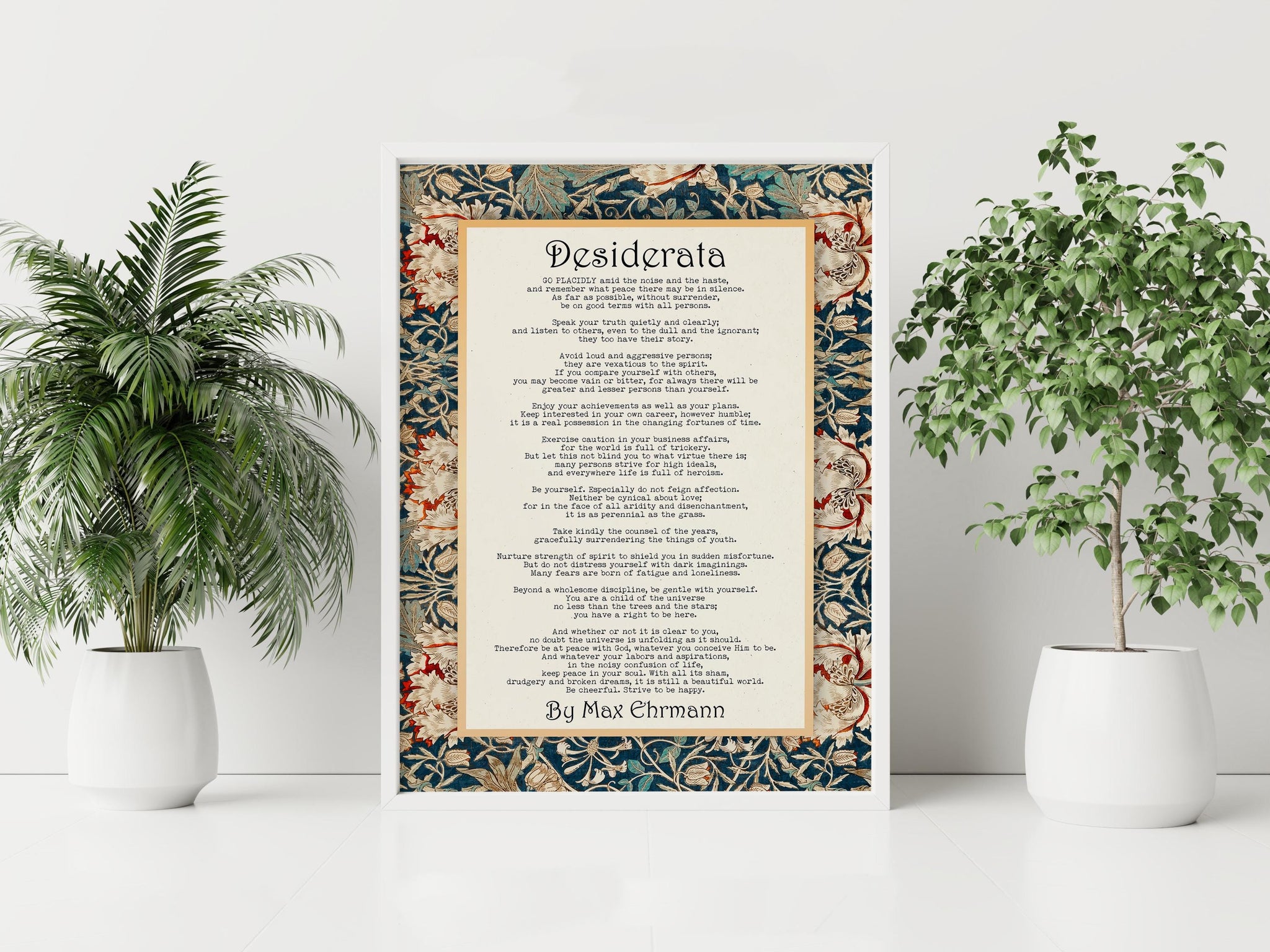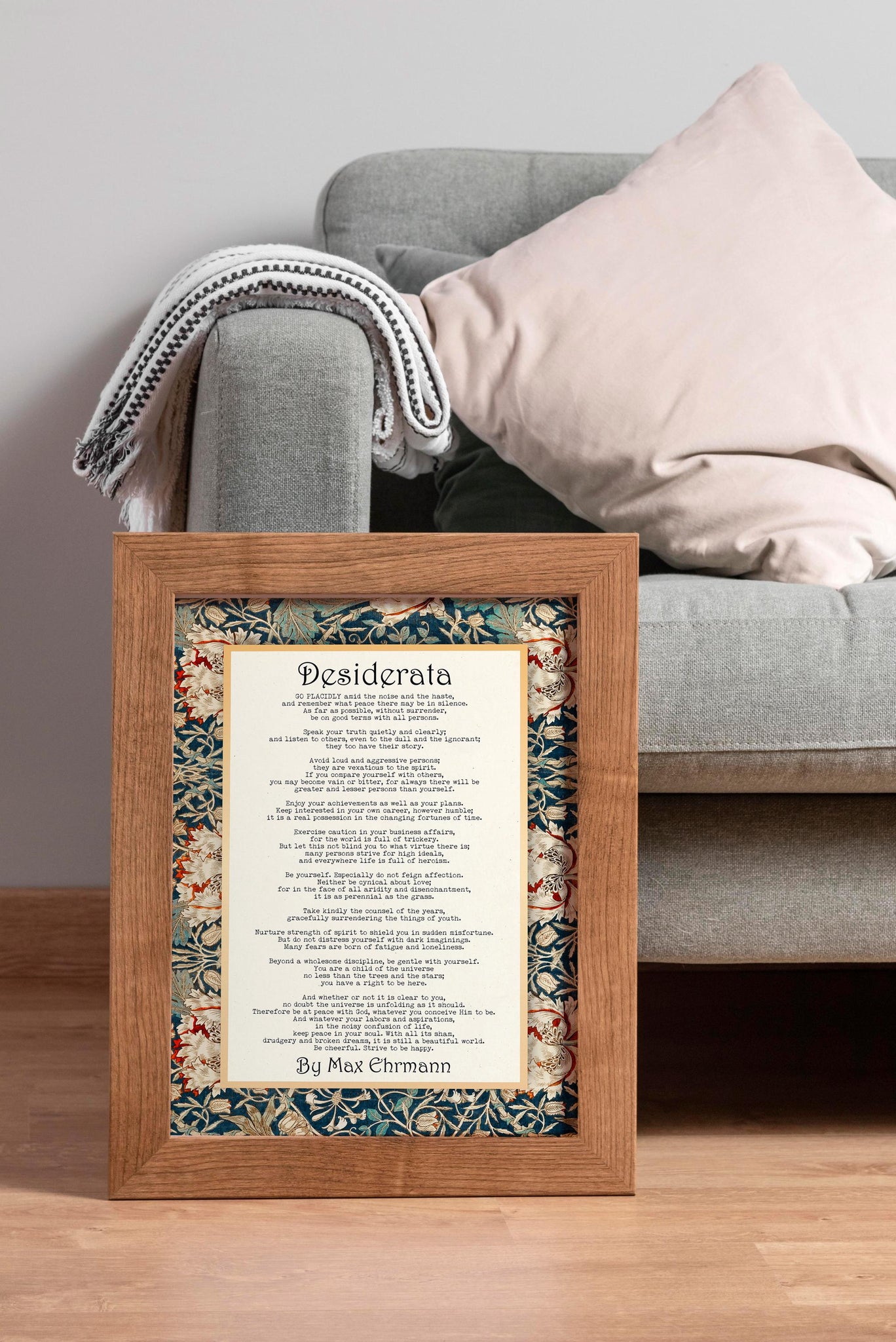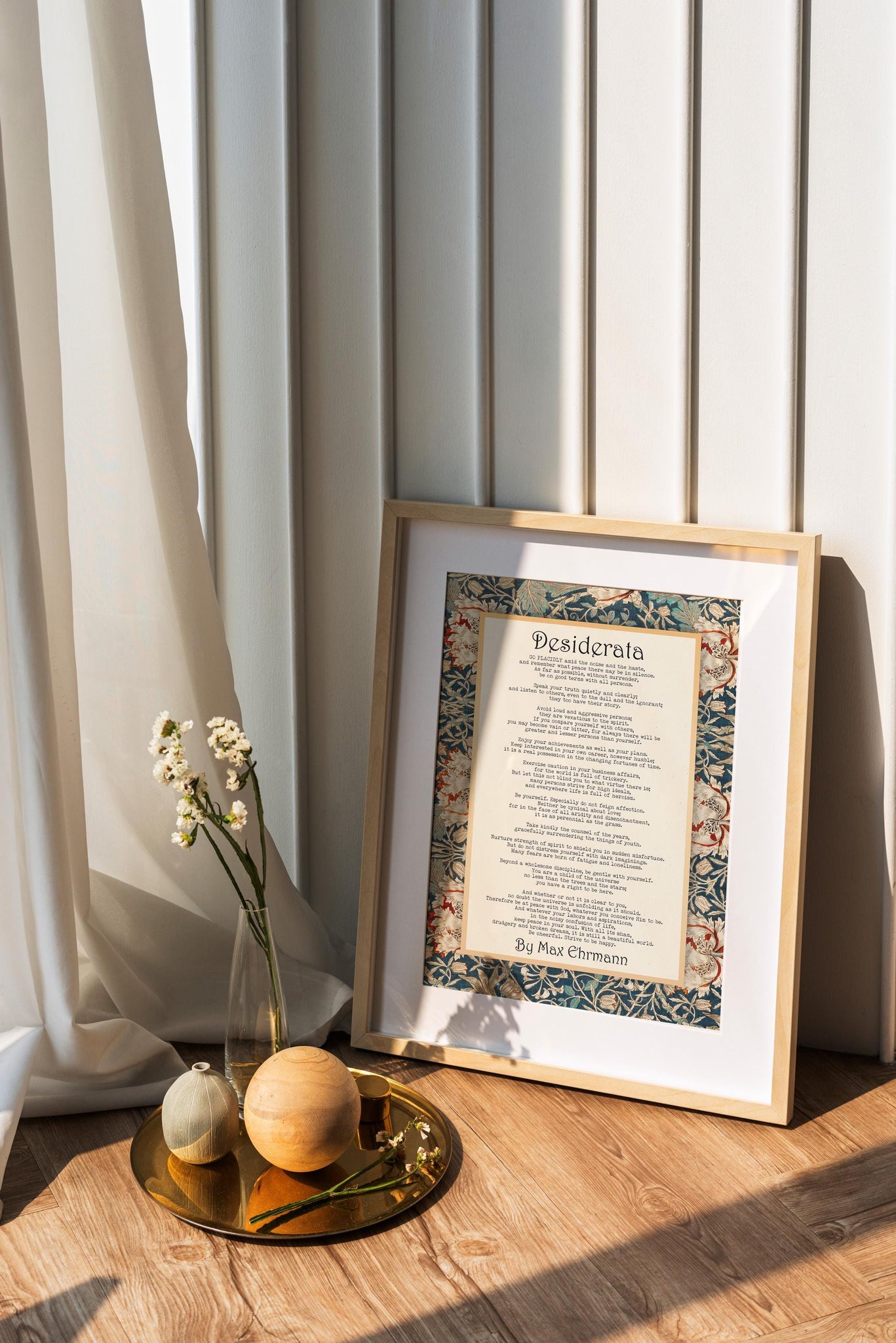 Bring timeless wisdom and beauty to your space with this Desiderata poem print, featuring Max Ehrmann’s inspiring words set against an elegant William Morris background. The vintage typewriter-style font enhances the nostalgic charm, making this a meaningful addition to any home or office.