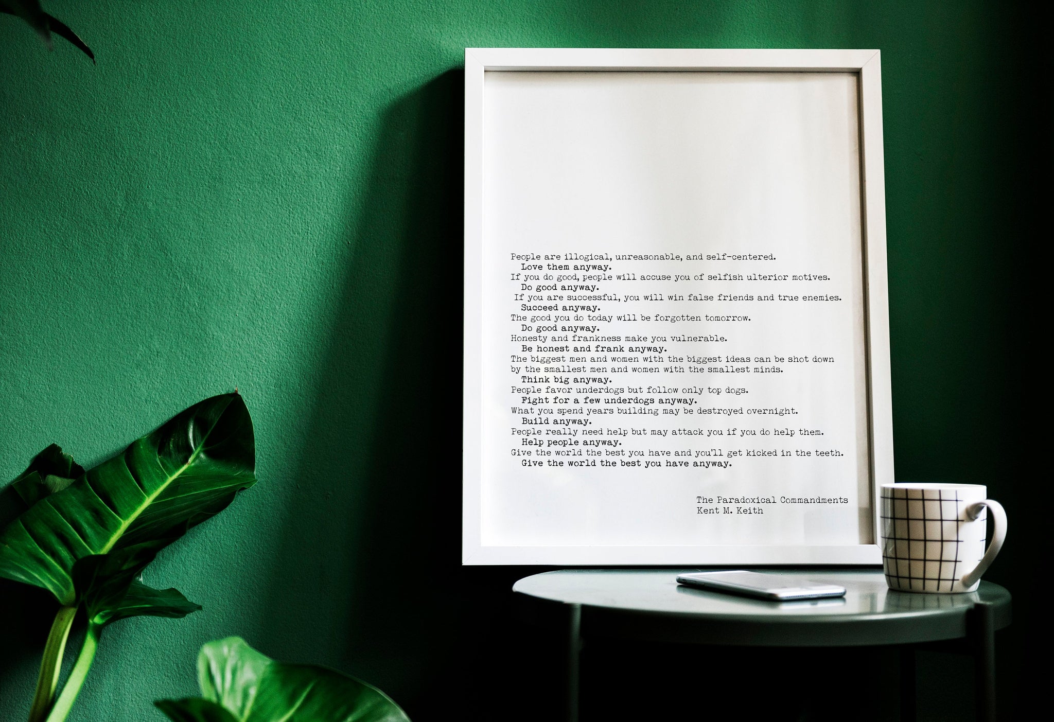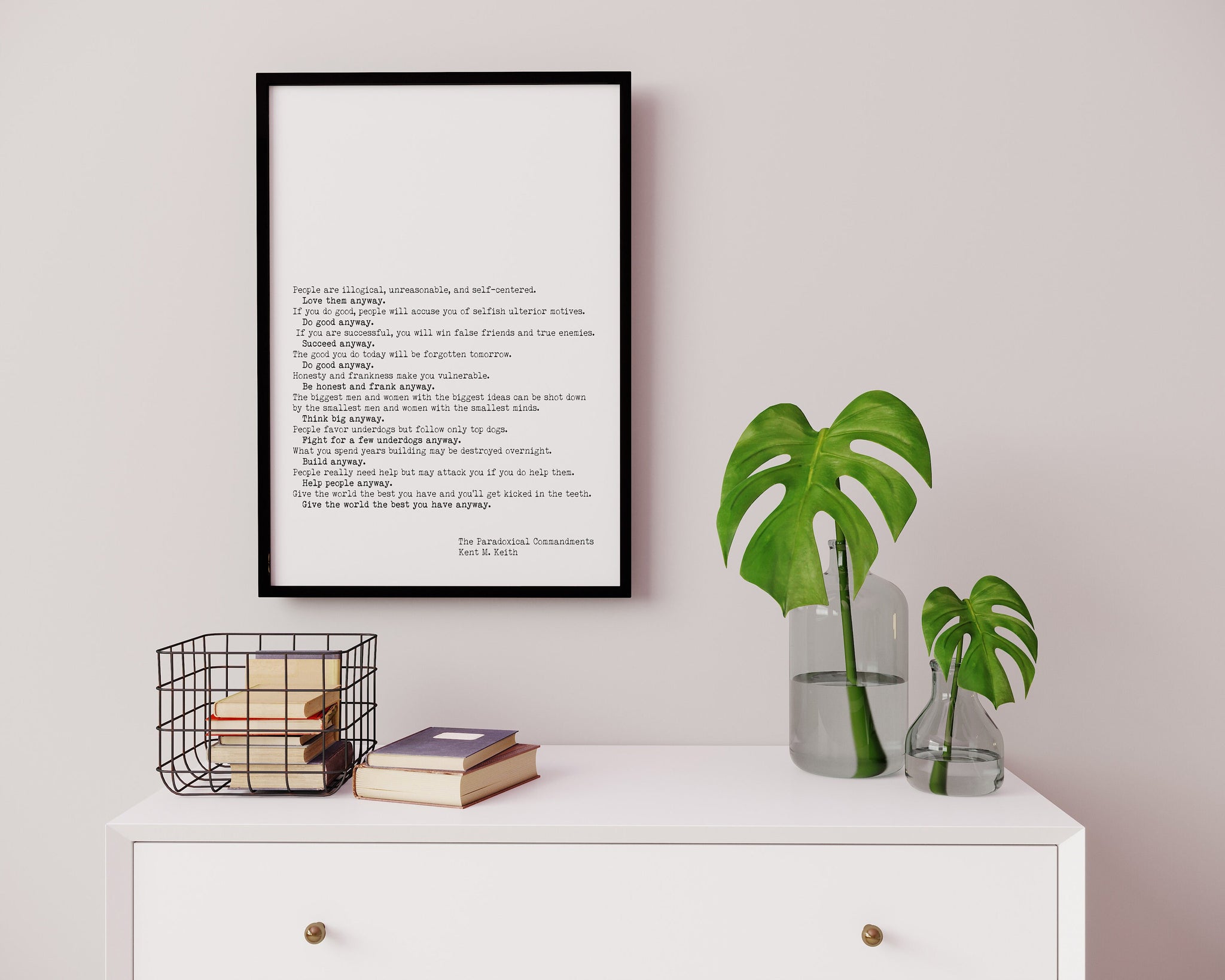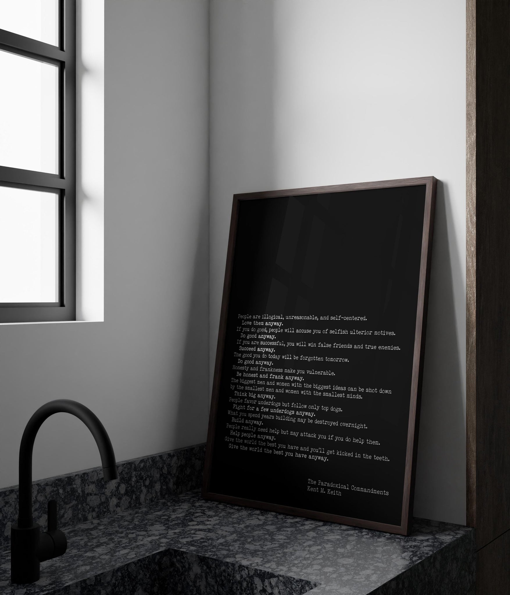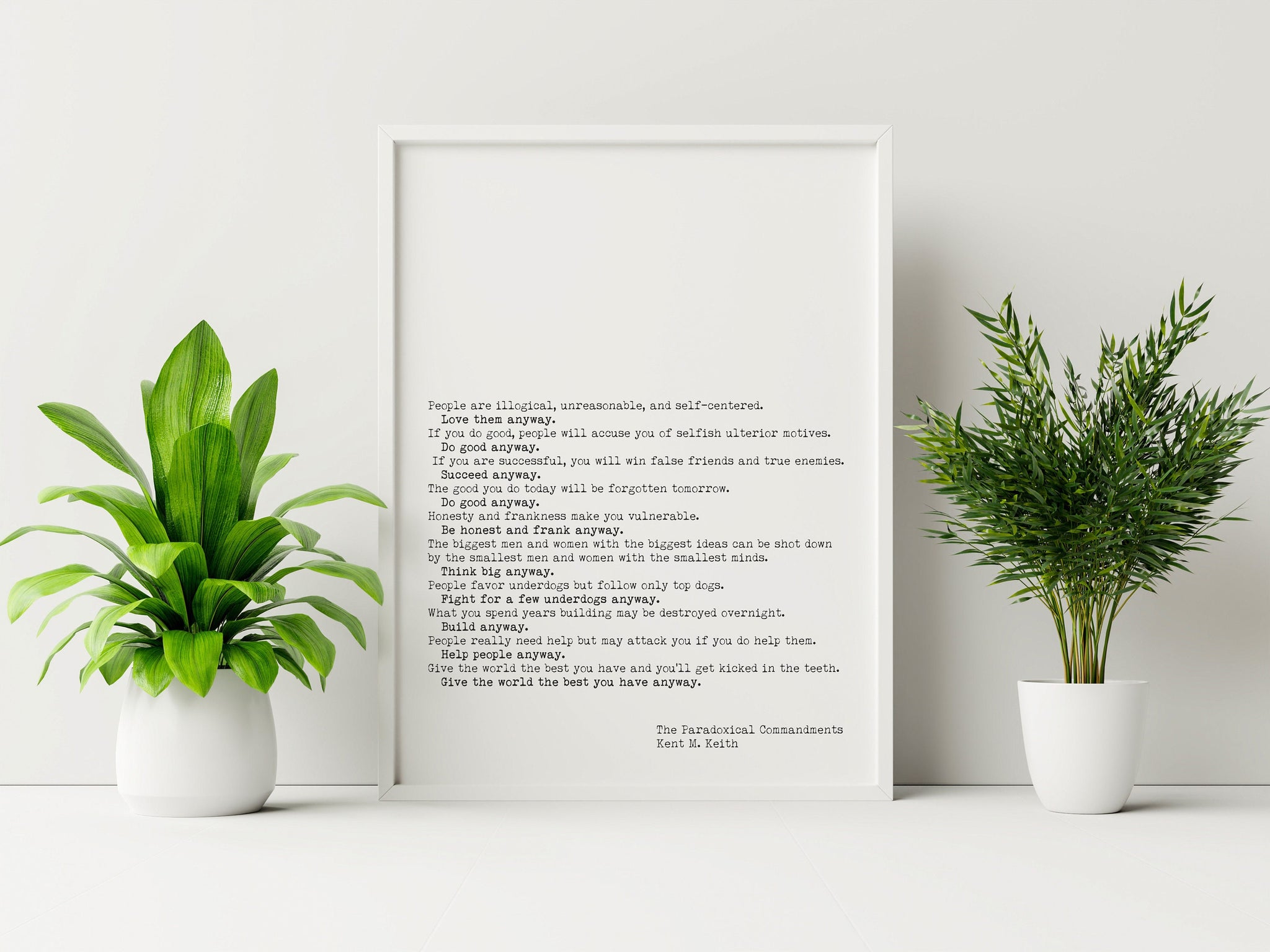 Bring wisdom and resilience into your space with this timeless art print featuring Kent M. Keith’s “The Paradoxical Commandments,” often known by its famous refrain: “Do it anyway.”