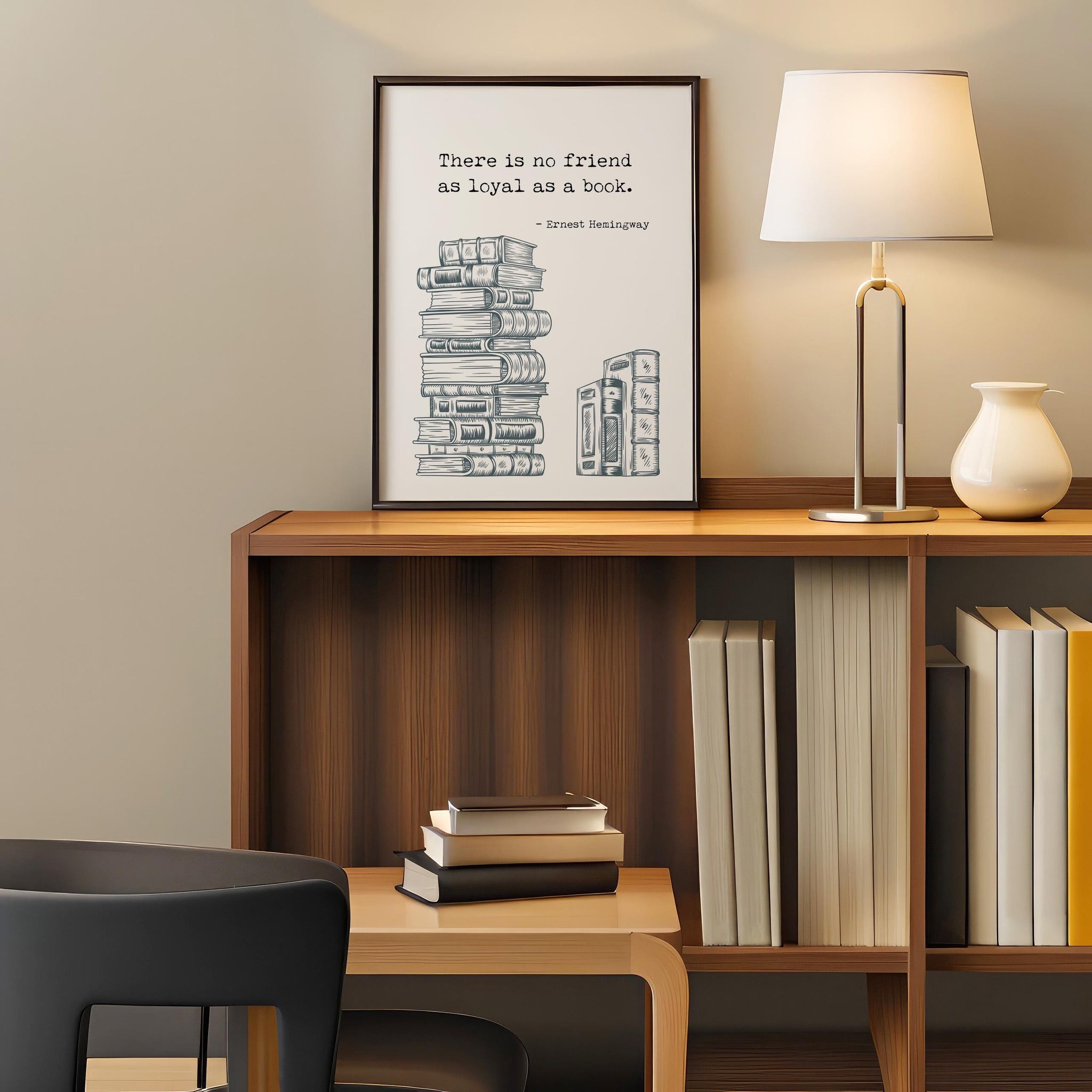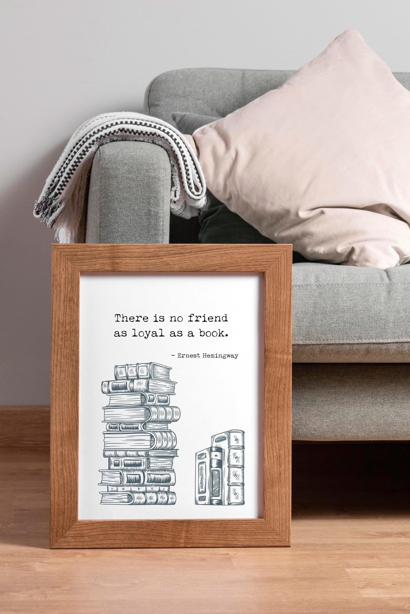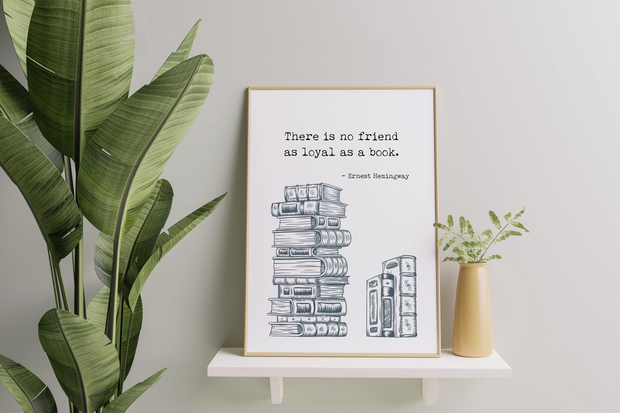 This elegant literary art print features a classic quote from Ernest Hemingway, celebrating the unwavering companionship of books. Designed with a vintage-style book stack illustration in soft blue against a crisp white background, this print brings a timeless and literary charm to any space.