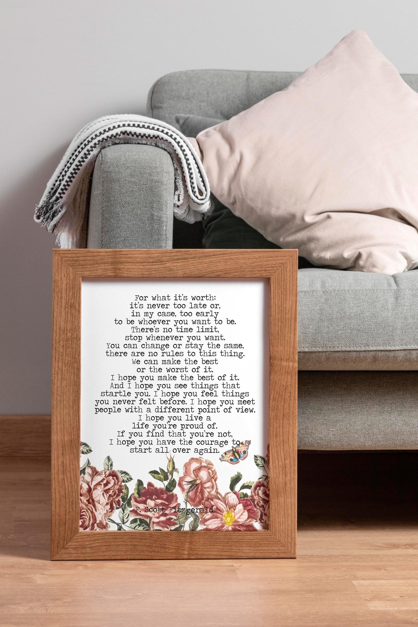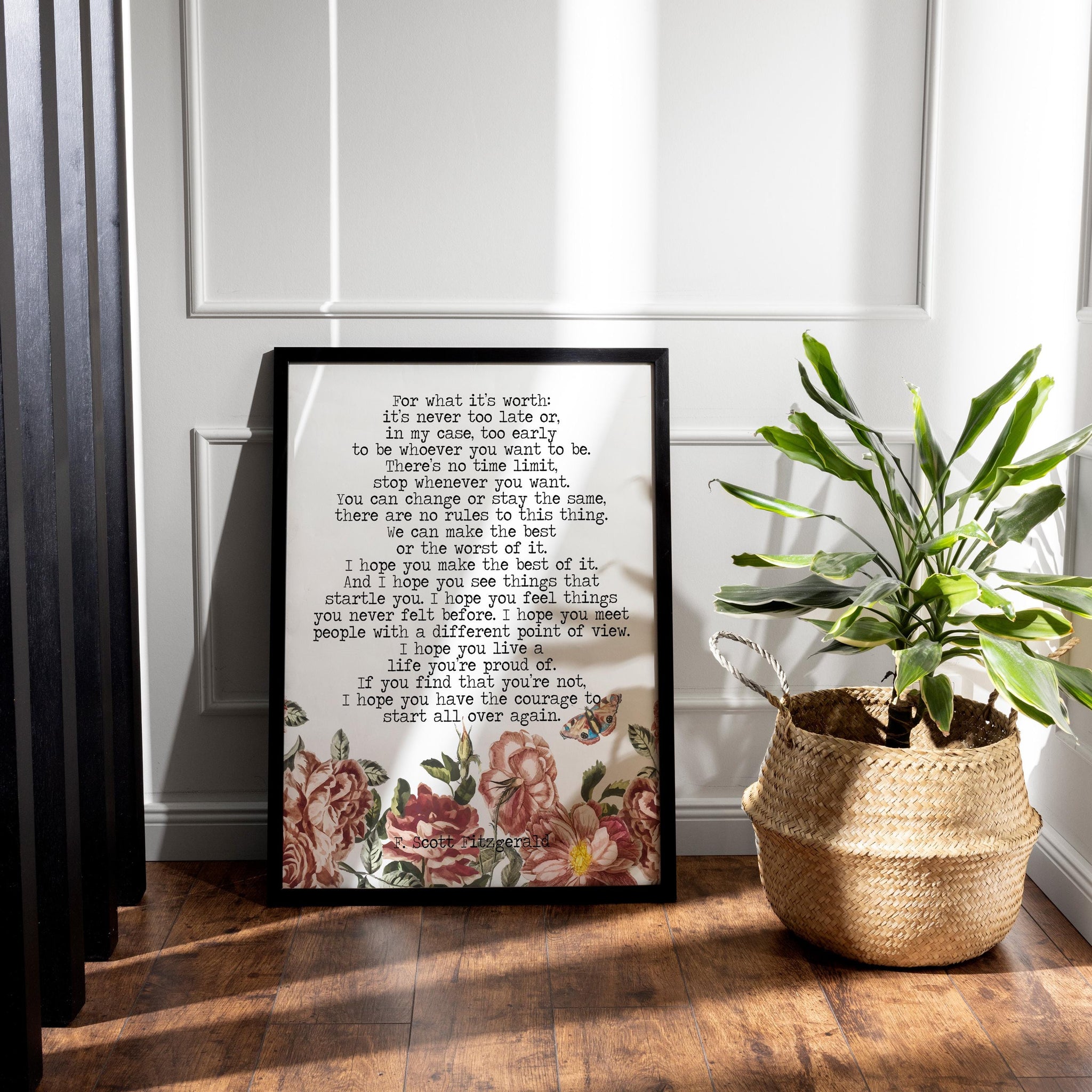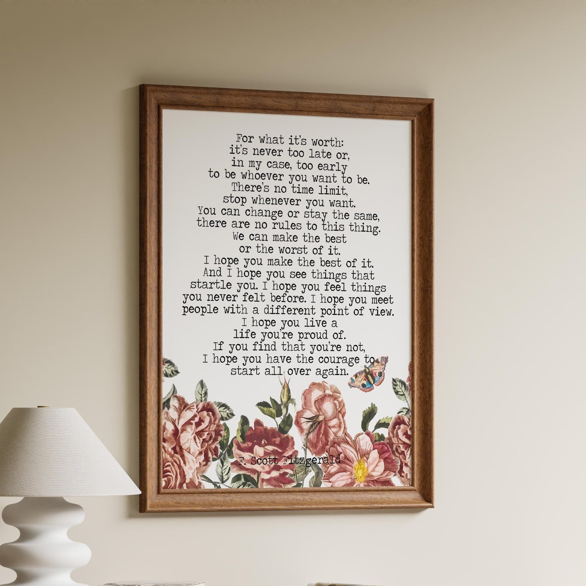 Celebrate fresh starts and fearless reinvention with this timeless F. Scott Fitzgerald quote wall art print, featuring the beloved words: “For what it’s worth: it’s never too late… to be whoever you want to be.” Blending classic literary charm with soft vintage florals, this inspirational quote print brings encouragement and elegance to any space.