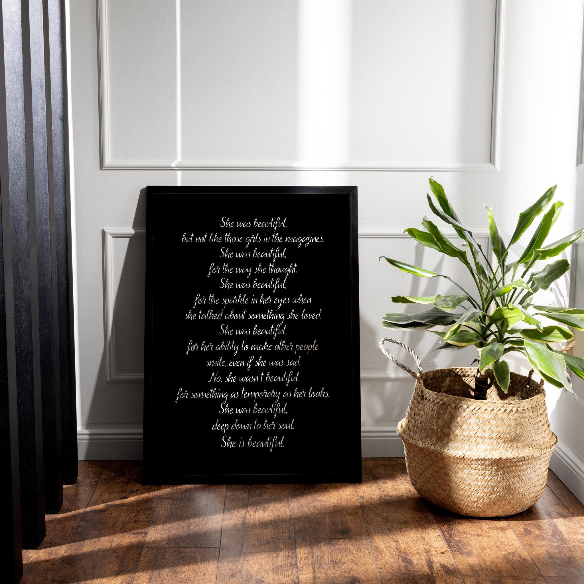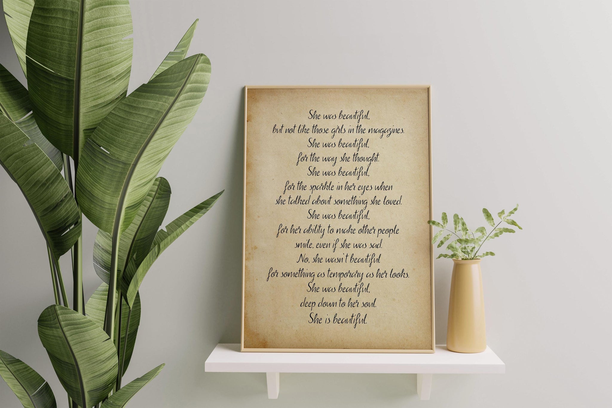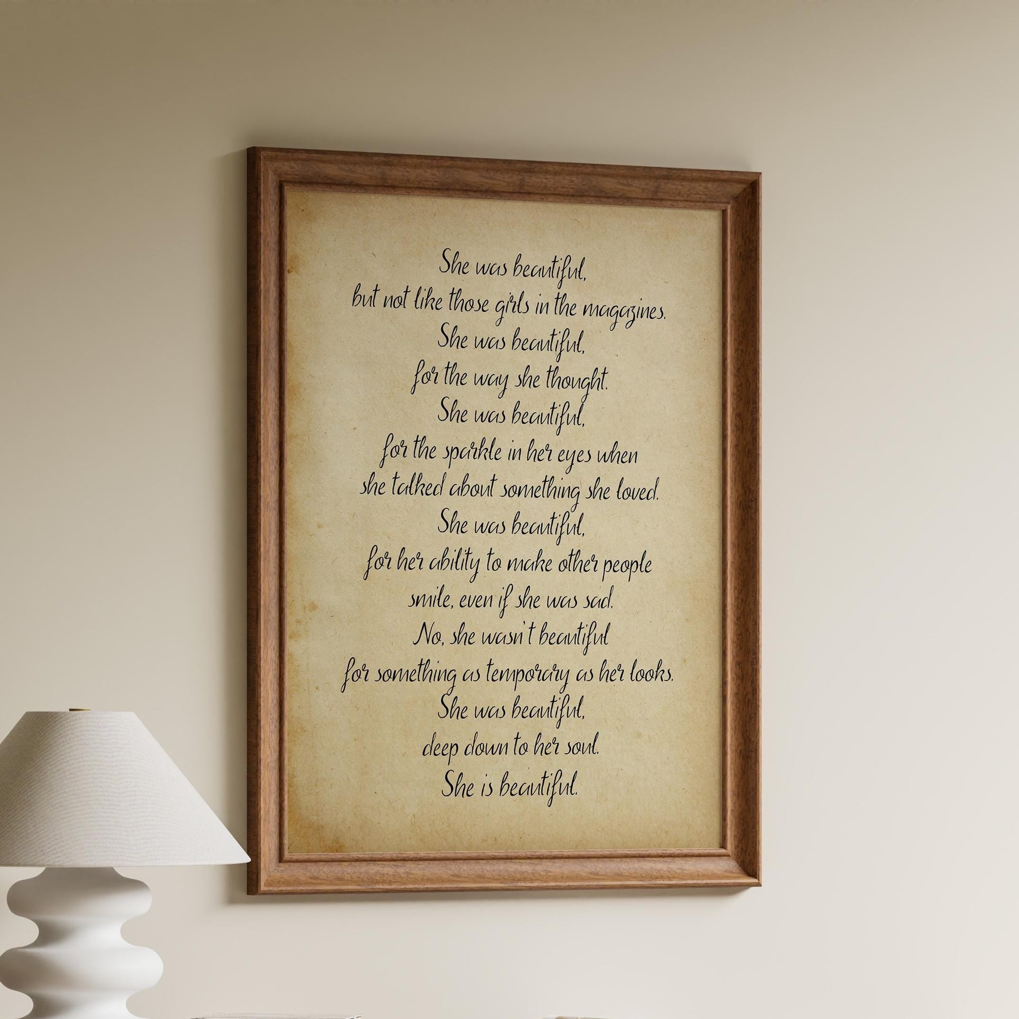 The design features an antique, parchment-like background that complements the timeless, soulful message of the quote, bringing a sense of warmth and nostalgia to your walls. It is also available in black and white, ensuring that it will fit well with any design style. With its graceful words and classic typography, this print celebrates beauty that goes beyond appearances and showcases the profound impact of a kind, thoughtful soul.