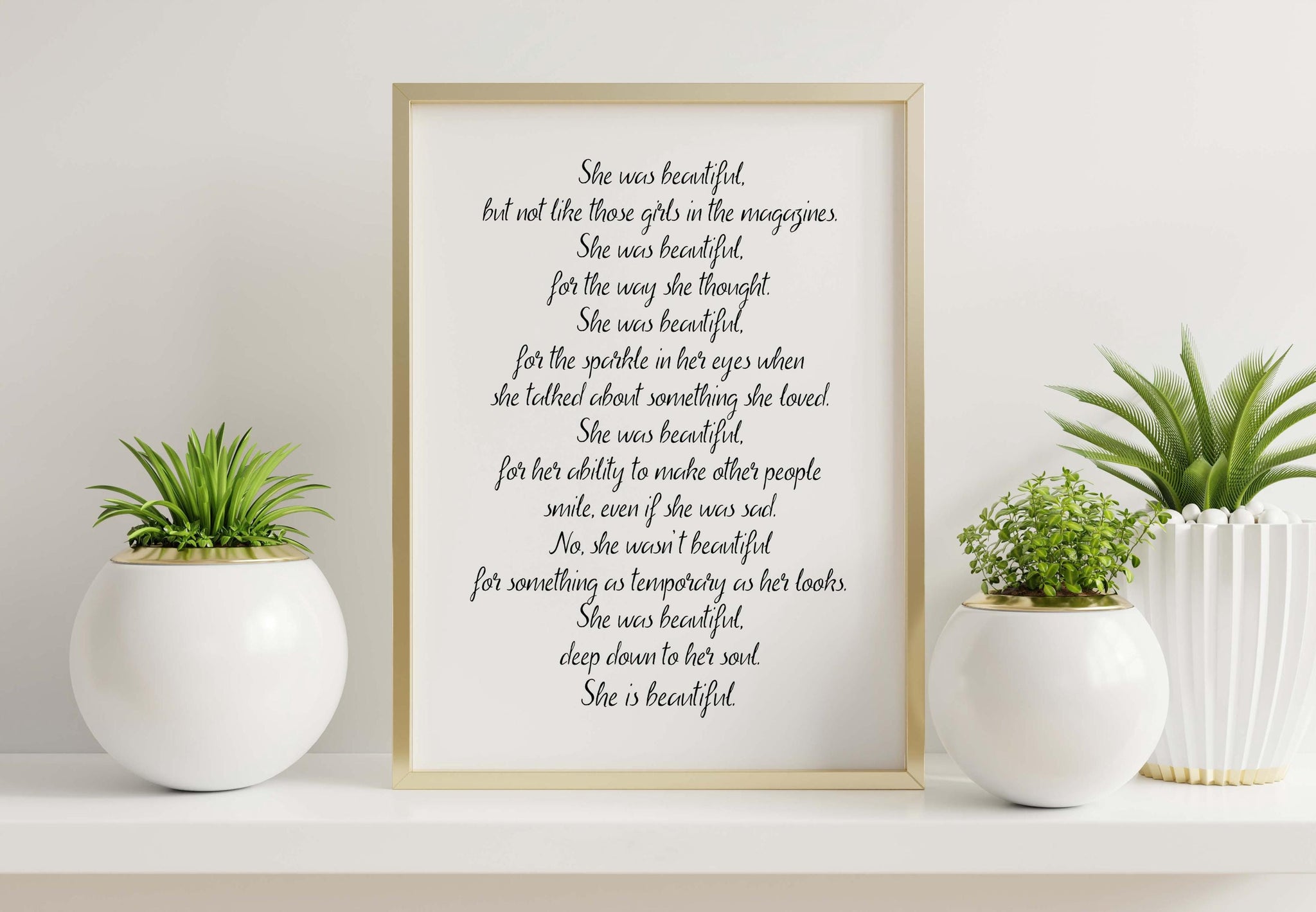 This poignant quote by F. Scott Fitzgerald captures the essence of true beauty—"She was beautiful, for the way she thought, for the sparkle in her eyes, for her ability to make others smile." Printed in elegant, flowing typography, this vintage-style literary quote art is a powerful tribute to inner beauty, wisdom, and the strength that lies in kindness and authenticity.