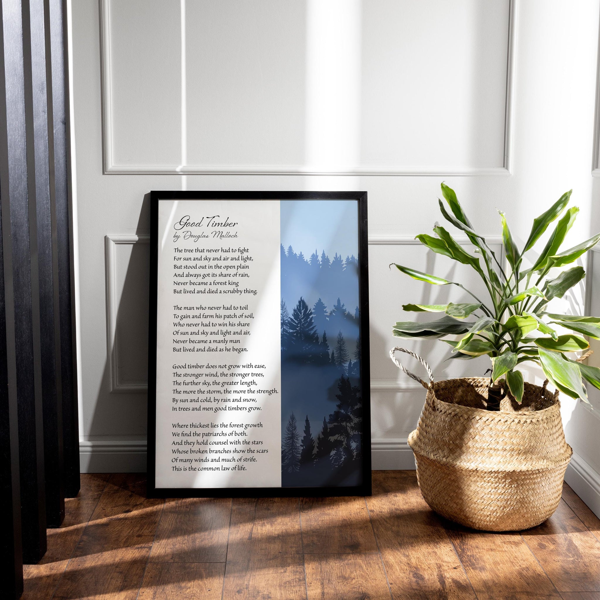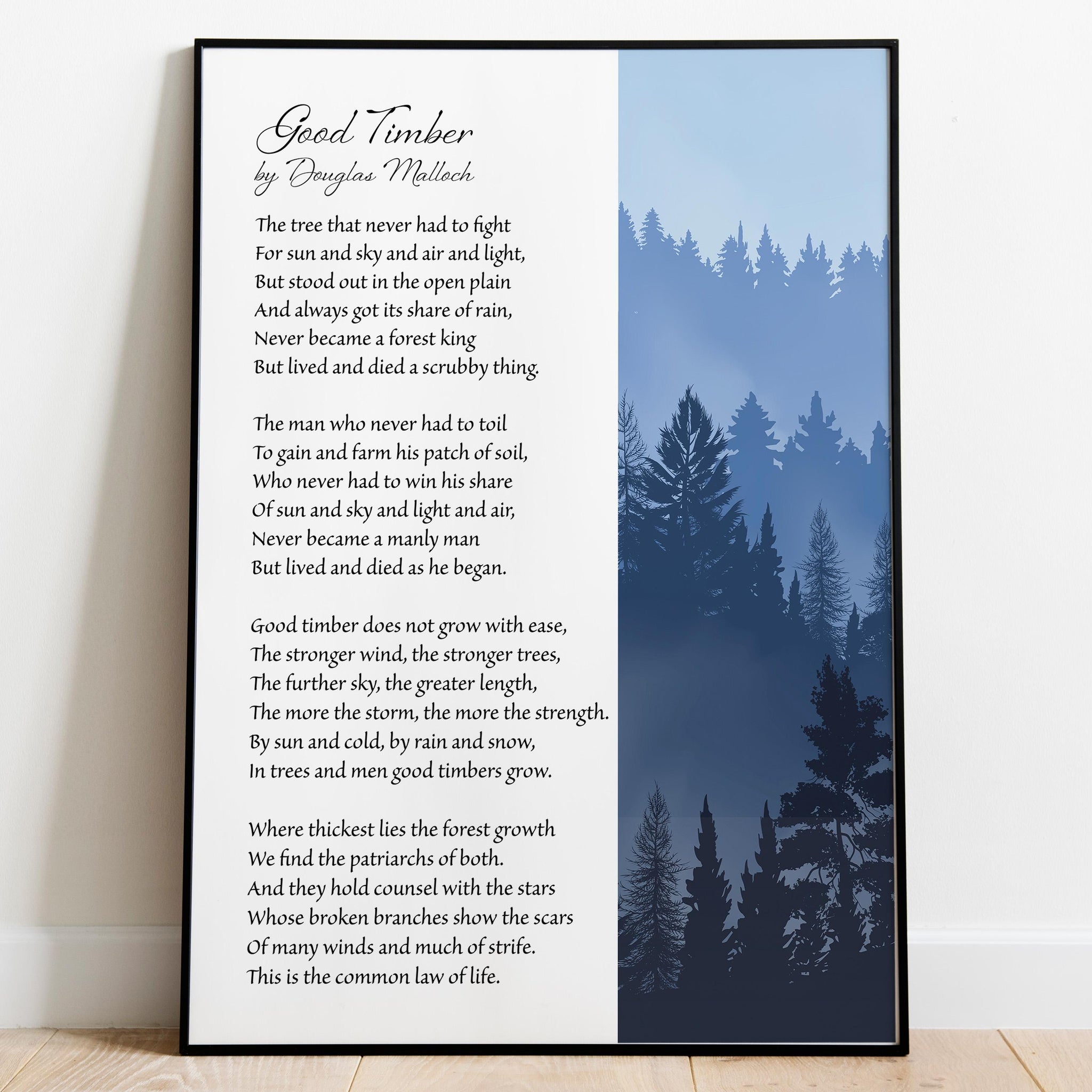 Malloch’s words compare the growth of strong timber to the growth of strong people, reminding us that endurance through adversity shapes true character. This inspirational poem print makes a meaningful addition to any home, office, or library, and is especially appreciated as a gift for those facing life transitions, challenges, or personal milestones.