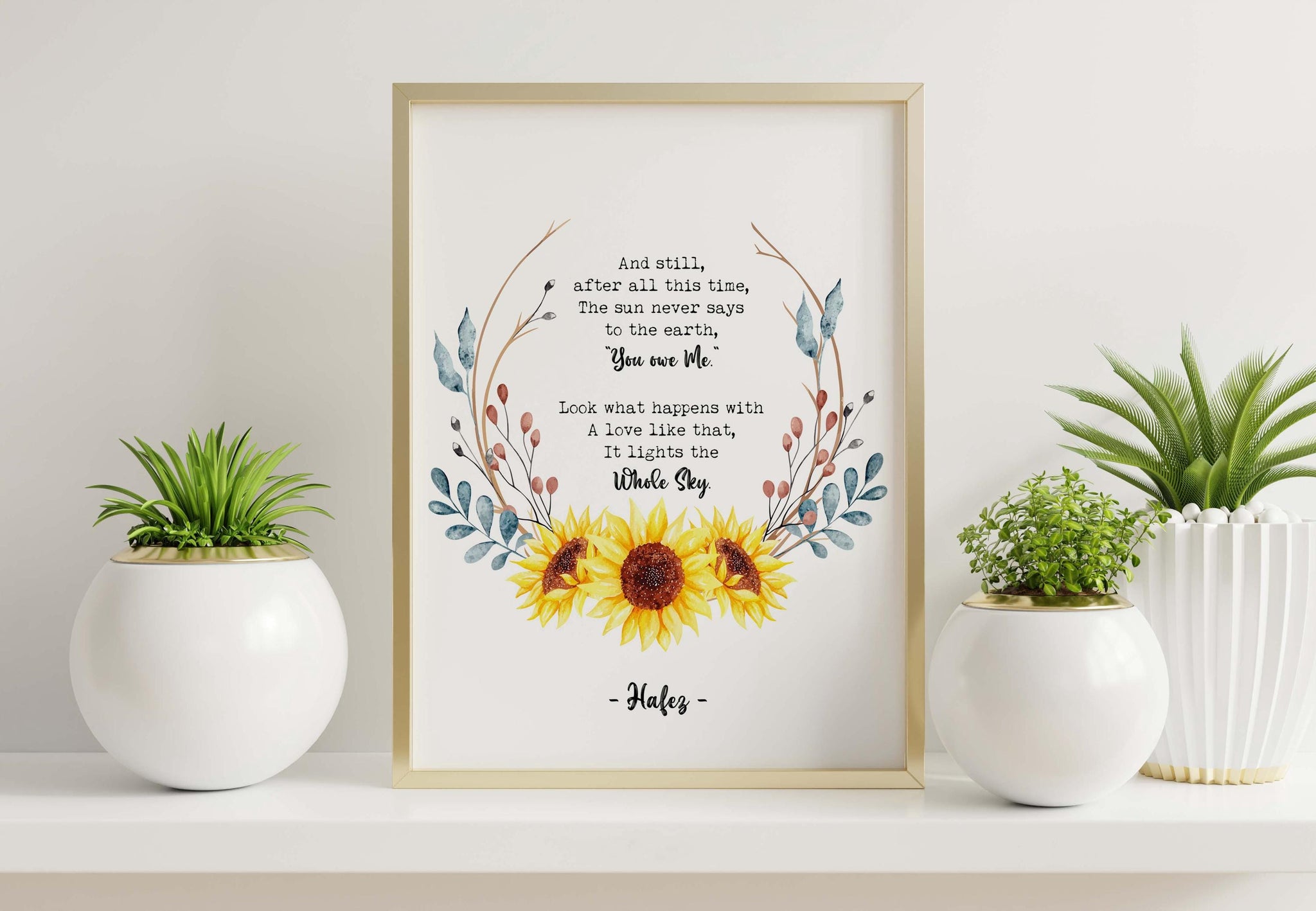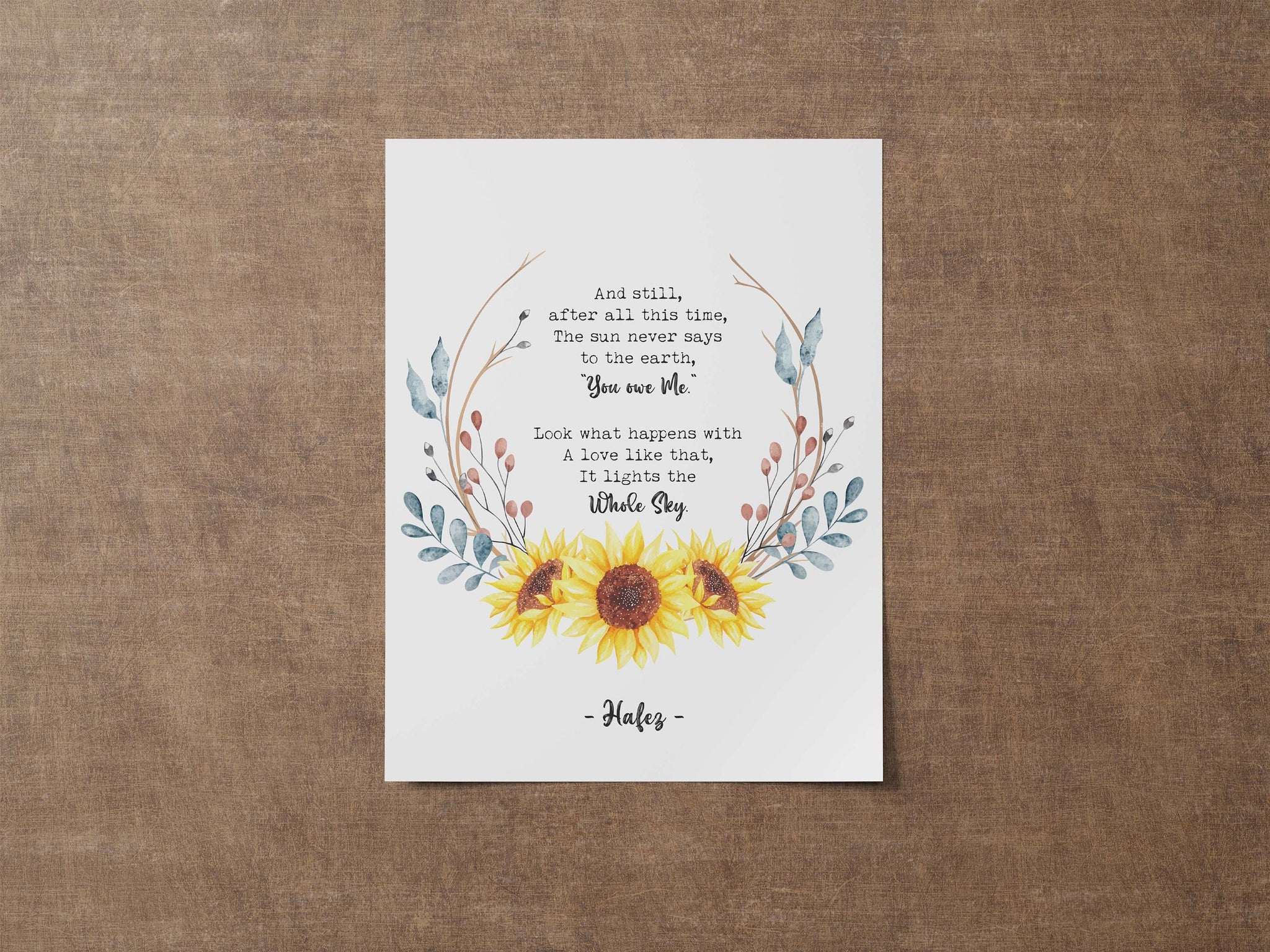 This high-quality print pairs Hafez’s luminous verse on selfless love with a vibrant watercolor wreath of golden sunflowers and soft green leaves — a symbol of warmth, gratitude, and joy.