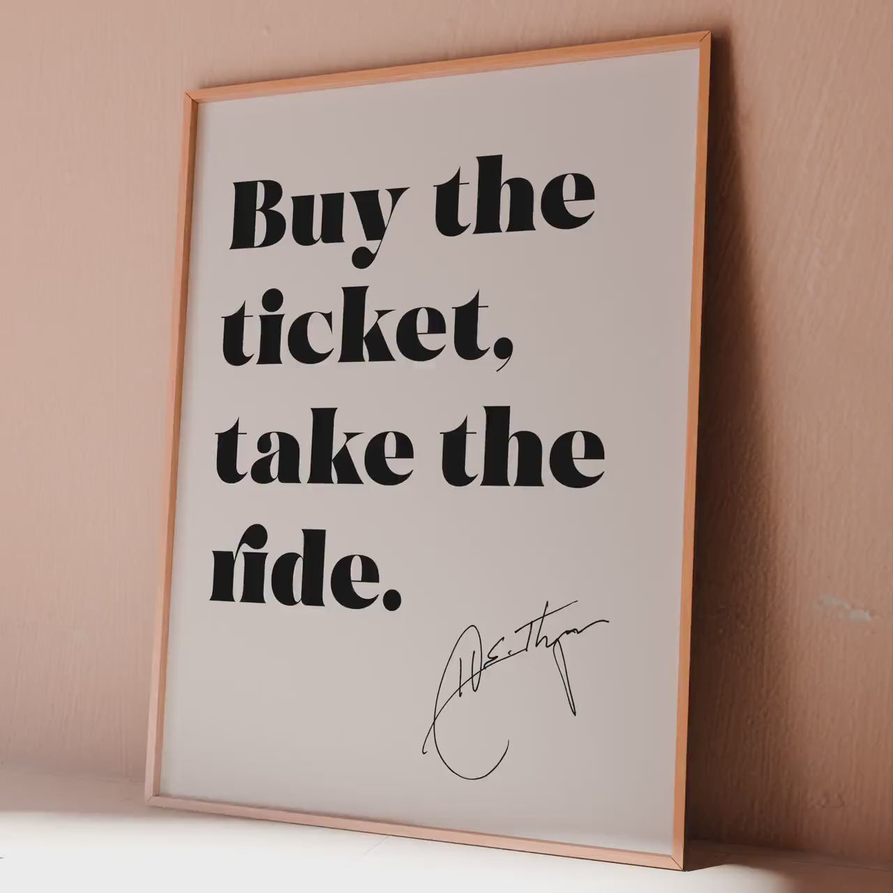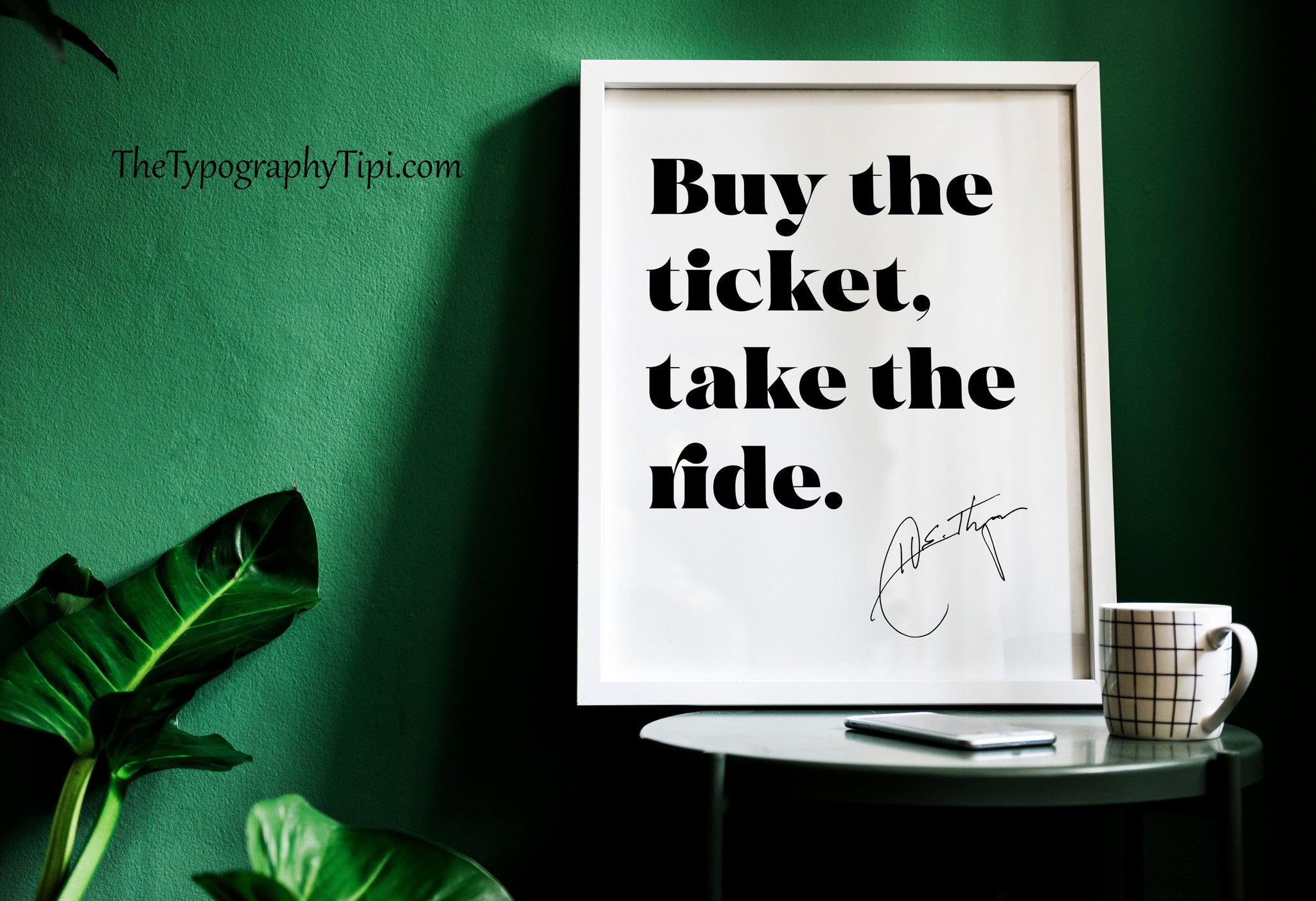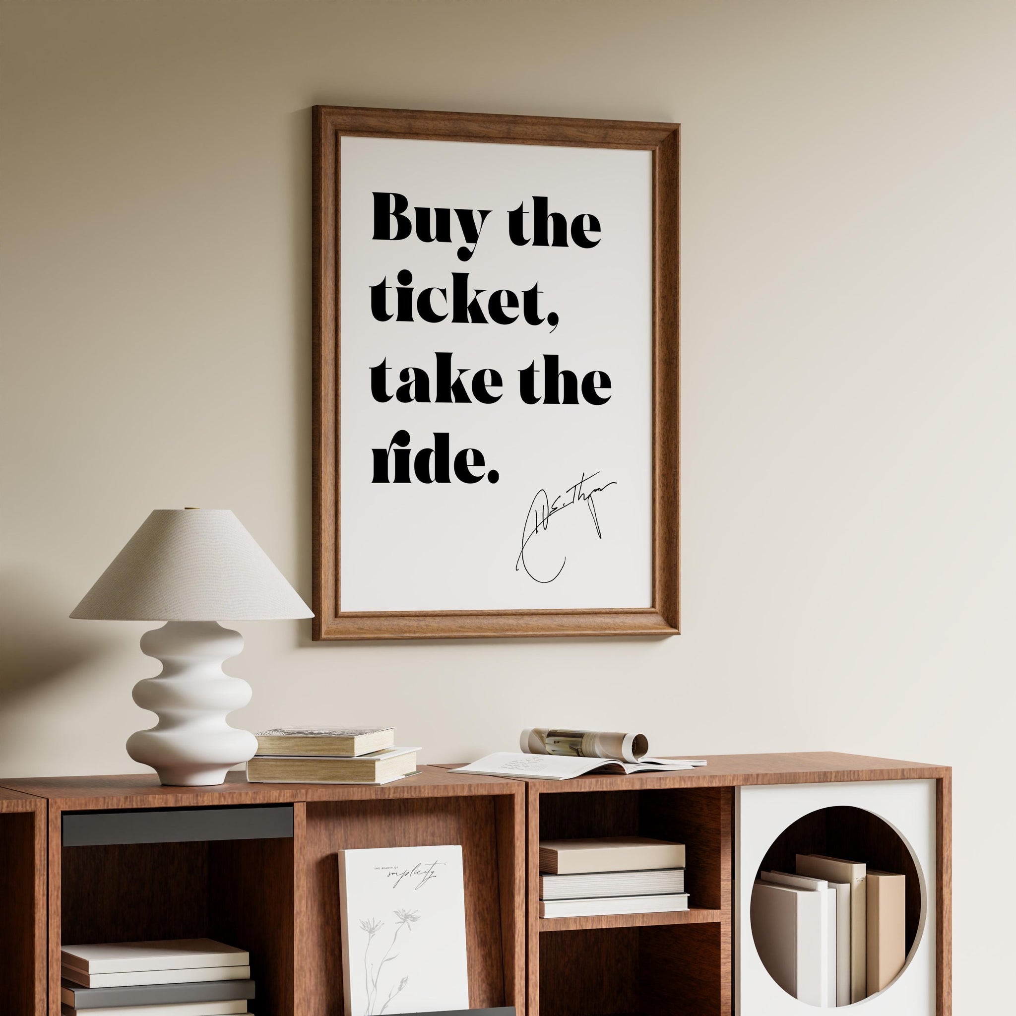 Immerse yourself in the fearless spirit of Hunter S. Thompson with this bold black and white art print featuring his iconic quote: “Buy the ticket, take the ride.” Designed in a clean, modern font with his signature in the corner, this minimalist print makes a striking statement in any space.