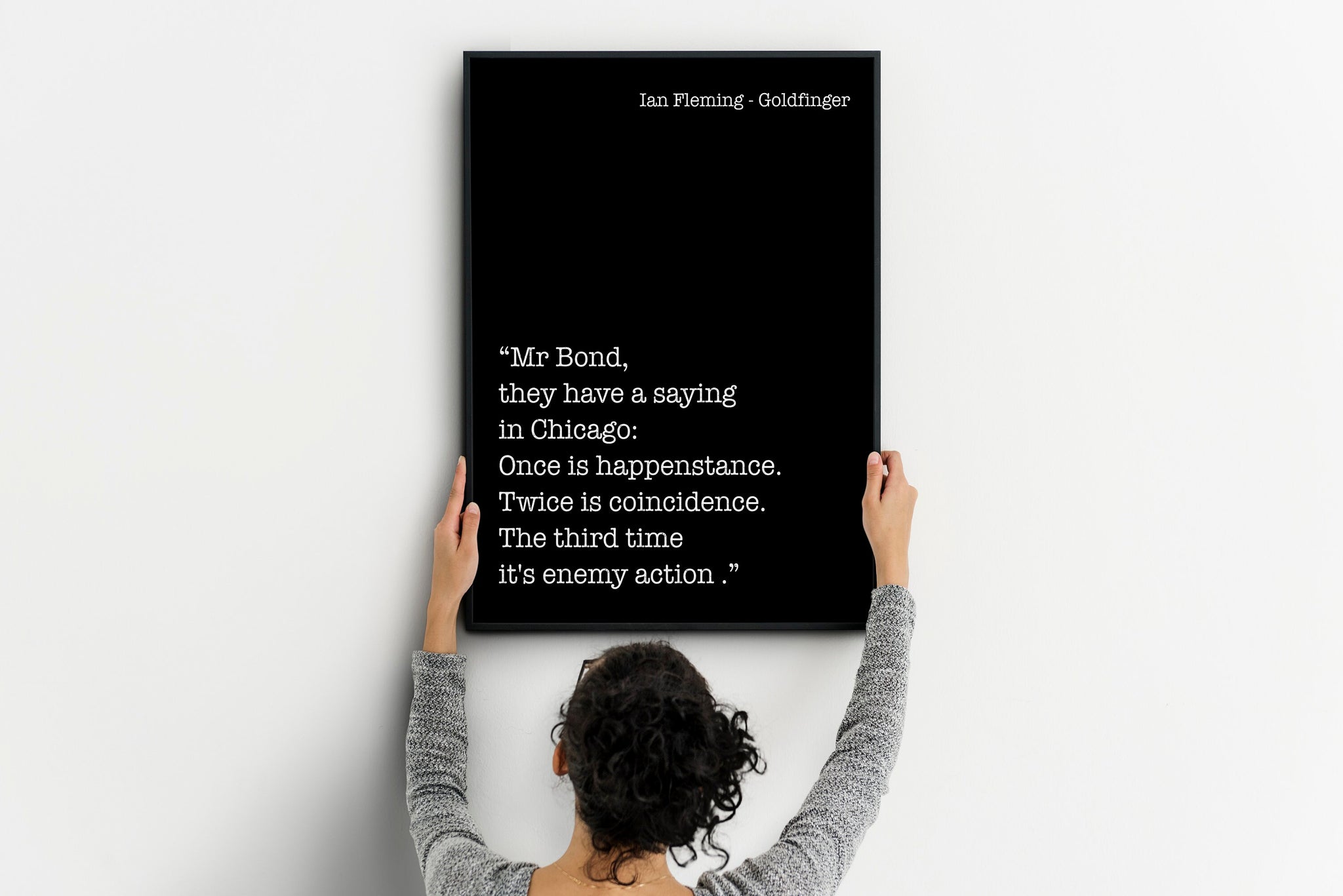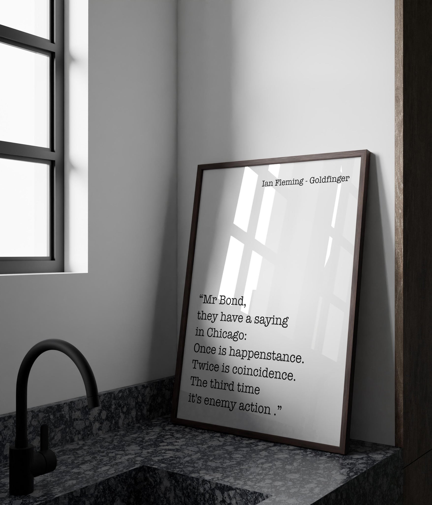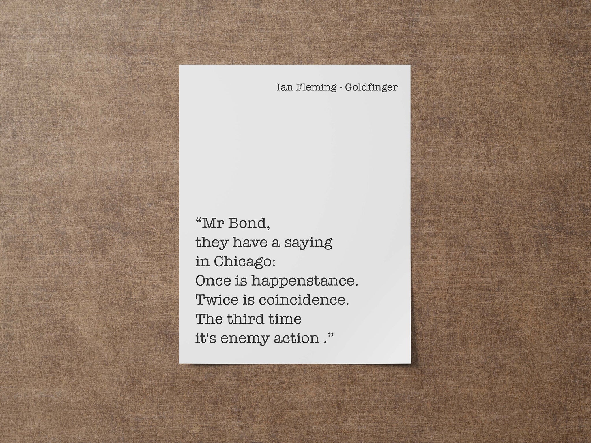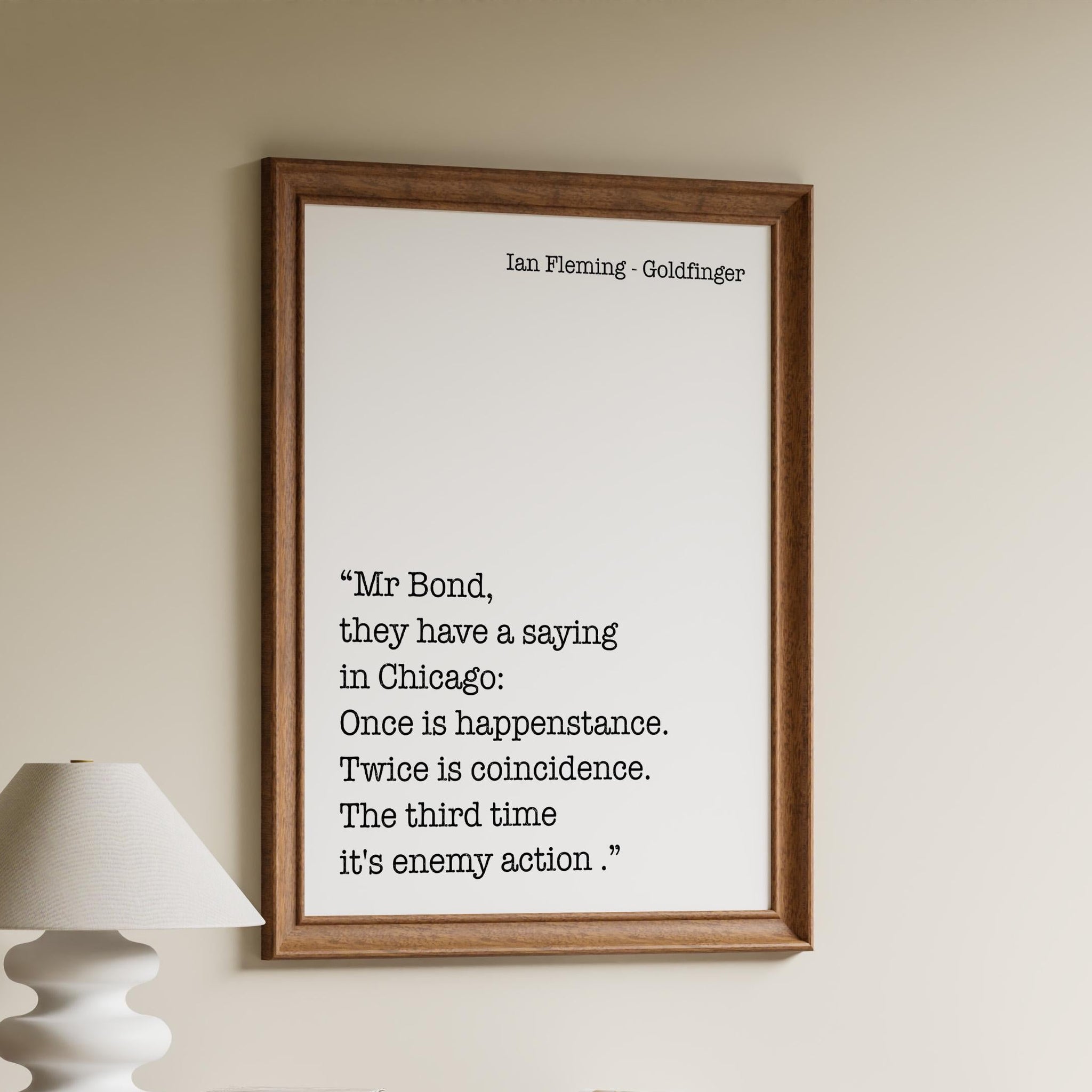 Add intrigue and classic spy sophistication to your space with this Ian Fleming Goldfinger quote print. Featuring the iconic James Bond line, “Once is happenstance. Twice is coincidence. The third time it's enemy action.” this black and white literary wall art captures the sharp tension and intelligence of the Bond universe.