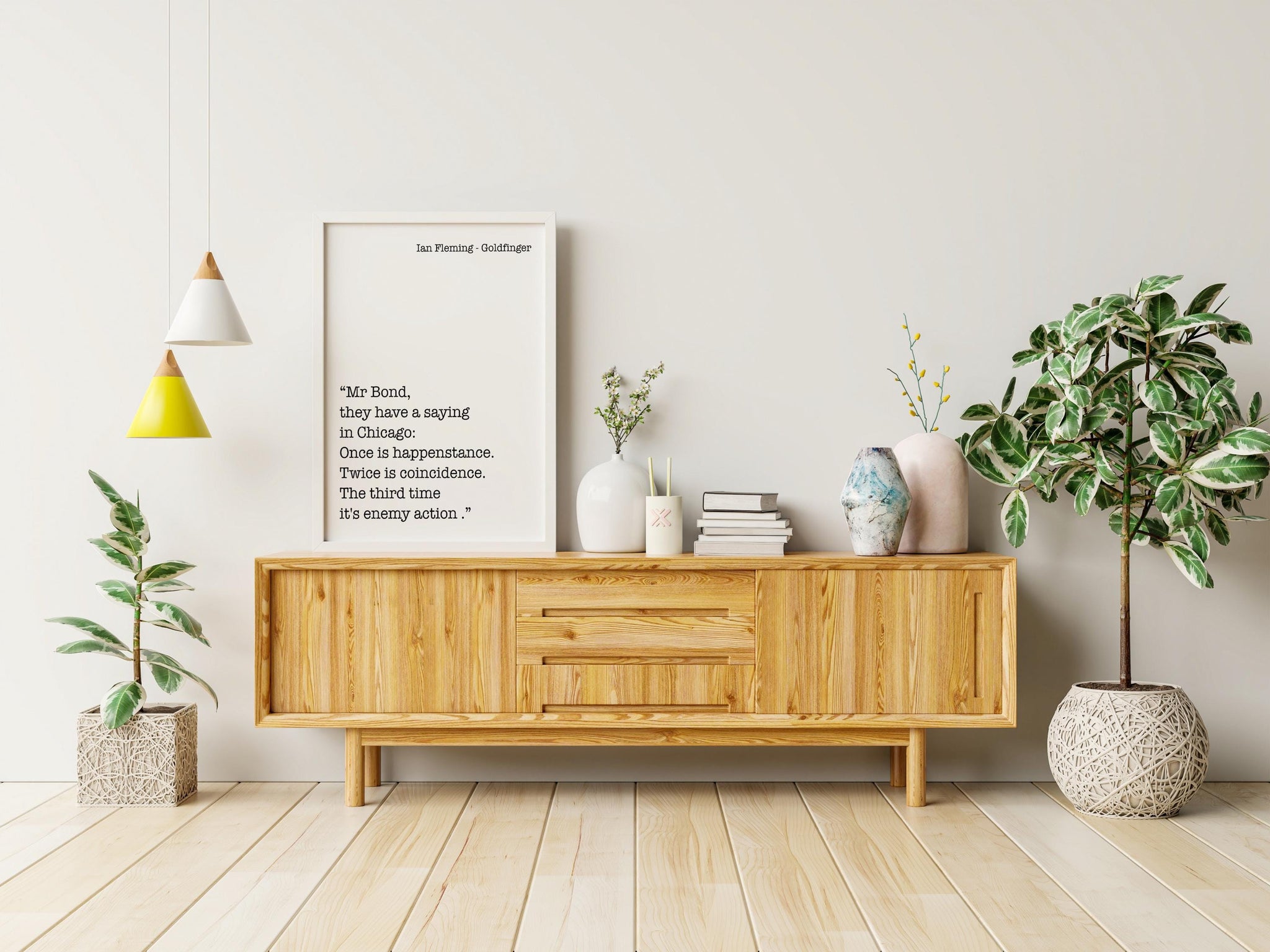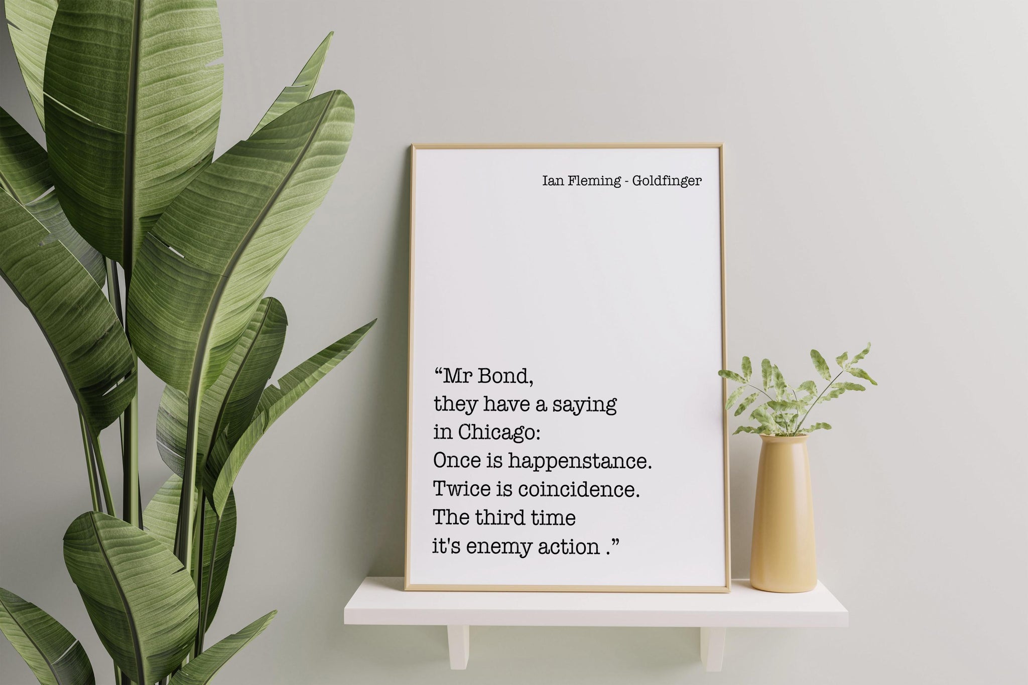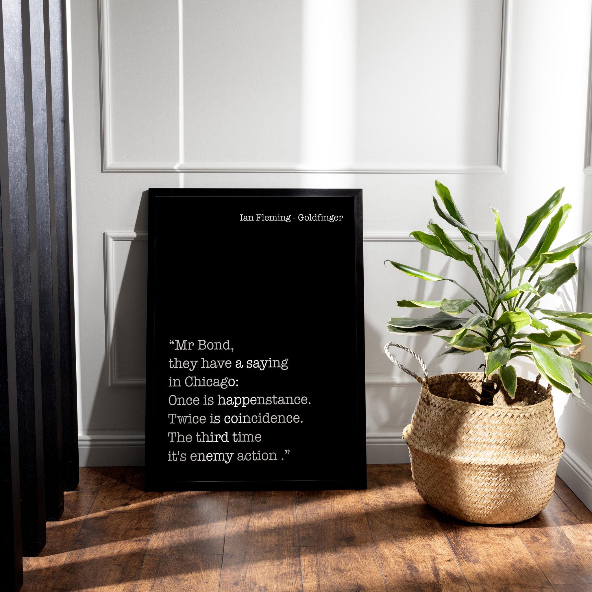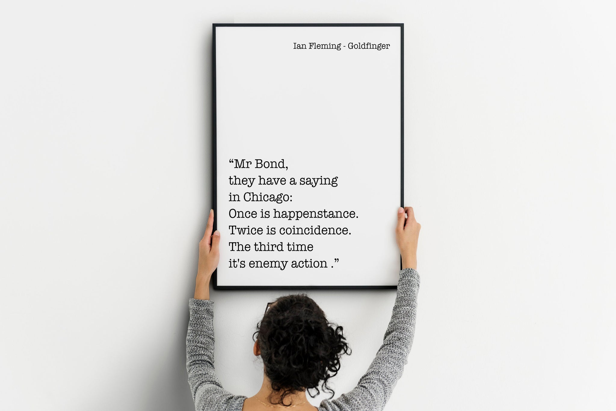 Add intrigue and classic spy sophistication to your space with this Ian Fleming Goldfinger quote print. Featuring the iconic James Bond line, “Once is happenstance. Twice is coincidence. The third time it's enemy action.” this black and white literary wall art captures the sharp tension and intelligence of the Bond universe.