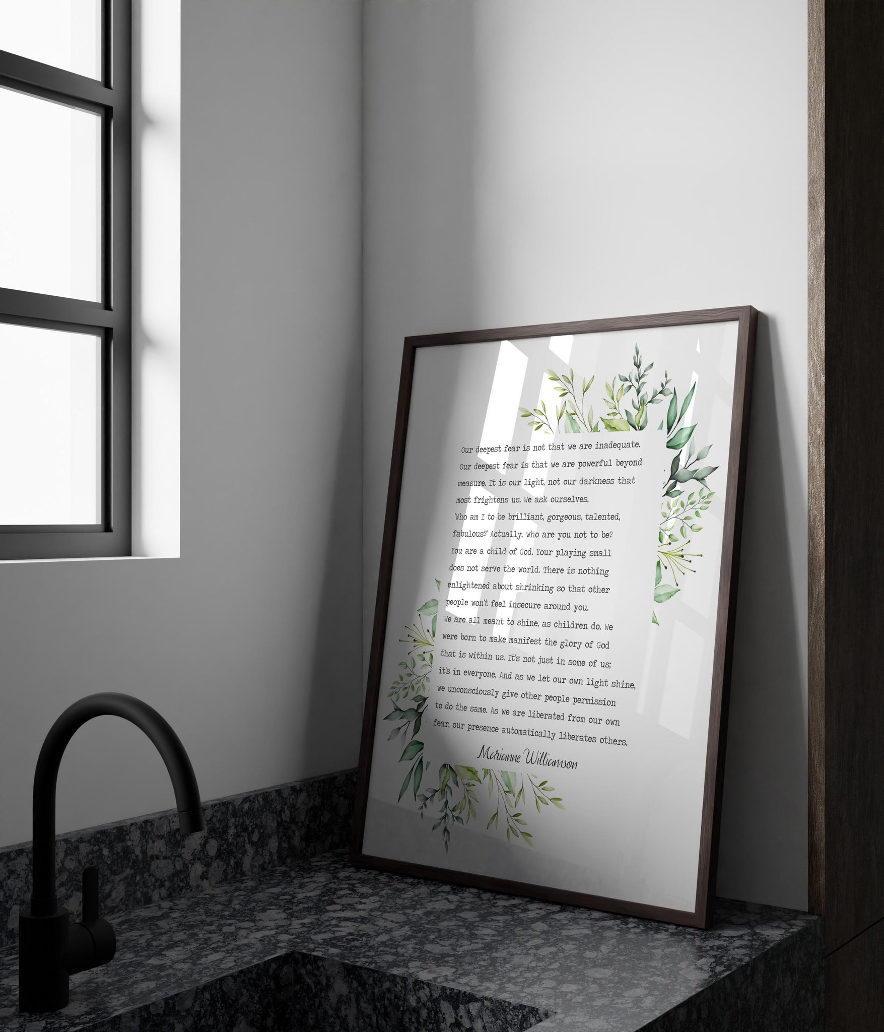 Empower your space with the inspiring words of Marianne Williamson’s famous poem, “Our Deepest Fear.” This high-quality art print captures the timeless message that we are “powerful beyond measure,” reminding us to embrace our inner strength and shine brightly without fear.