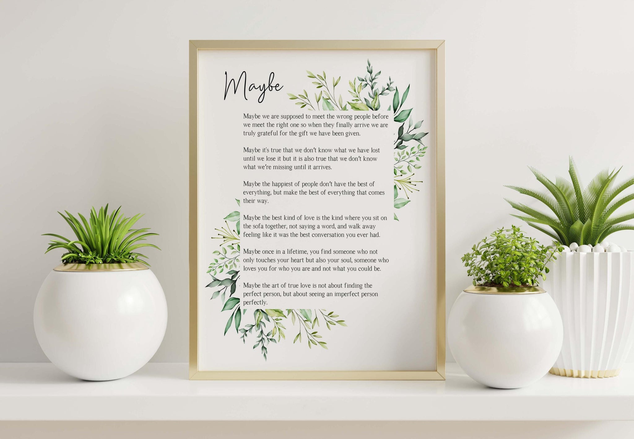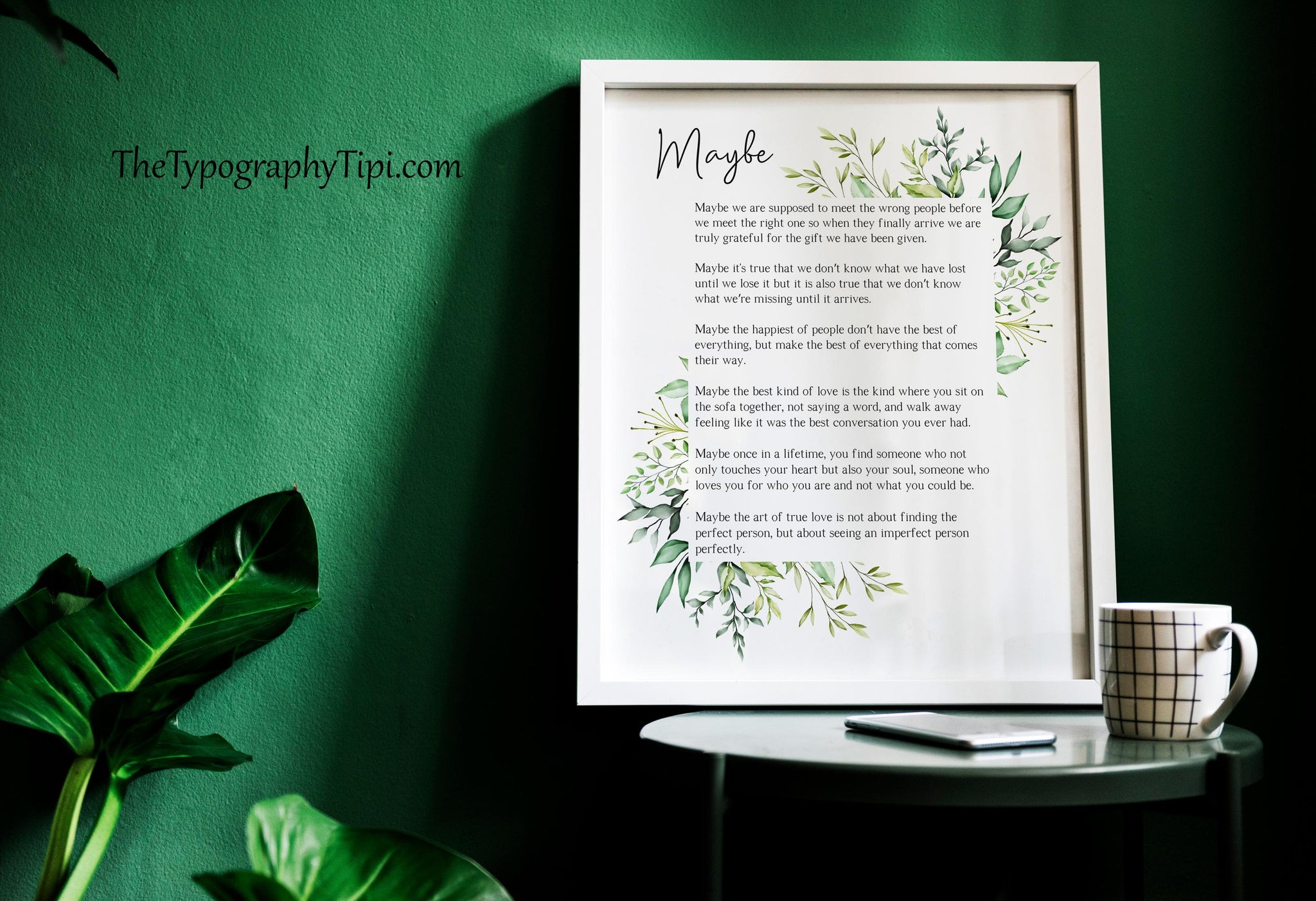 Celebrate love in its truest form with this beautiful “Maybe” poem art print, a heartfelt piece featuring a timeless love poem of unknown origin. Printed in an elegant, classic font on a clean white background and encircled by a soft watercolor-style wreath of green leaves, this piece captures the gentle beauty of devotion and commitment.