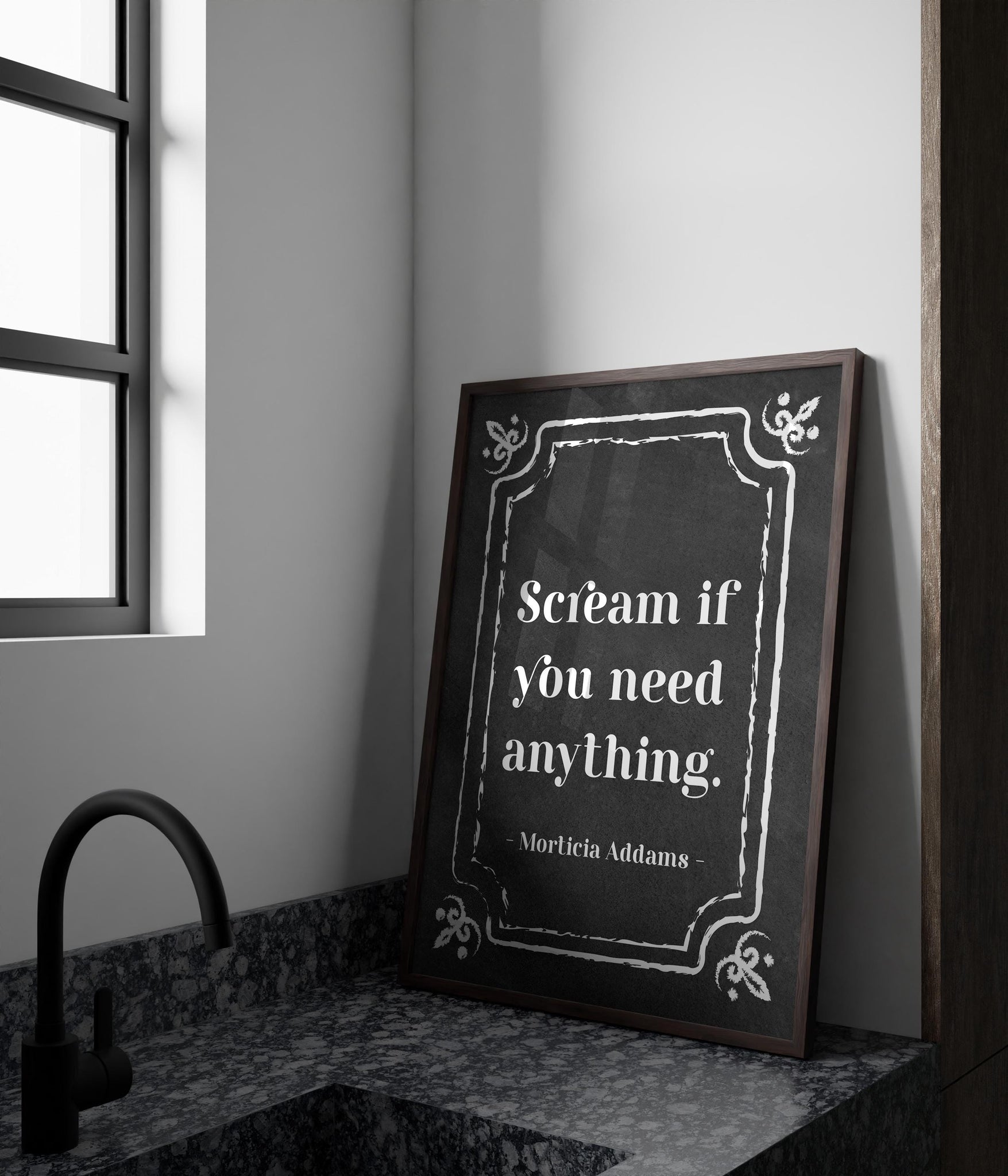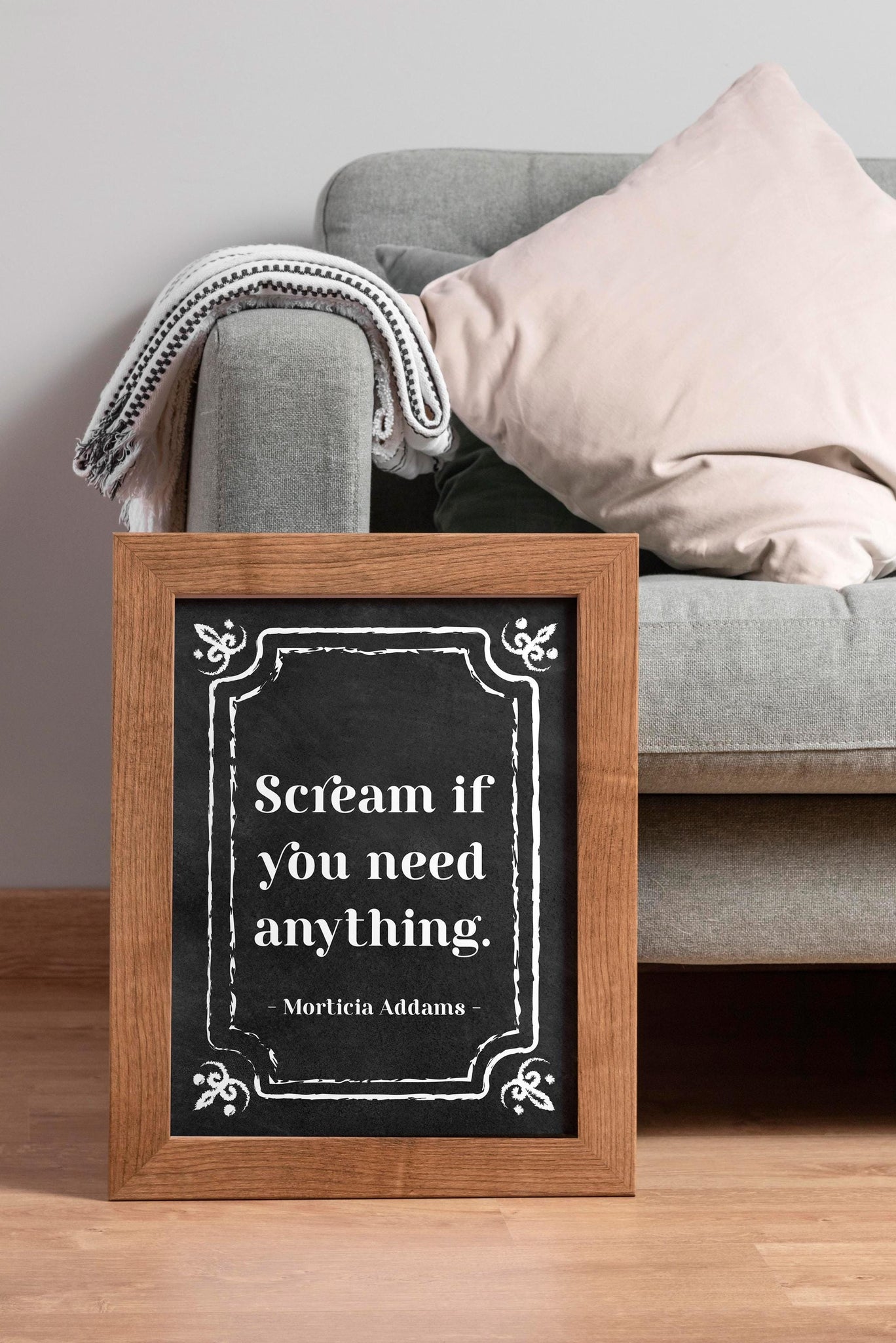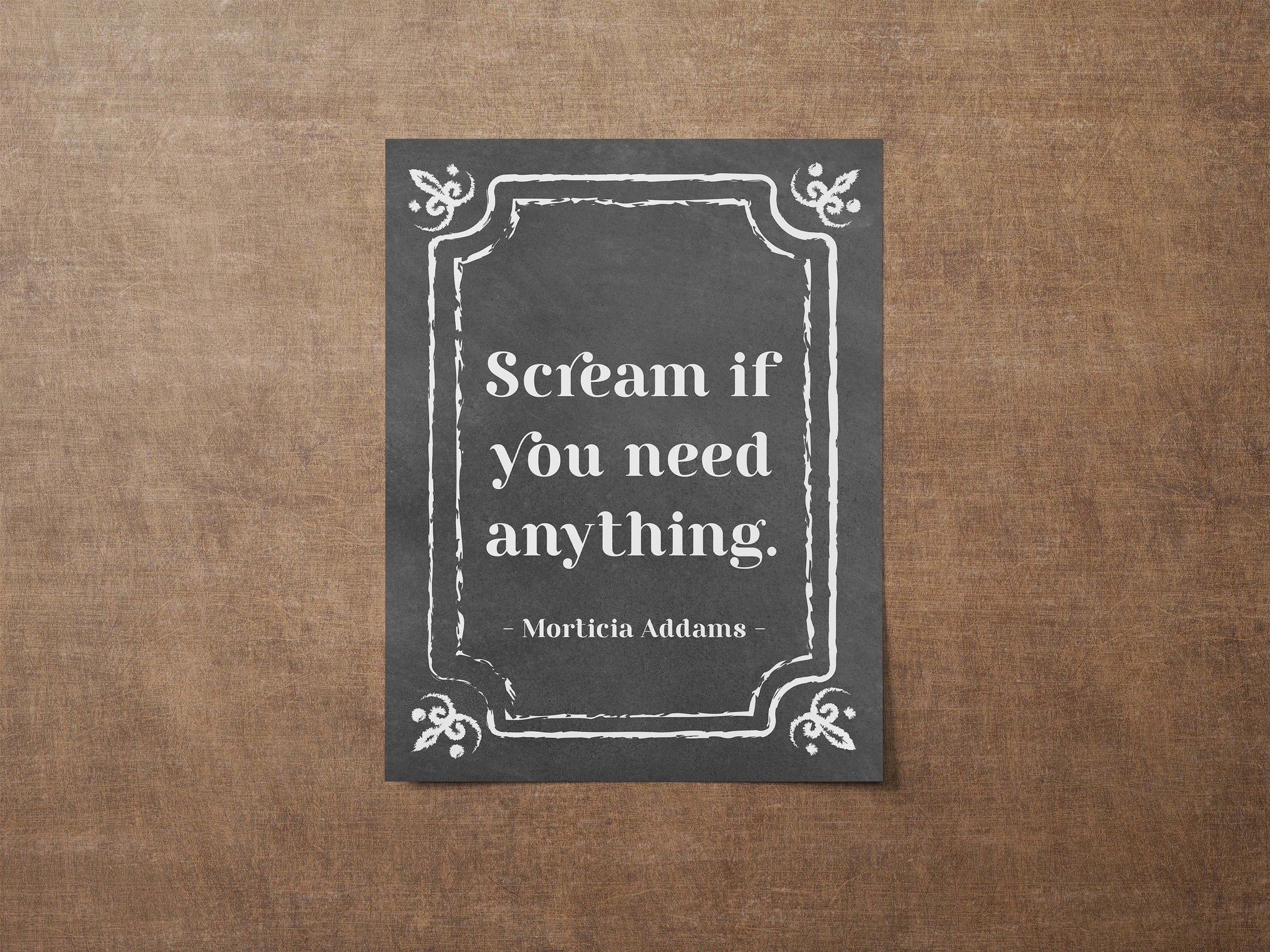 Add a touch of gothic wit and spooky charm to your walls with this Morticia Addams quote print: “Scream if you need anything.” Perfectly dark and delightfully cheeky, this high-quality art print captures the iconic humor of The Addams Family, making it a standout piece for anyone who loves alternative style and timeless cult classics.