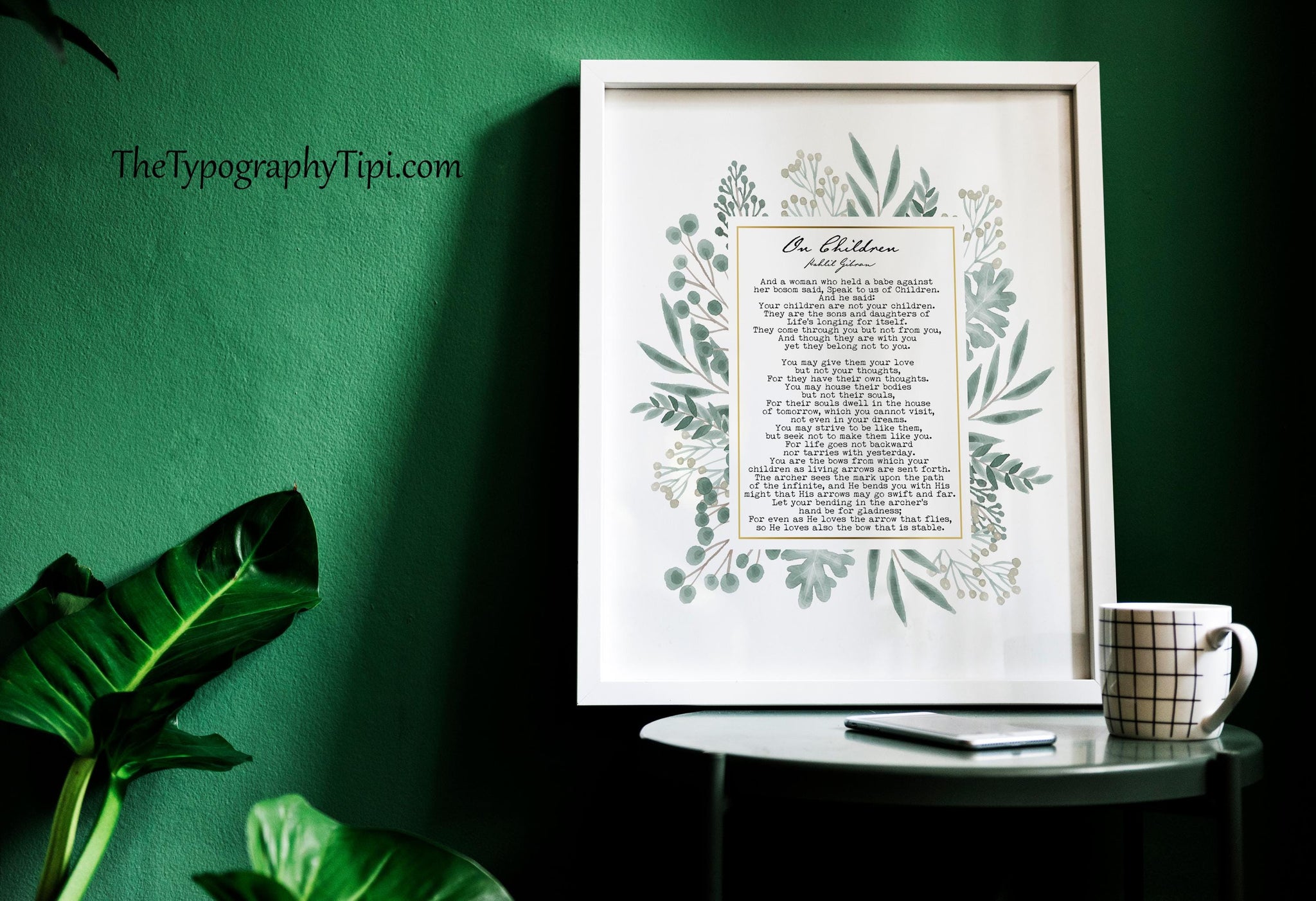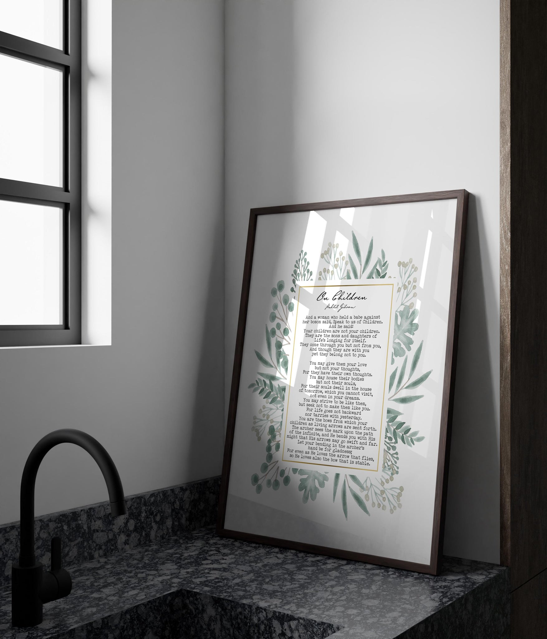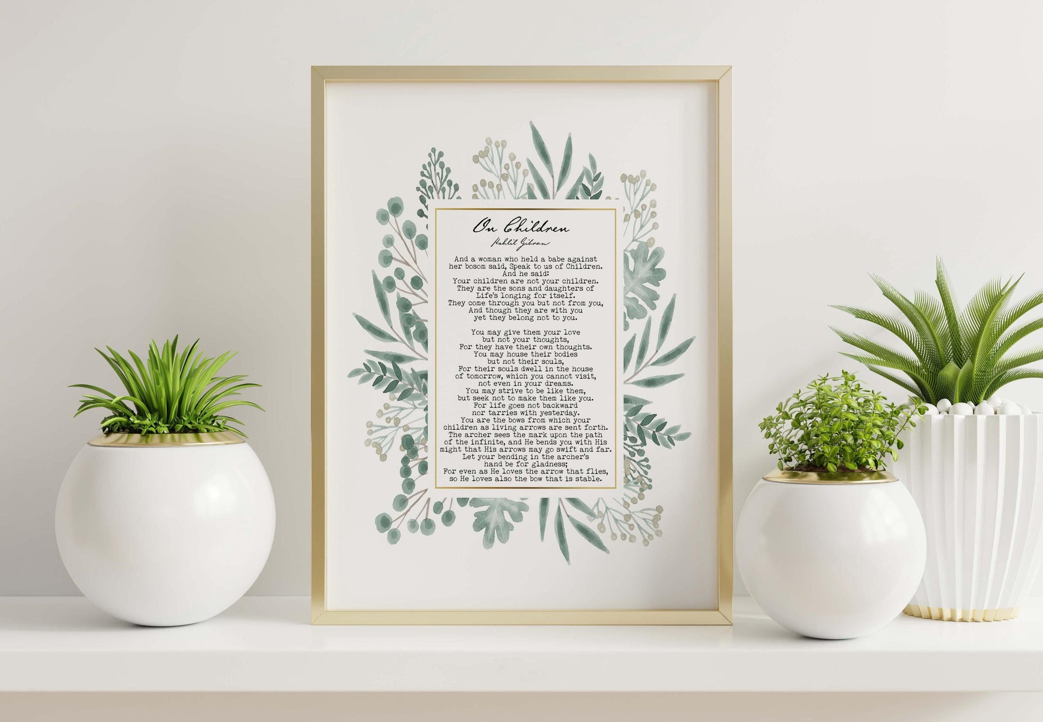 Honor the wisdom and beauty of Kahlil Gibran’s classic poem On Children with this elegant art print, framed by a delicate watercolor-style floral wreath. The soft botanical design surrounds the full text of the poem, creating a meaningful and visually calming piece perfect for family spaces and reflective interiors.
