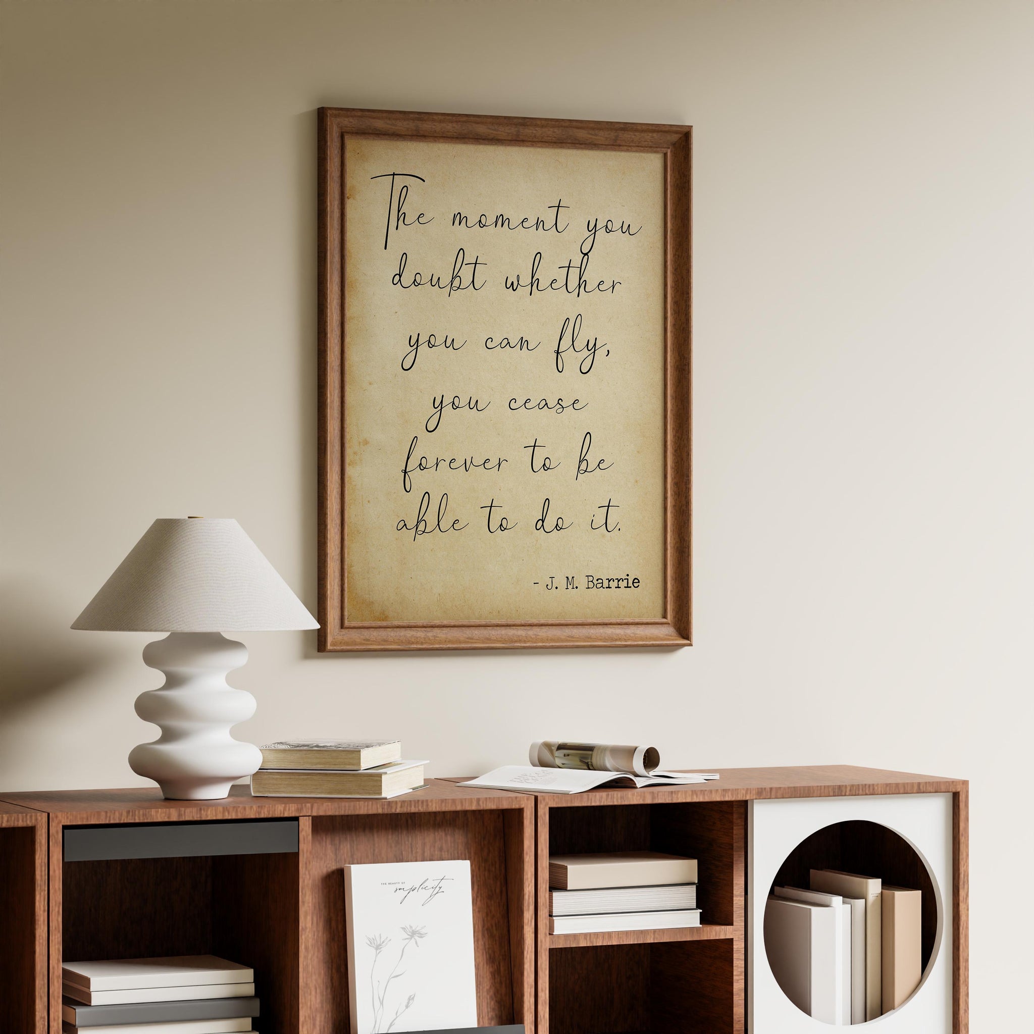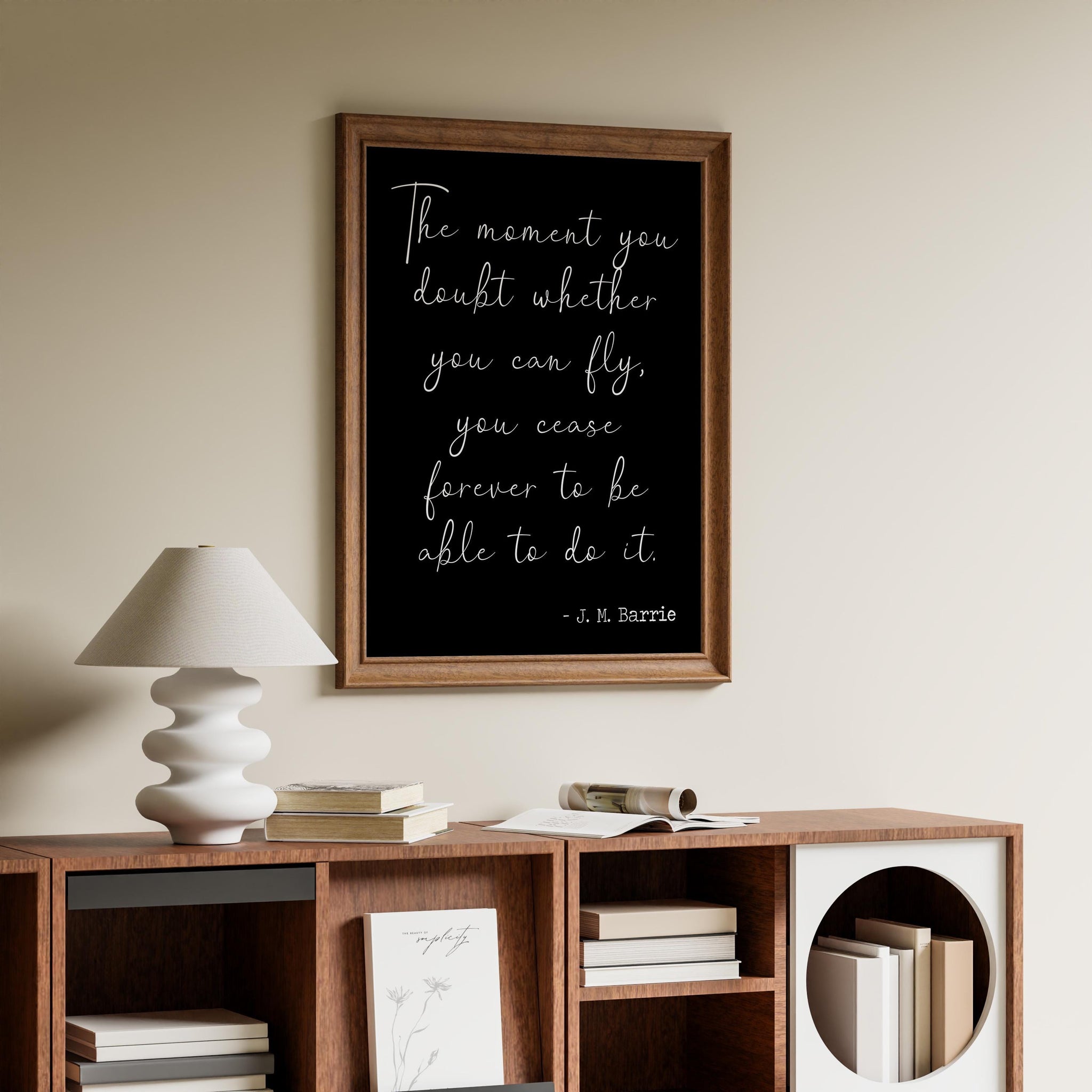 Whimsical, inspiring, and full of imagination, this Peter Pan quote print by J.M. Barrie captures the magic of believing in yourself. Featuring the beloved words “The moment you doubt whether you can fly, you cease forever to be able to do it.” this black and white inspirational quote poster celebrates courage, confidence, and the wonder of childhood.