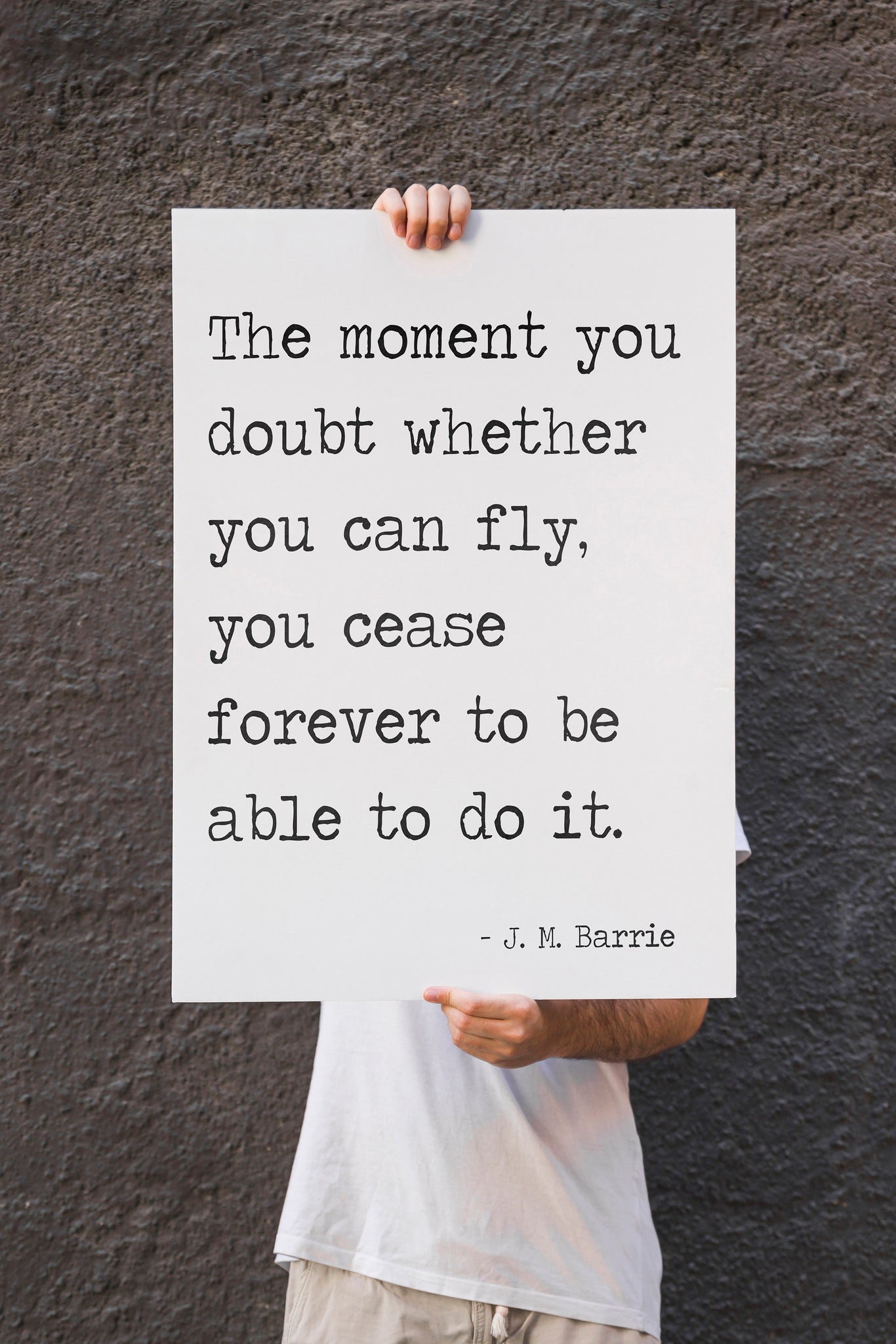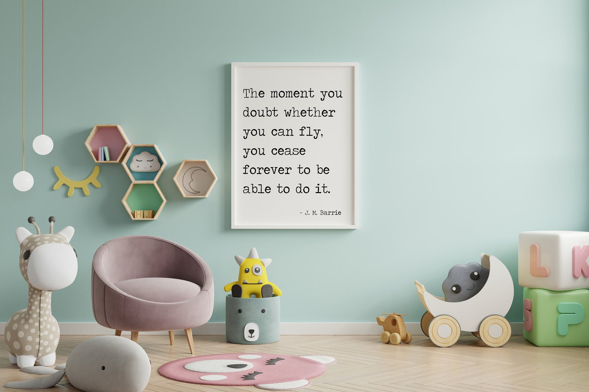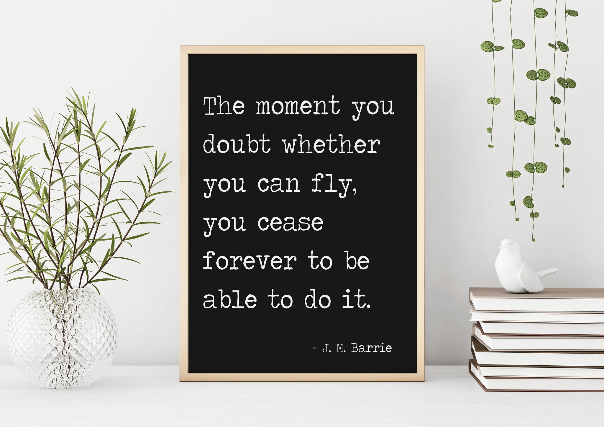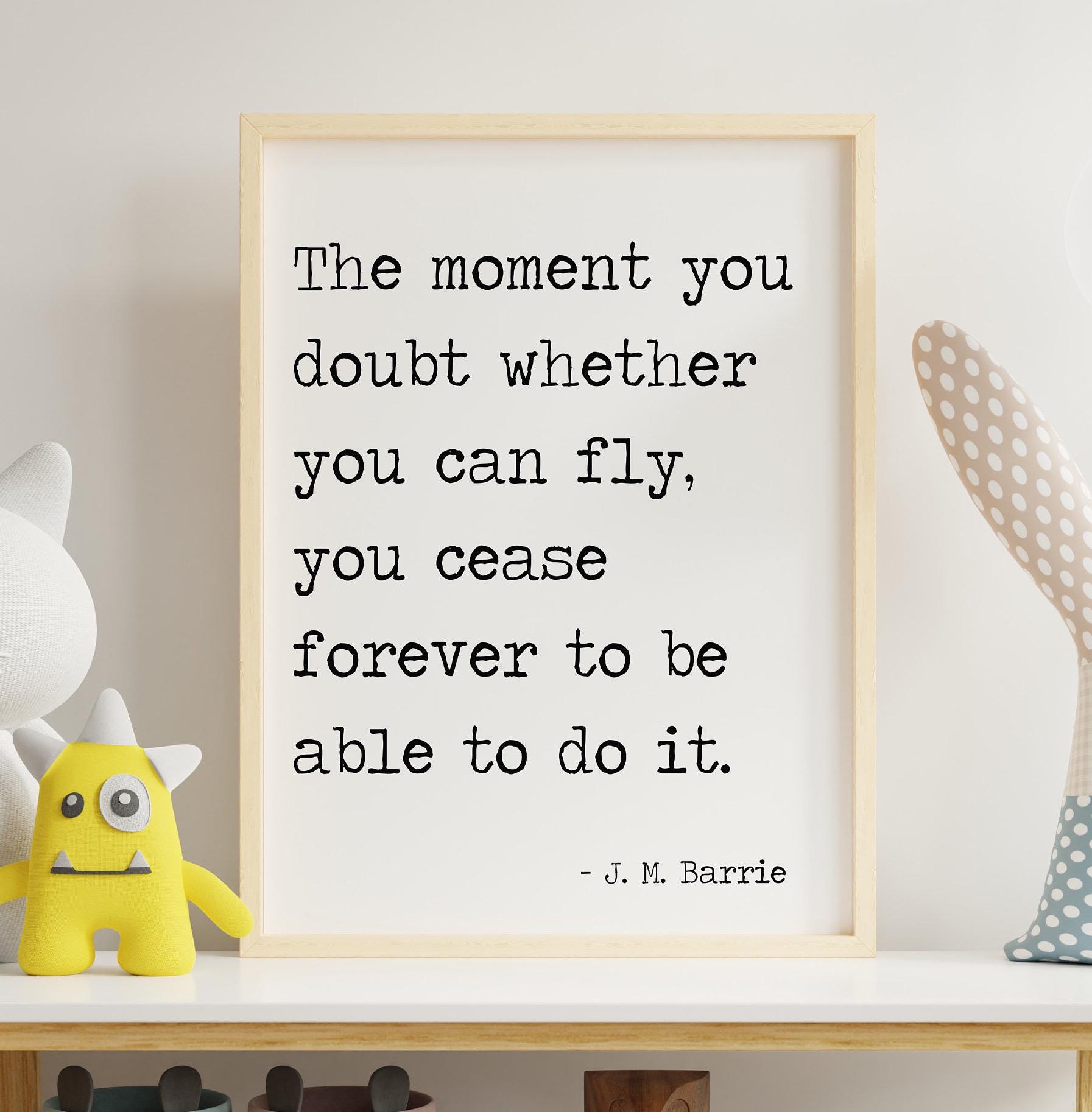 Encourage imagination, confidence, and belief with this timeless quote from Peter Pan by J. M. Barrie: “The moment you doubt whether you can fly, you cease forever to be able to do it.” Presented in clean black-and-white typography, this art print delivers a powerful message in a simple, child-friendly design.