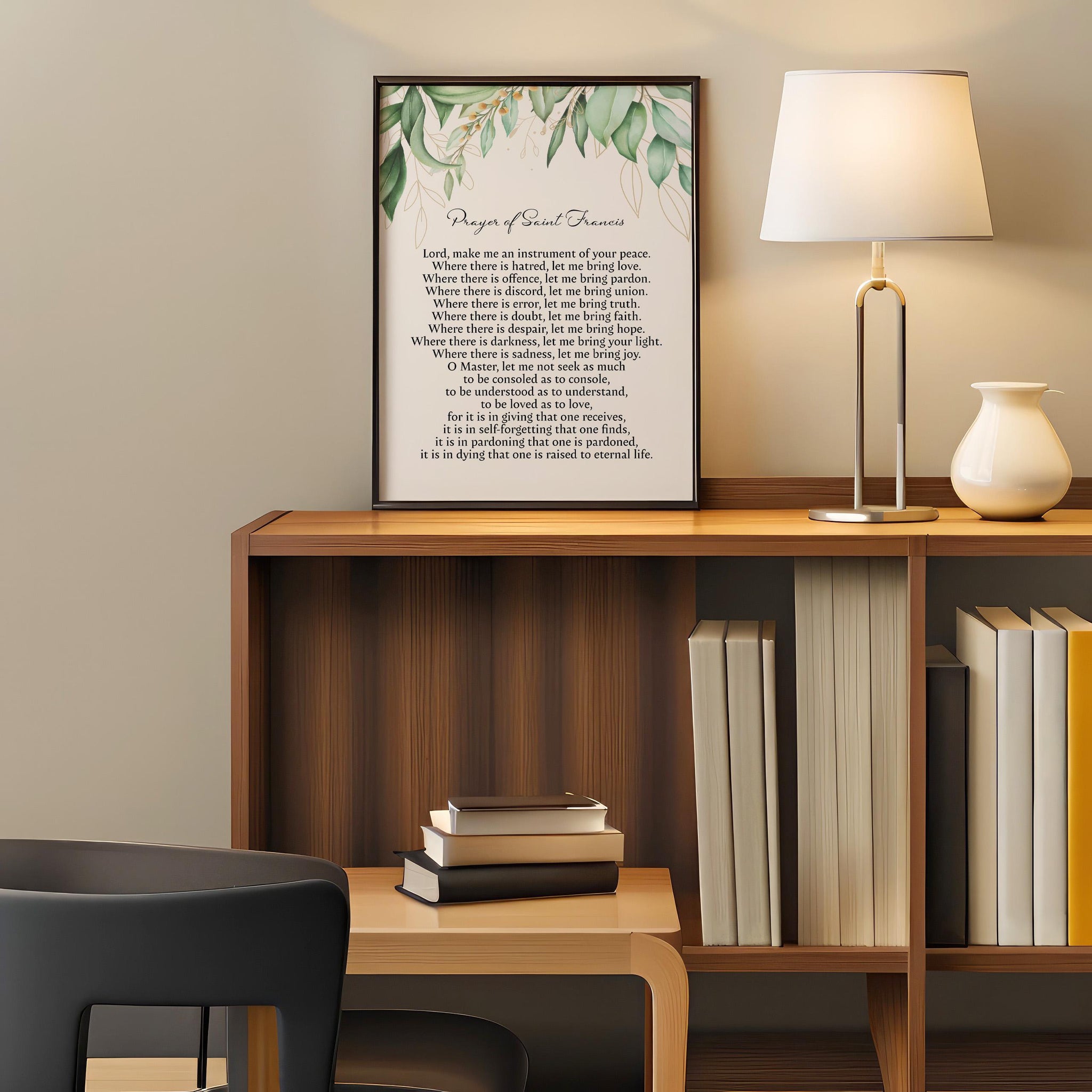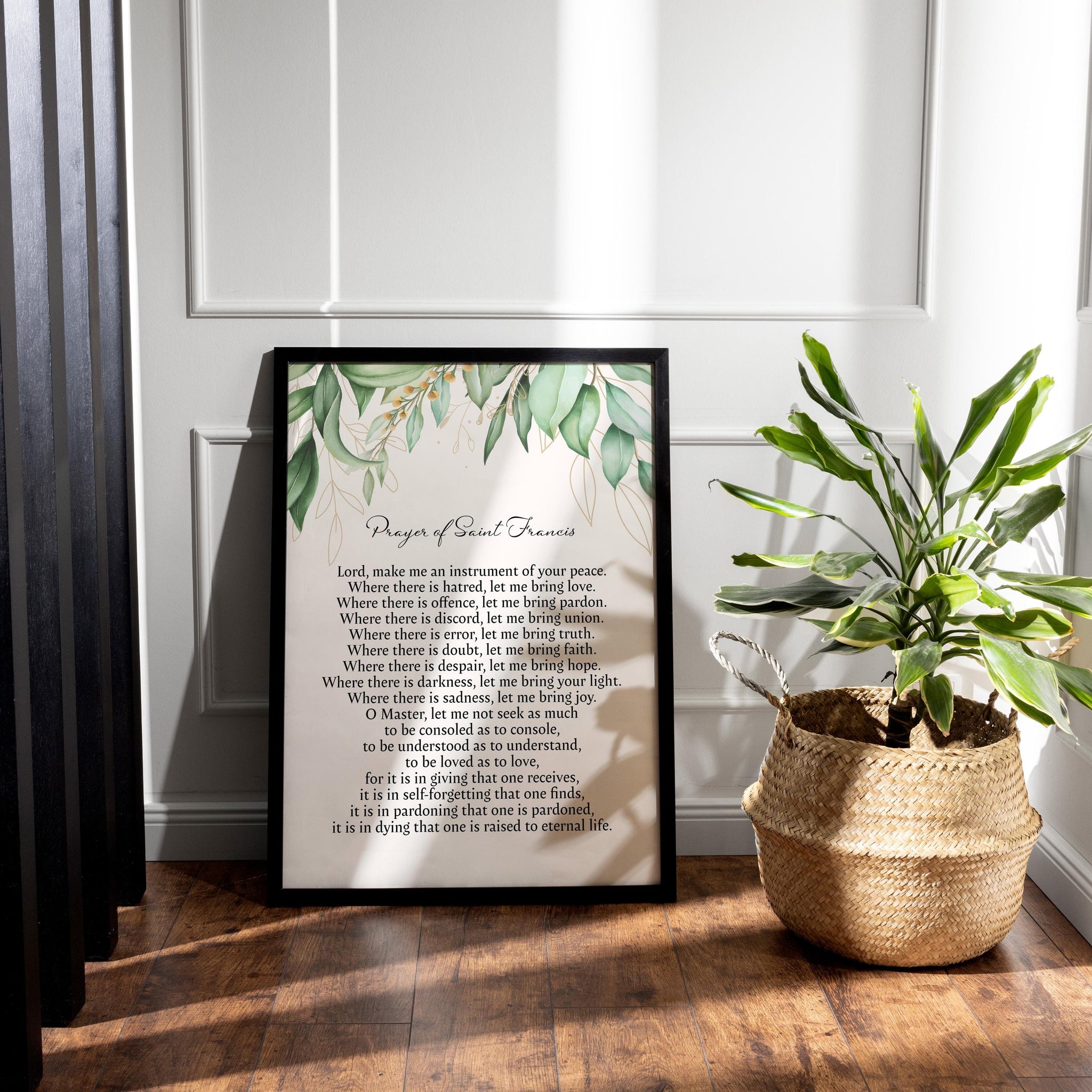 Bring a sense of peace, faith, and reflection into your home with this elegant art print featuring the Prayer of Saint Francis, also known as the Prayer for Peace. This beautifully designed piece includes black text on a soft cream background, adorned with a delicate leaf border for a timeless, calming aesthetic.