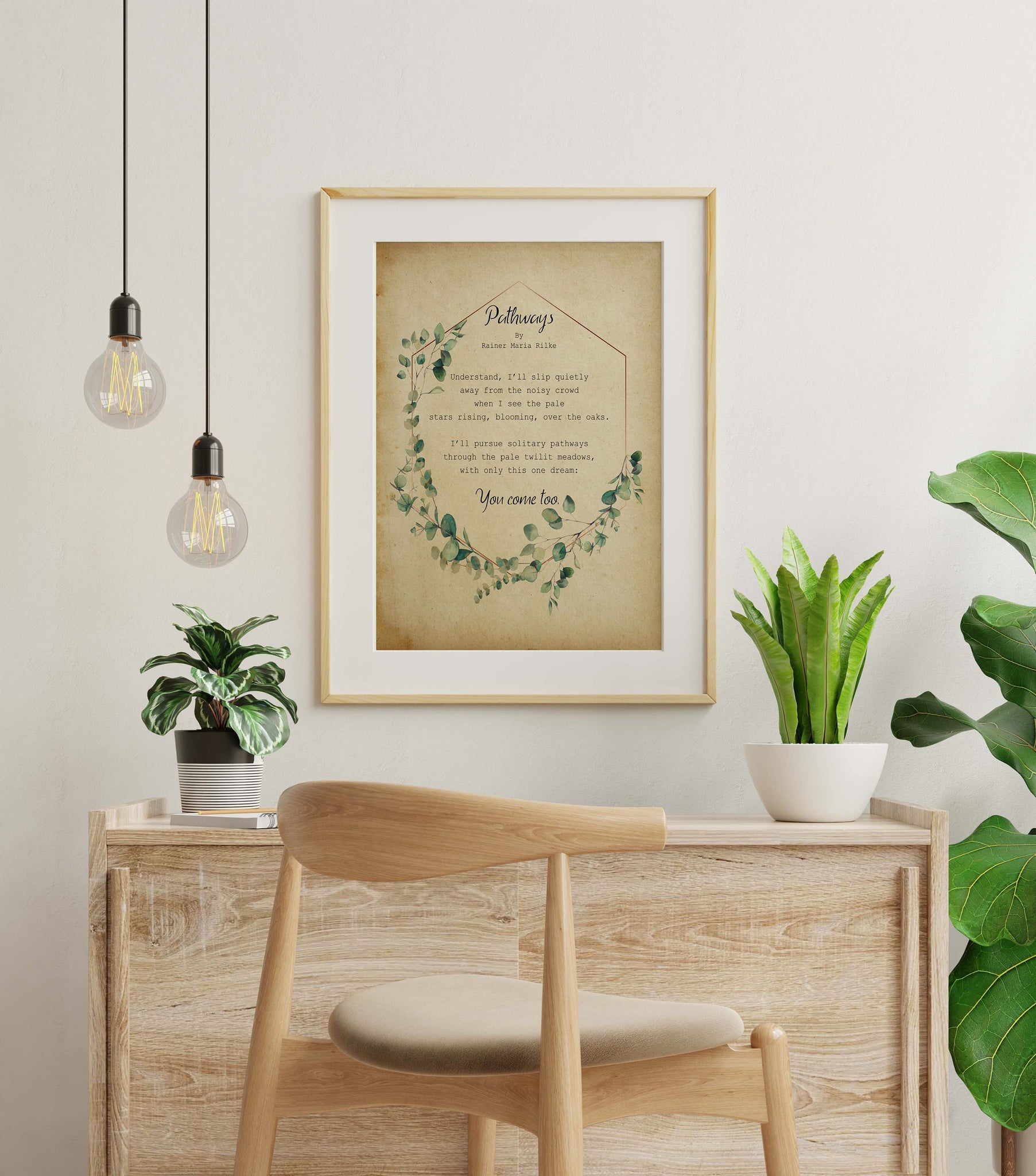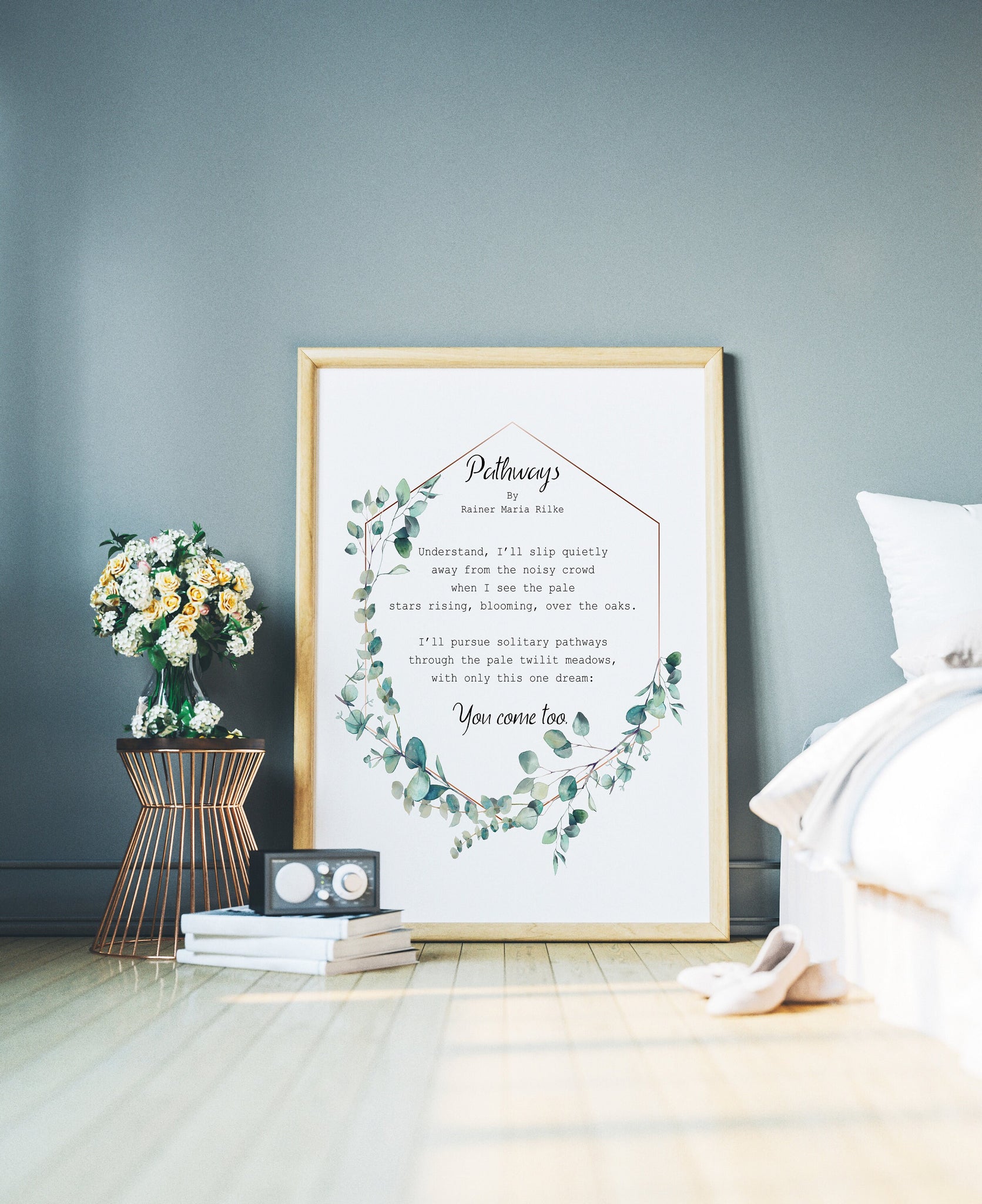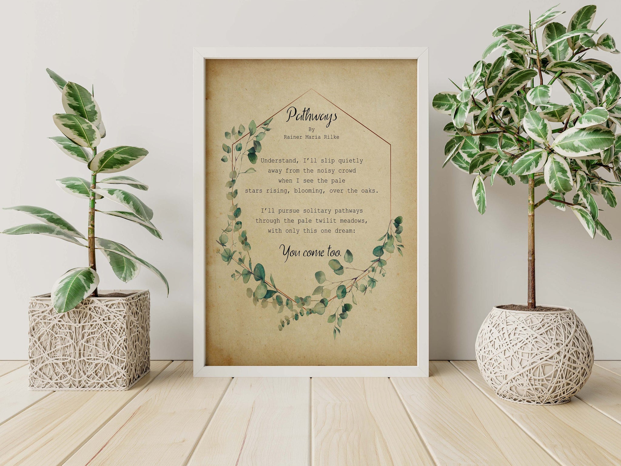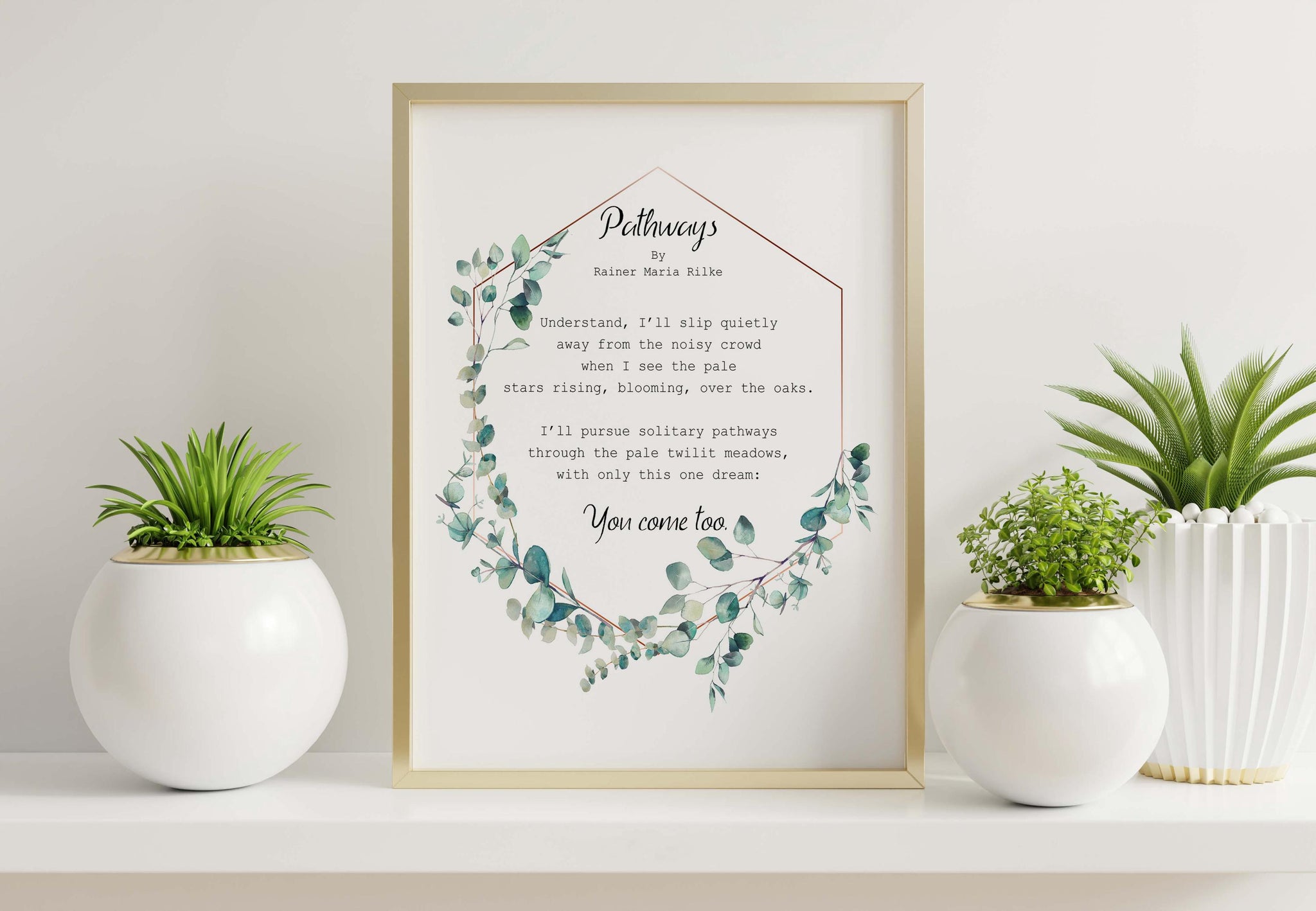 Bring the quiet beauty of poetry into your space with this elegant art print featuring “Pathways” by Rainer Maria Rilke. Printed in a clean, modern design with soft watercolor eucalyptus accents, it makes a timeless addition to any home, library, or reading nook.