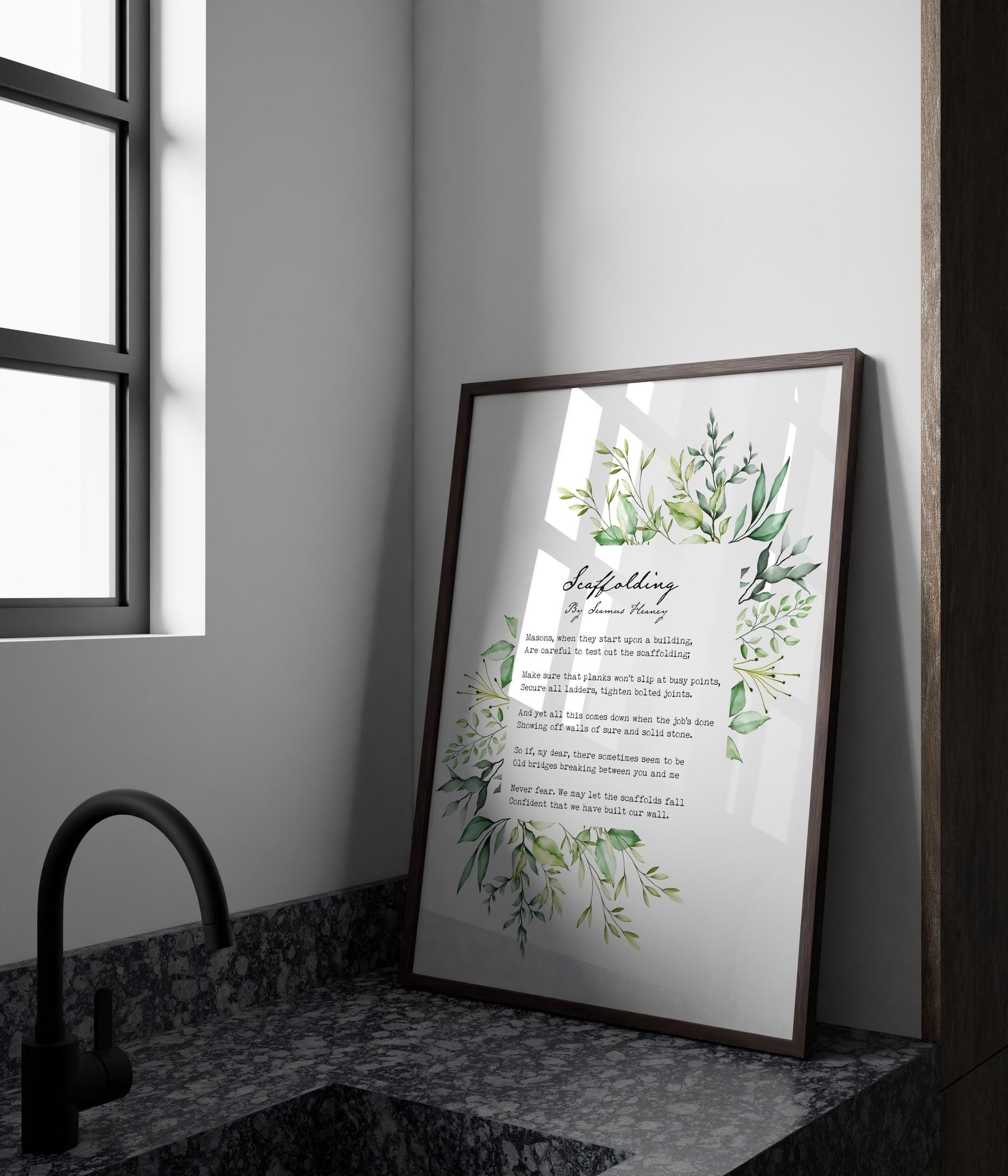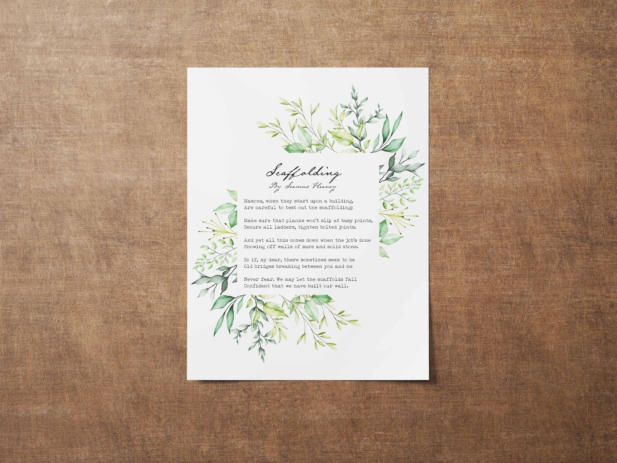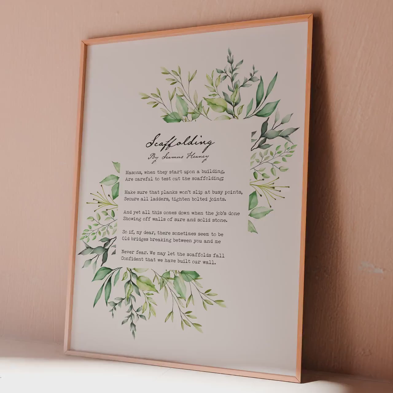 A beautiful and meaningful art print of “Scaffolding” by Seamus Heaney — a poem about trust, partnership, and building something strong together. Printed in an elegant serif font and framed by soft watercolor foliage in calming shades of green, this piece brings a modern botanical aesthetic to a timeless literary favorite.