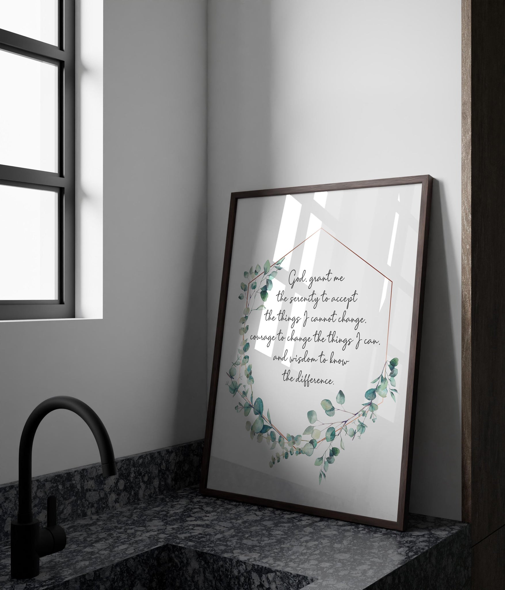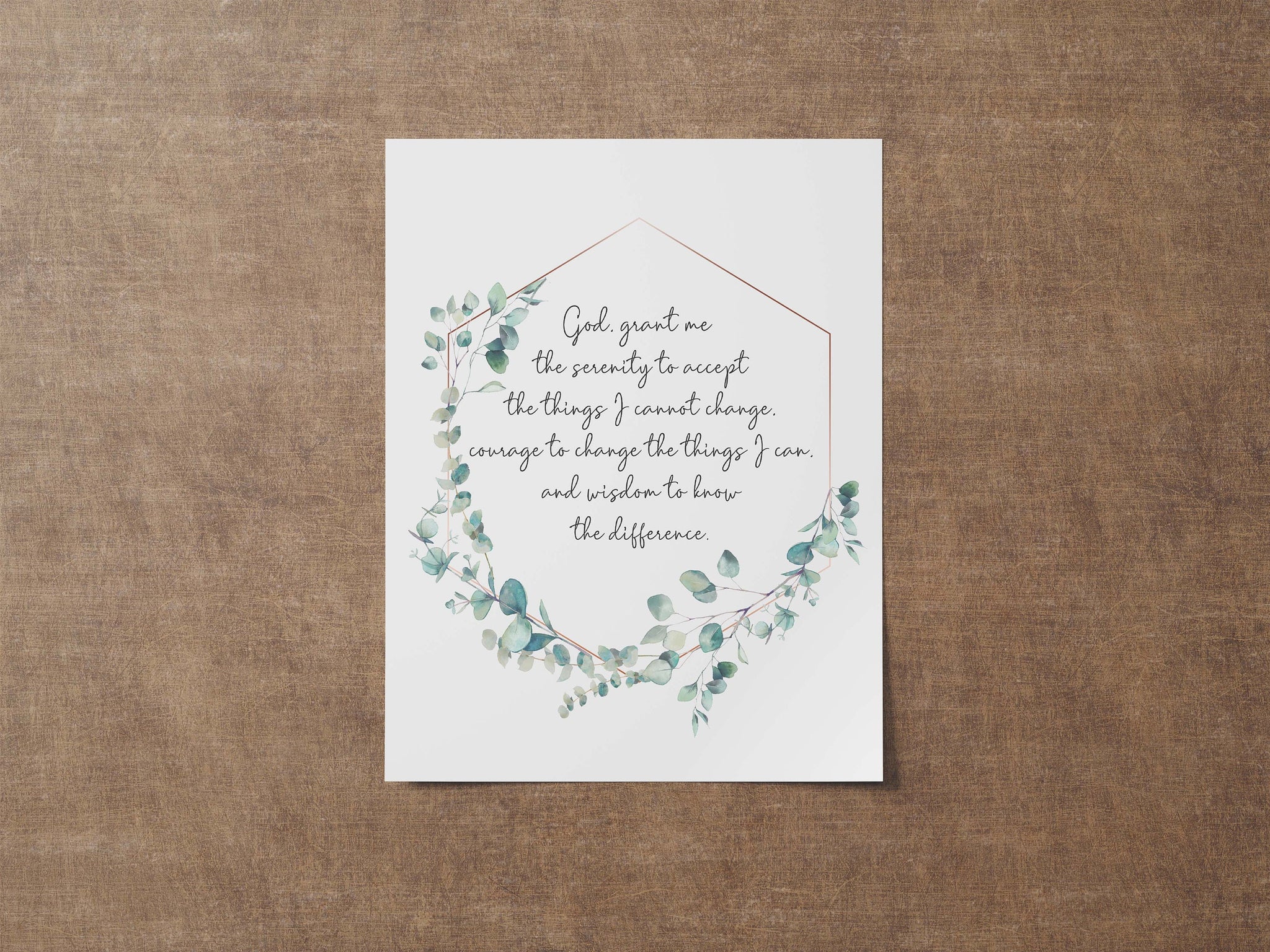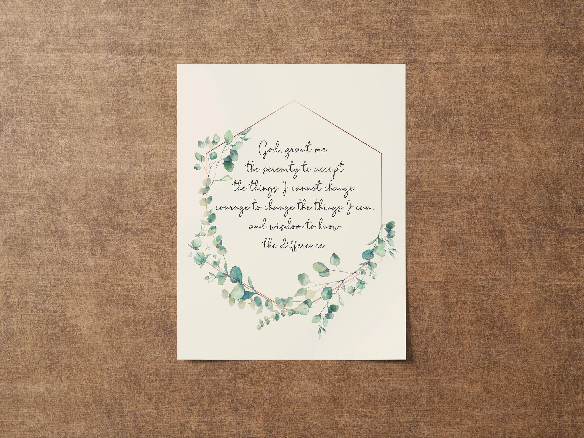 This Serenity Prayer wall art offers timeless words of comfort, courage, and wisdom. Surrounded by a soft watercolor eucalyptus wreath, the prayer reads "God, grant me the serenity to accept the things I cannot change, Courage to change the things I can, And wisdom to know the difference. " and serves as a beautiful daily reminder of peace and strength through faith.