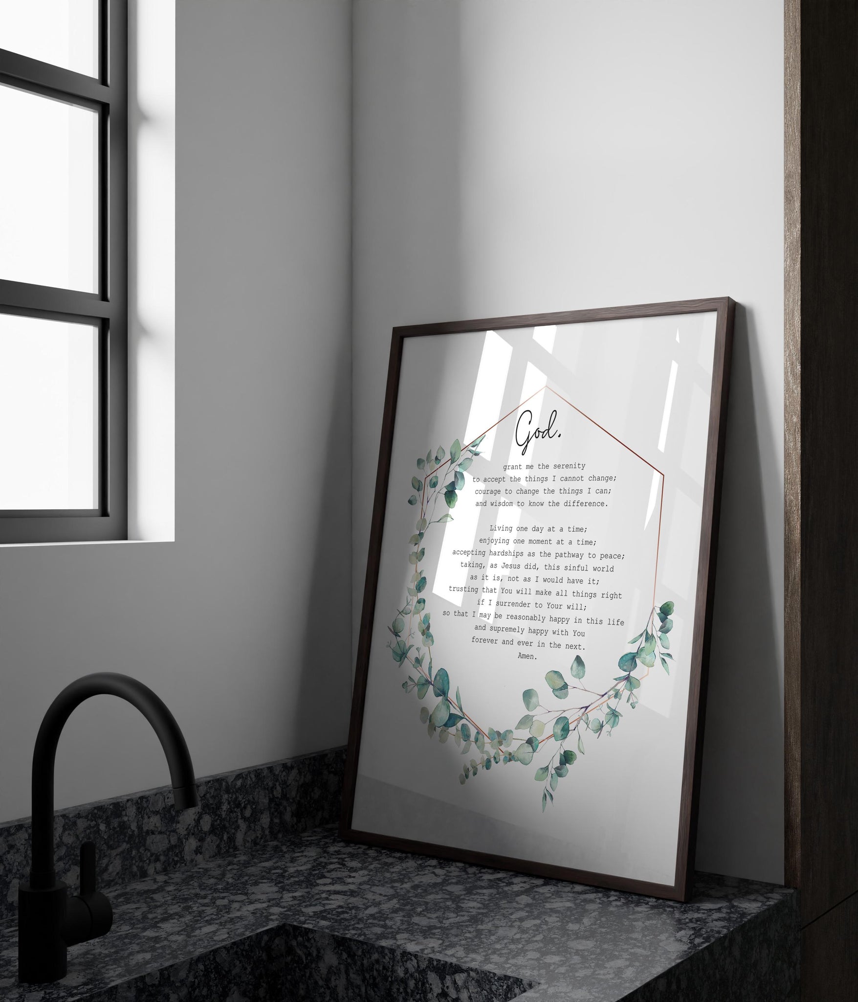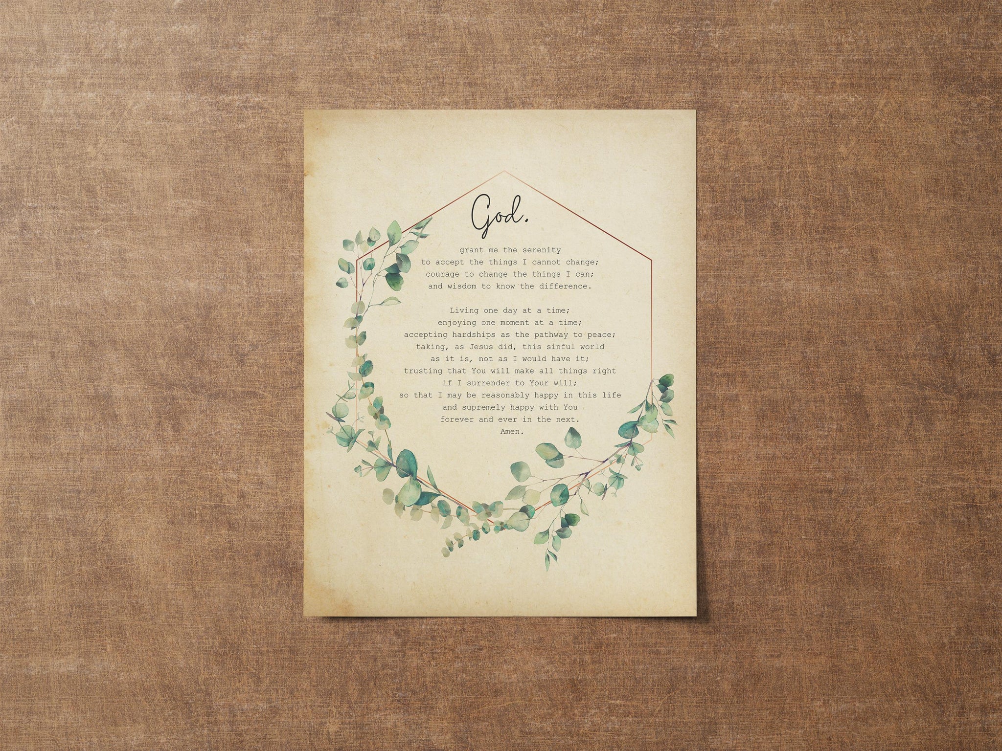 With elegant typography set against a soft vintage-style background and accented by delicate eucalyptus watercolor artwork, this piece blends rustic charm with spiritual depth. Whether you're seeking stillness in your own space or gifting someone support, this print offers a heartfelt message of acceptance, courage, and wisdom.