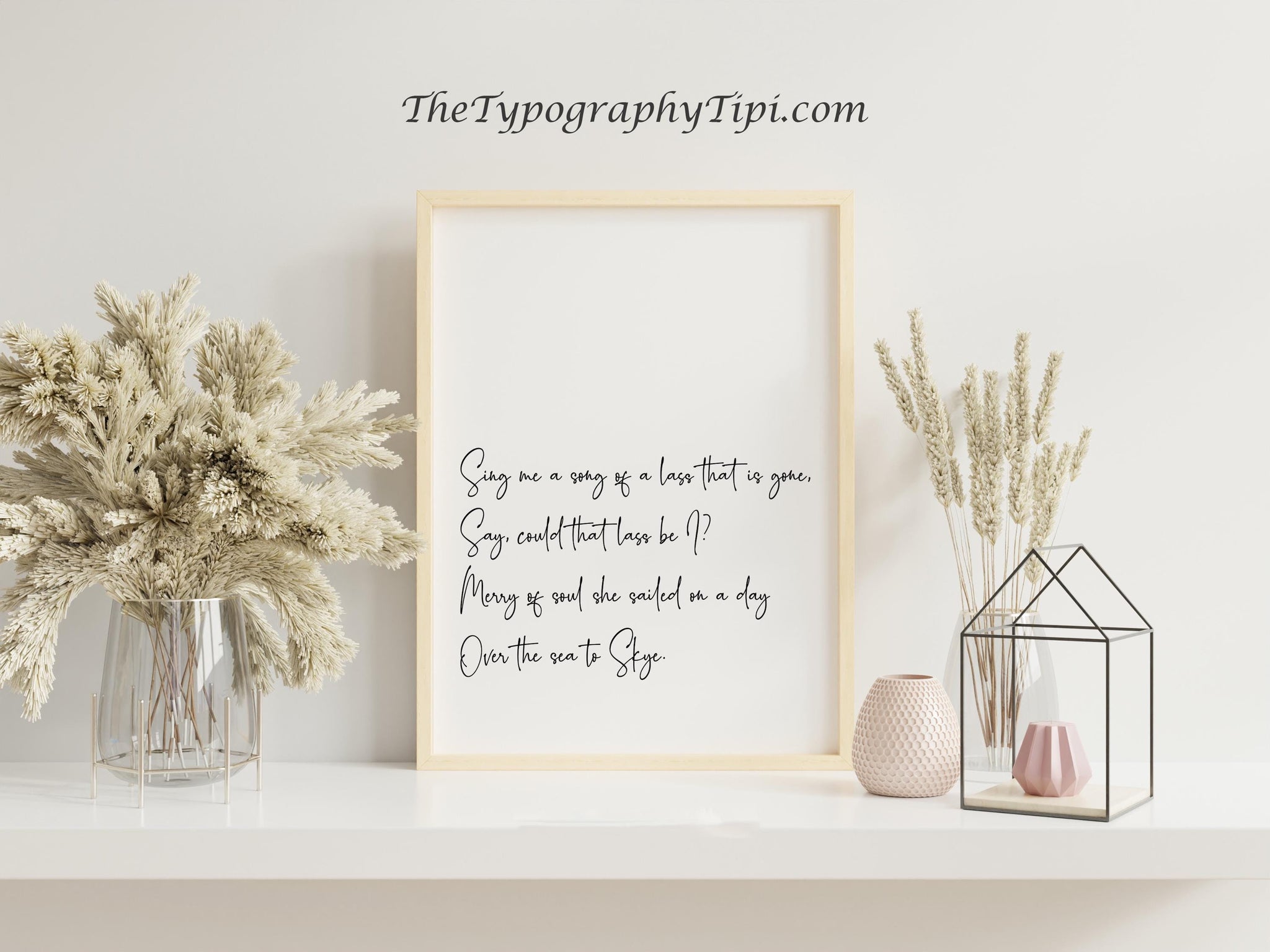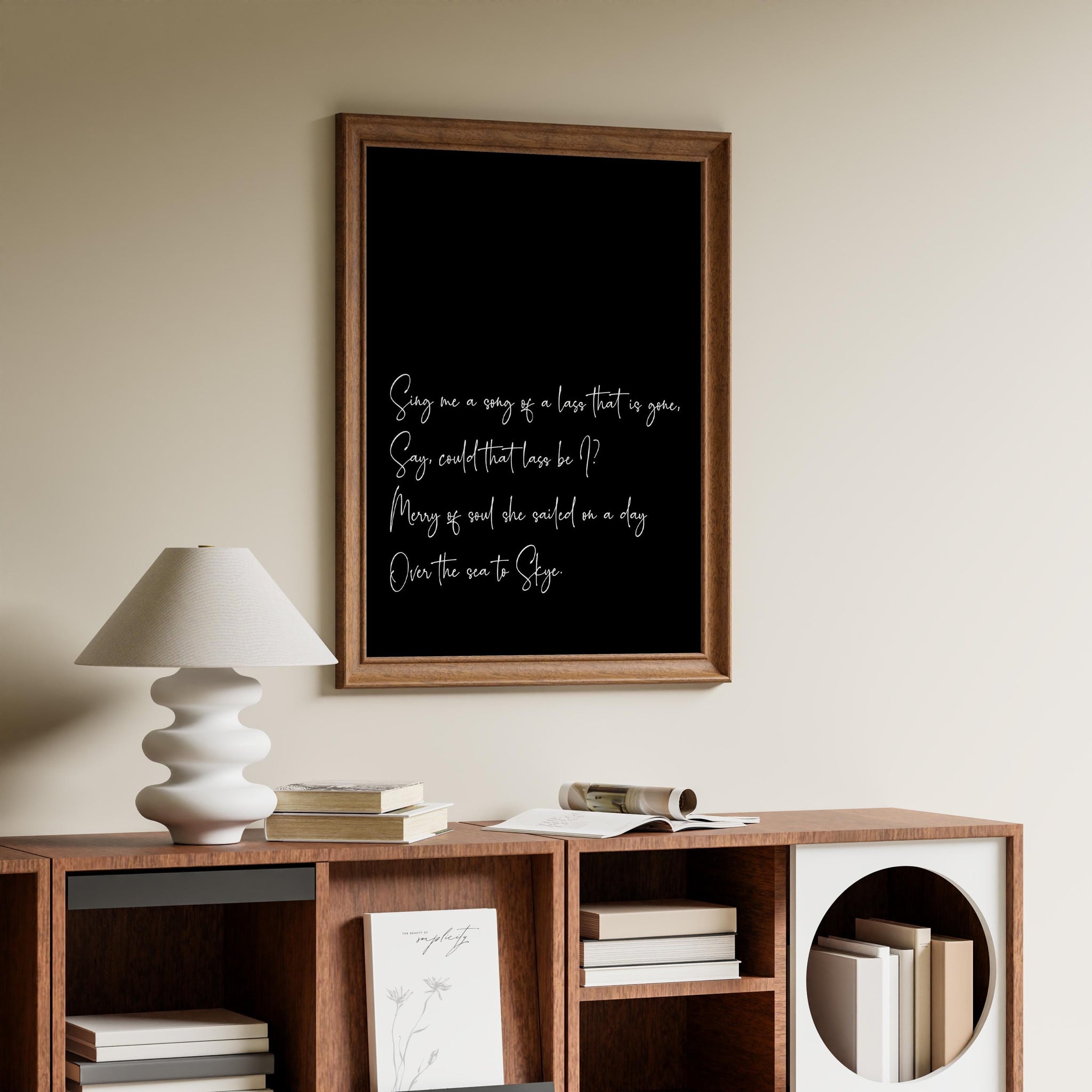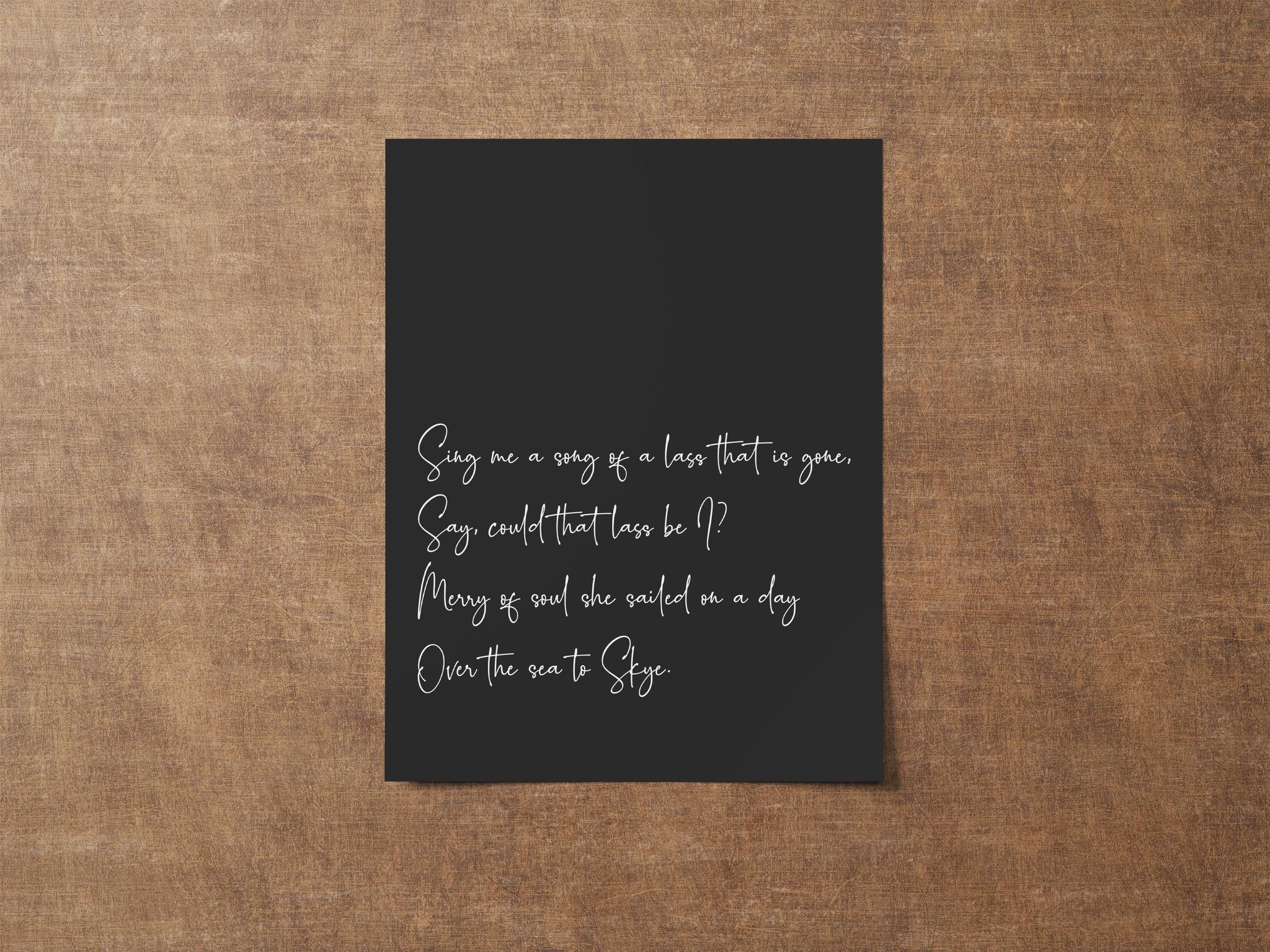 Bring timeless beauty and Scottish heritage into your home with this elegant Skye Boat Song print, featuring the beloved opening lines of the traditional Scottish ballad. The minimalist black and white typography design captures the haunting romance and wistful charm of “Sing me a song of a lass that is gone,” making it a perfect piece for lovers of poetry, music, and Celtic culture.