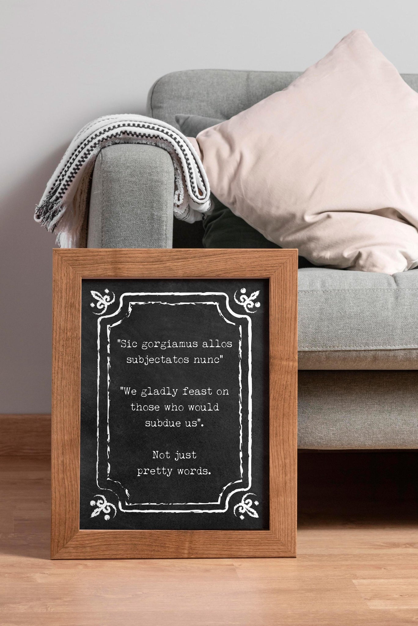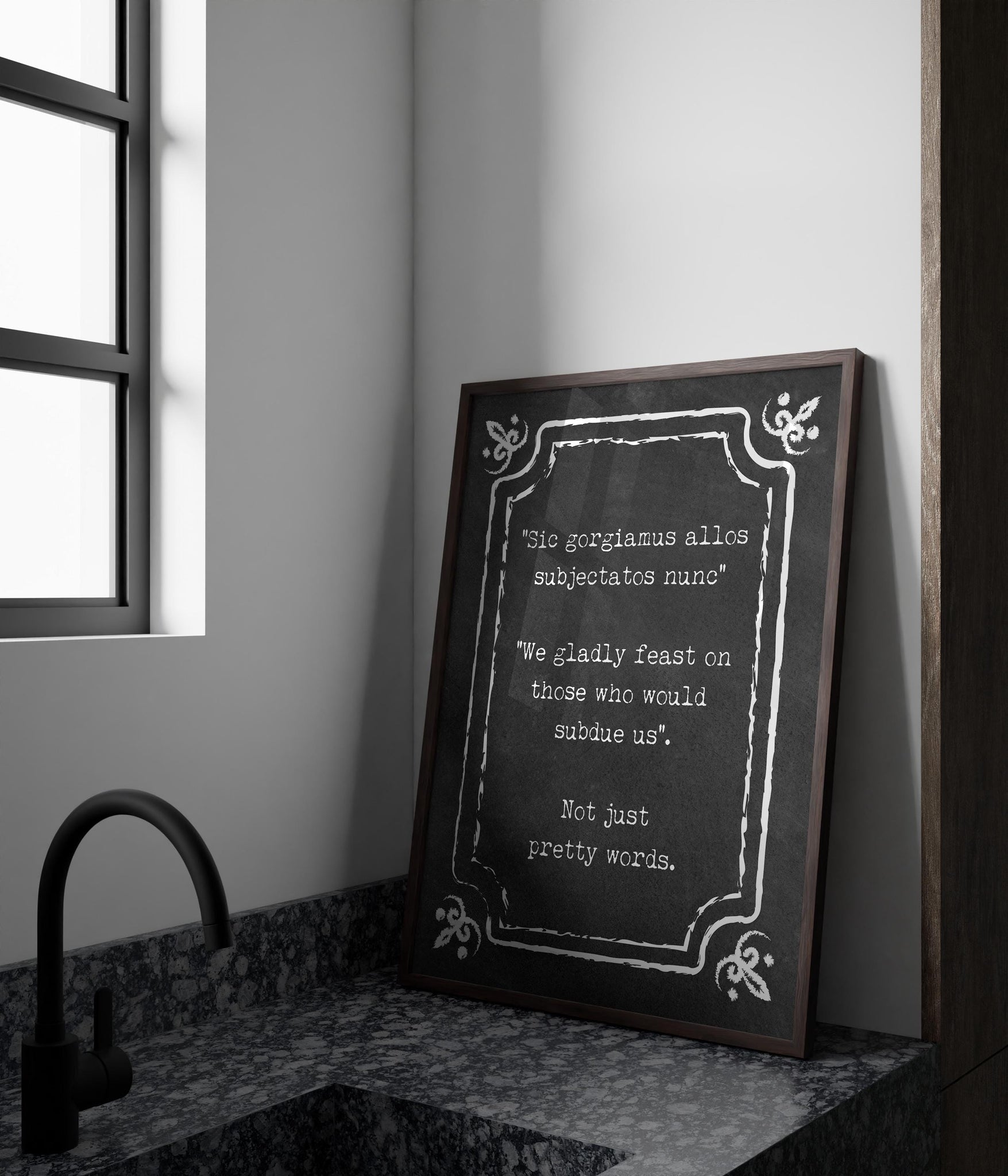 Embrace your dark side with this striking Addams Family Motto print, featuring the cult-favorite Latin phrase: "Sic gorgiamus allos subjectatos nunc" – translated as "We gladly feast on those who would subdue us."