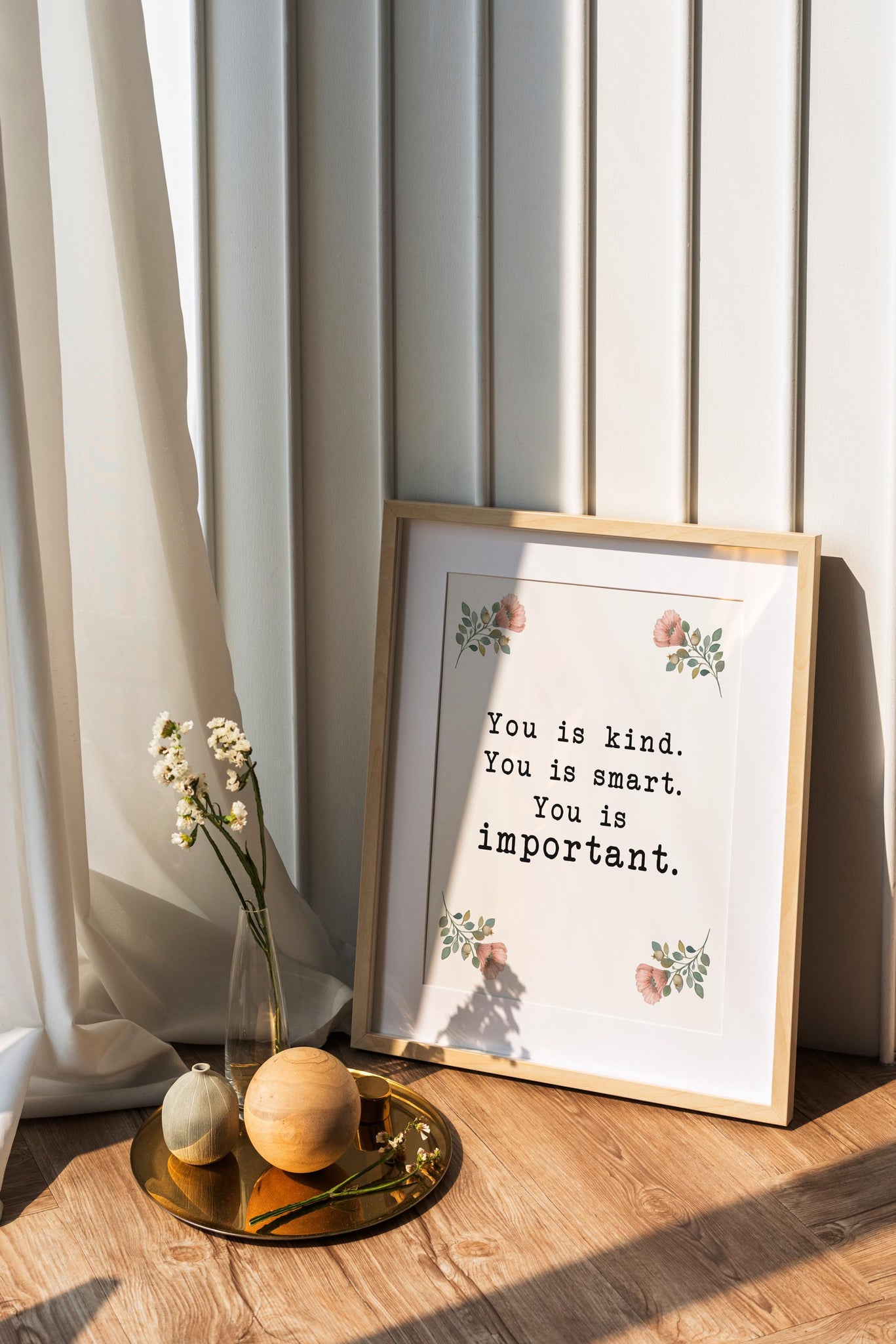 Celebrate the power of words with this inspirational quote print from Kathryn Stockett’s The Help. Featuring the iconic line, “You is kind. You is smart. You is important.”, this art print pairs bold typography with soft watercolor florals for a design that is both uplifting and beautiful.