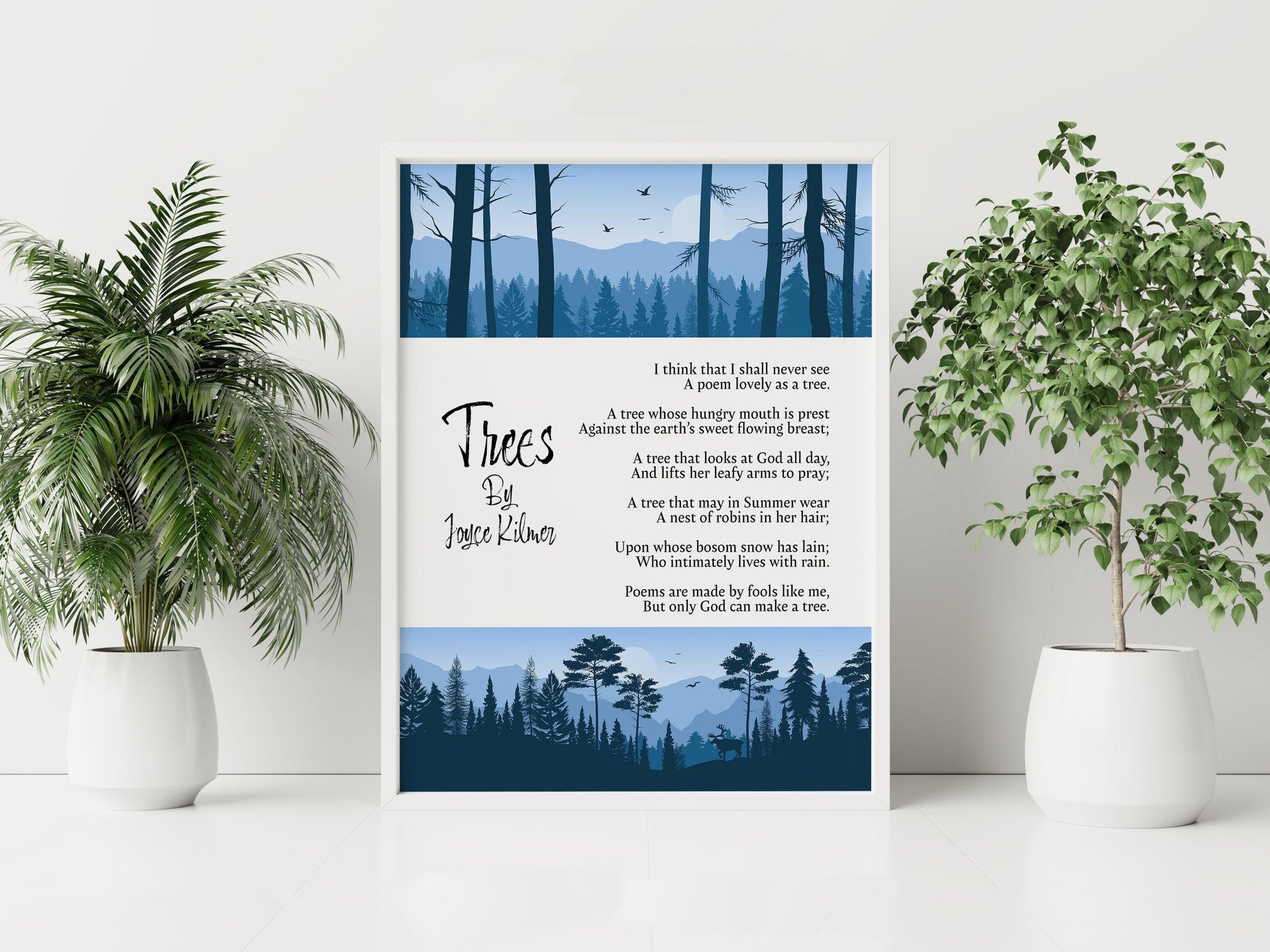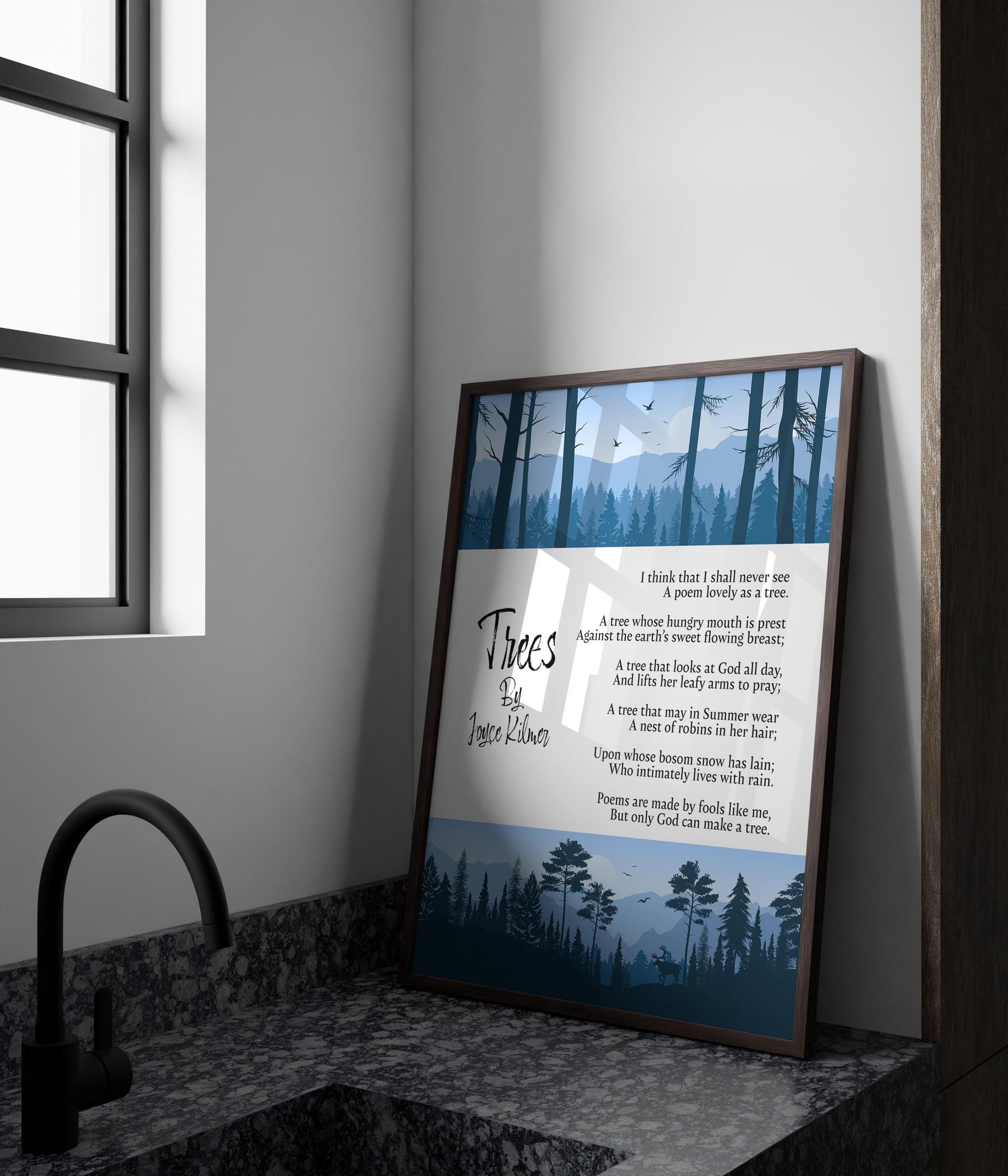 Celebrate the quiet majesty of nature with this poetic art print featuring "Trees" by Joyce Kilmer. Set against a soothing forest illustration in tranquil blue tones, this design pairs the classic poem with peaceful woodland silhouettes, evoking serenity, wonder, and spiritual connection.