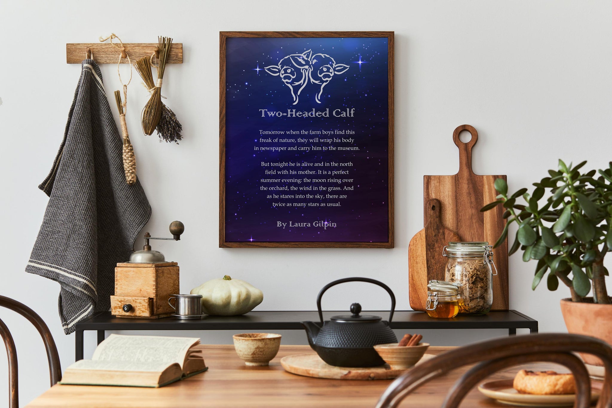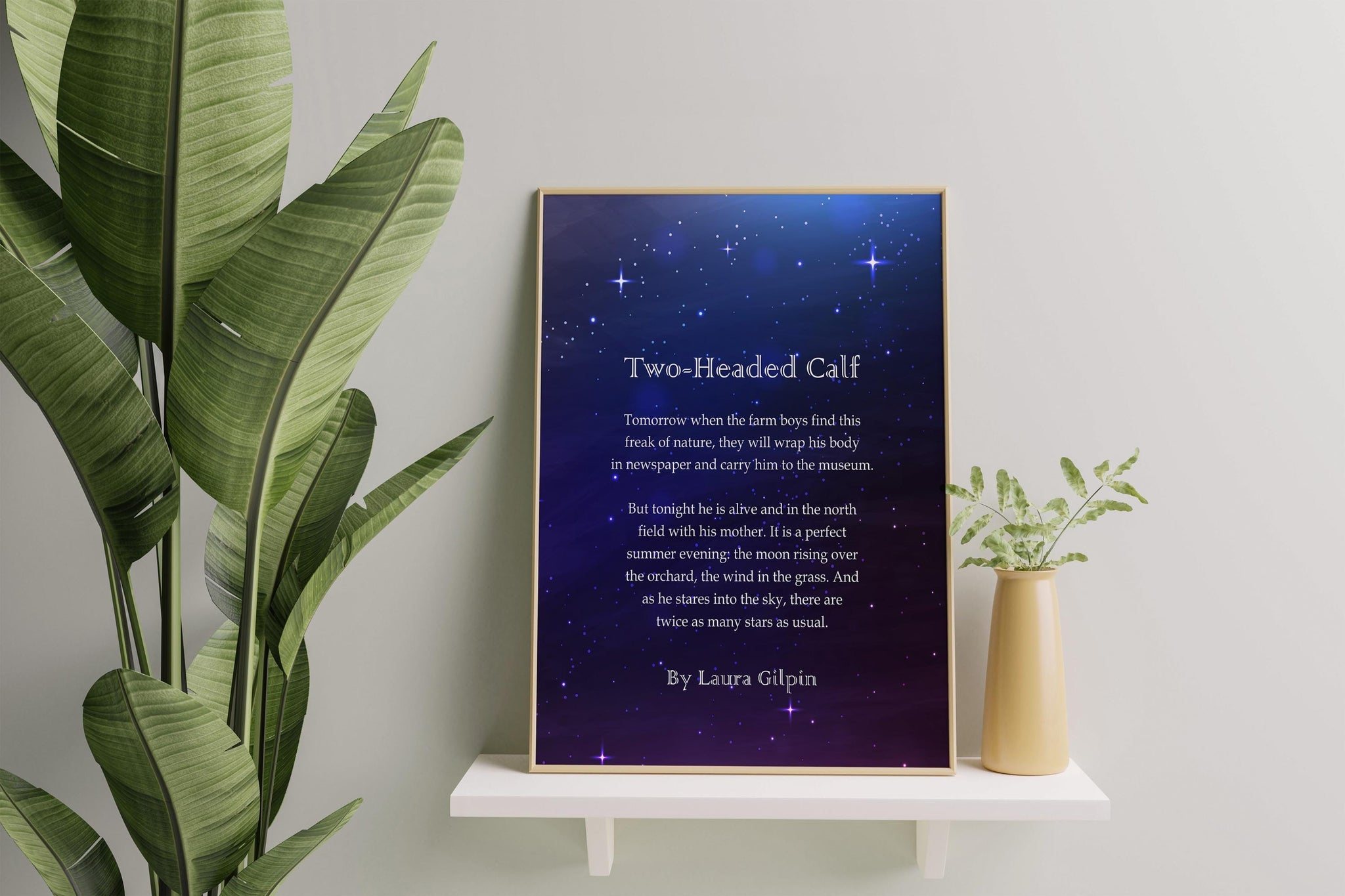 Capture the quiet magic and bittersweet beauty of Laura Gilpin’s beloved poem Two-Headed Calf with this stunning starry night print. Featuring the full poem in delicate white text over a dark indigo sky scattered with stars, this piece brings to life the wonder, innocence, and fleeting grace of an extraordinary moment.