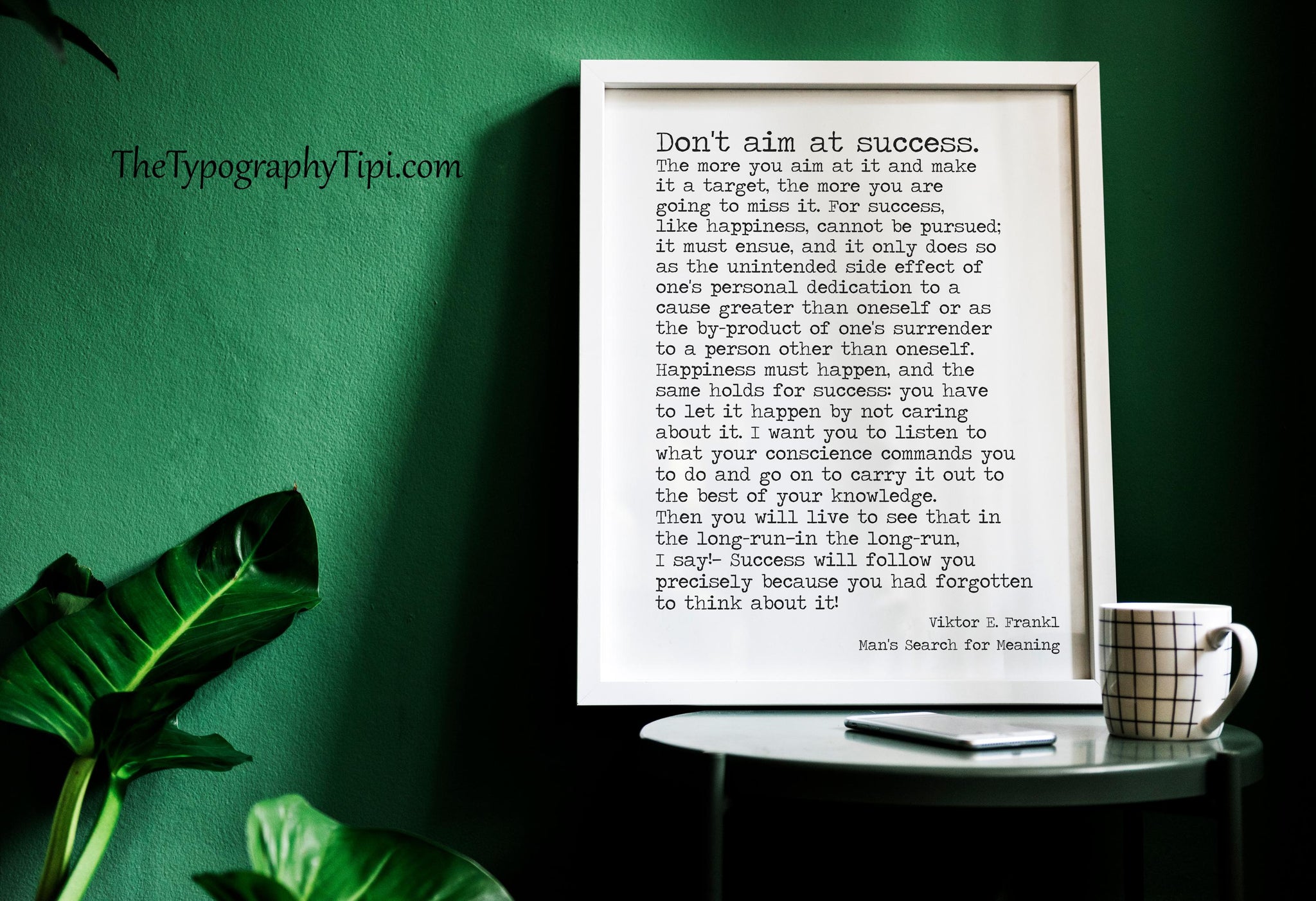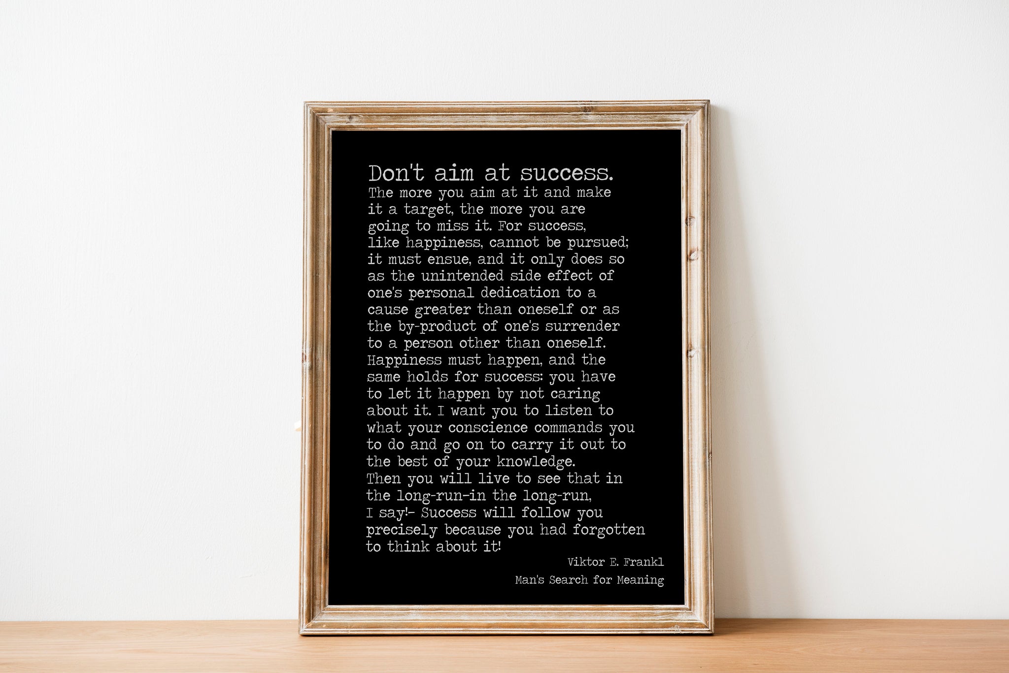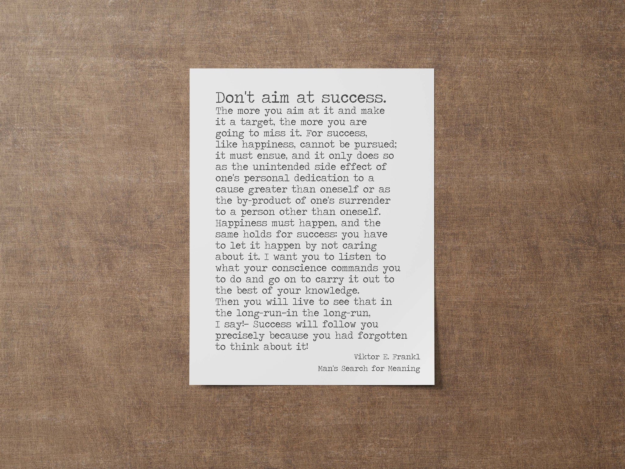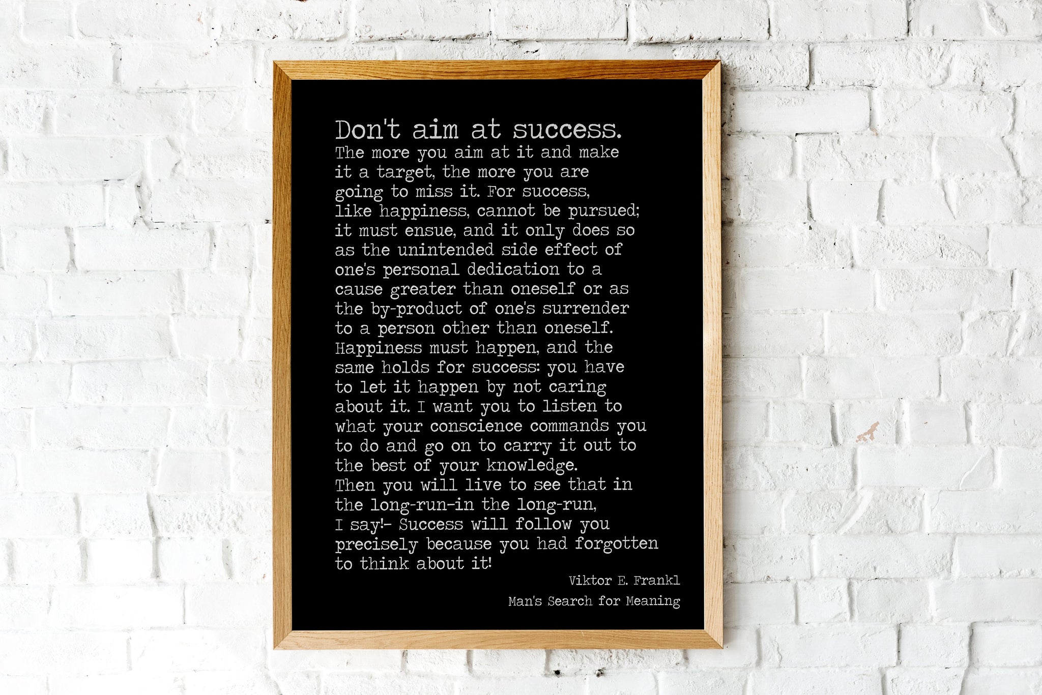 "Don't aim at success. The more you aim at it and make it a target, the more you are going to miss it. For success, like happiness, cannot be pursued; it must ensue, and it only does so as the unintended side effect of one's personal dedication to a cause greater than oneself or as the by-product of one's surrender to a person other than oneself. Happiness must happen, and the same holds for success: you have to let it happen by not caring about it. I want you to listen to what your conscience commands you to do and go on to carry it out to the best of your knowledge. Then you will live to see that in the long-run—in the long-run, I say!—success will follow you precisely because you had forgotten to think about it!"