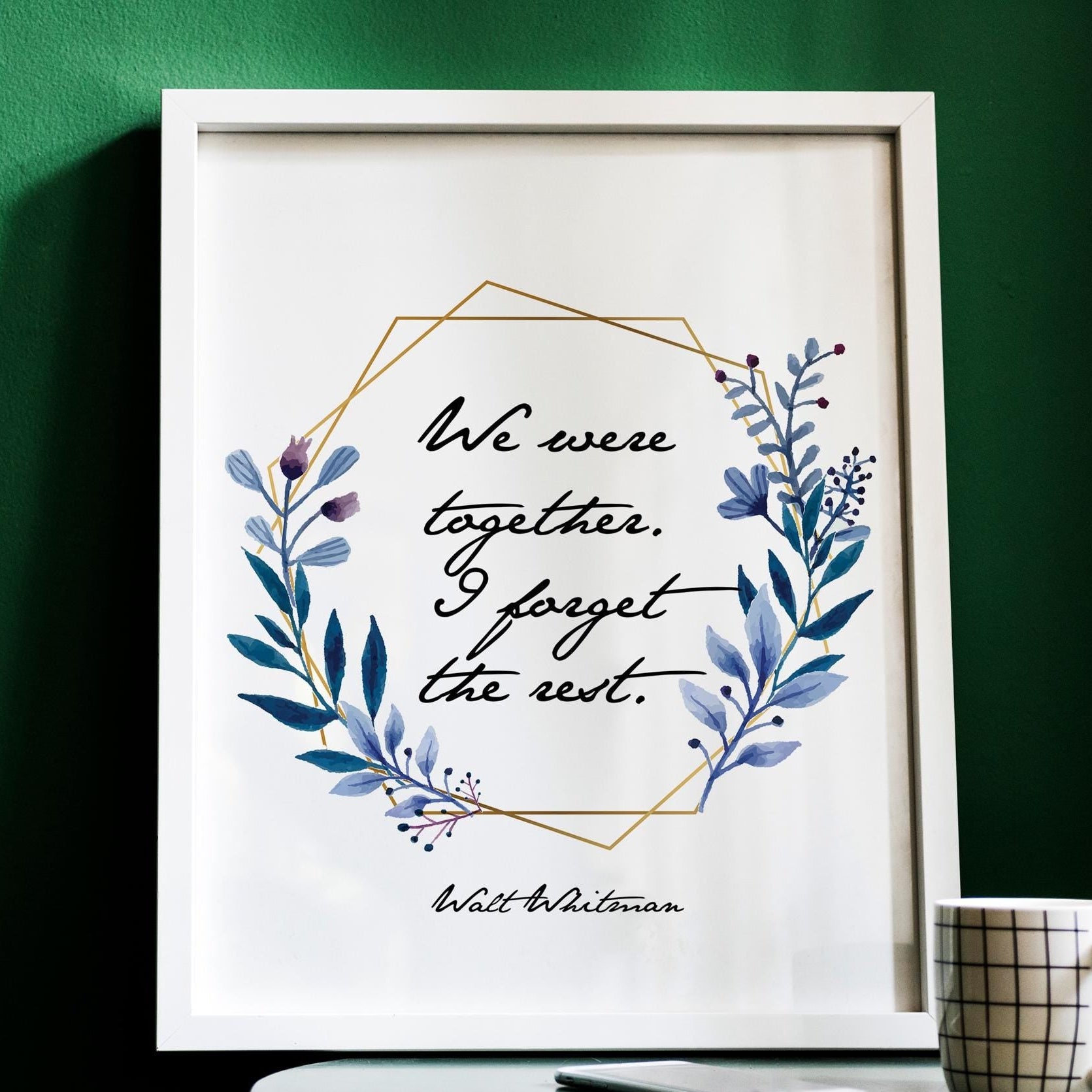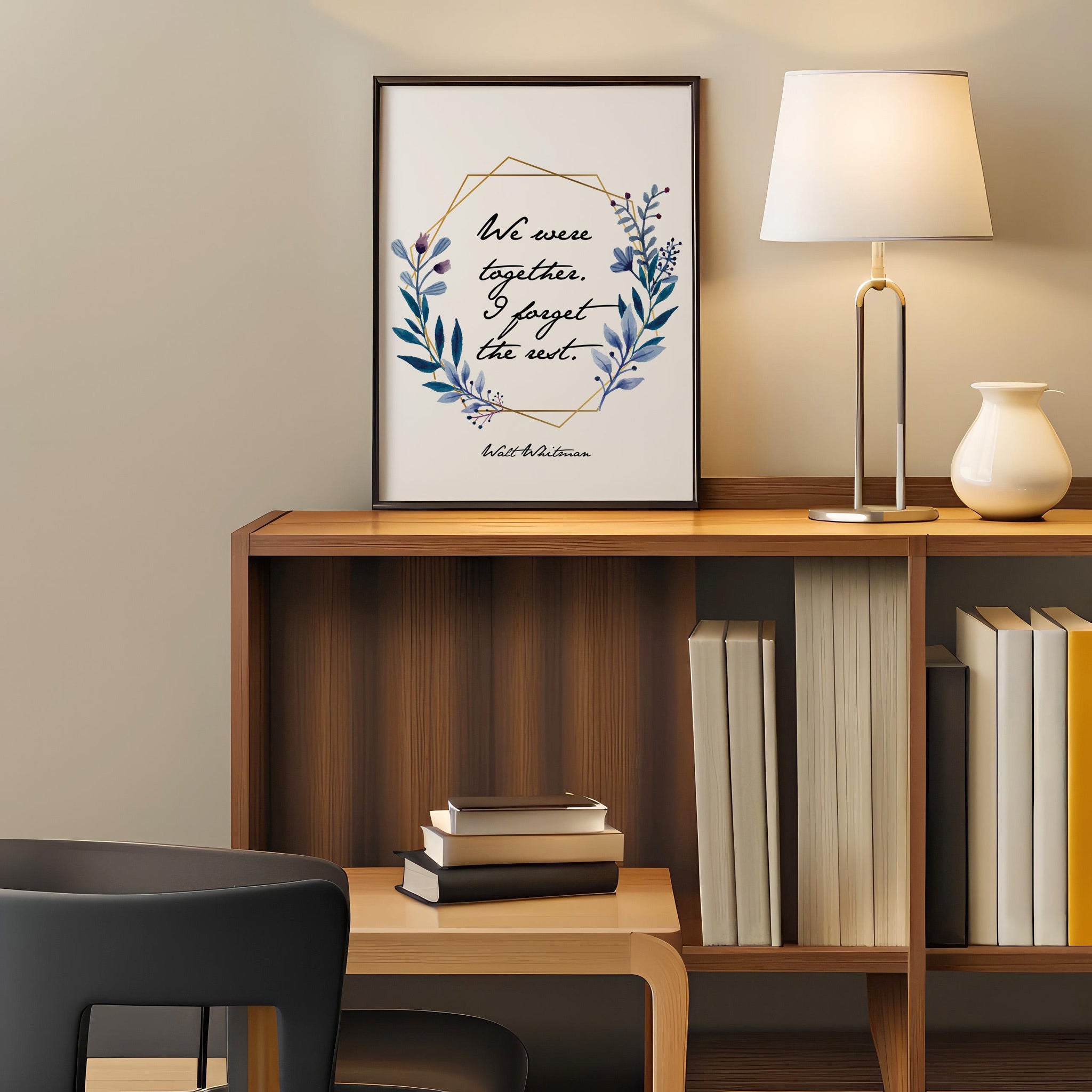 Bring warmth, tenderness, and poetic beauty into your home with this romantic floral quote art print, featuring Walt Whitman’s beloved line: “We were together. I forget the rest.” Surrounded by soft watercolor botanicals and accented with a modern geometric frame, this design blends natural elegance with heartfelt emotion—perfect for celebrating love, connection, and meaningful moments.