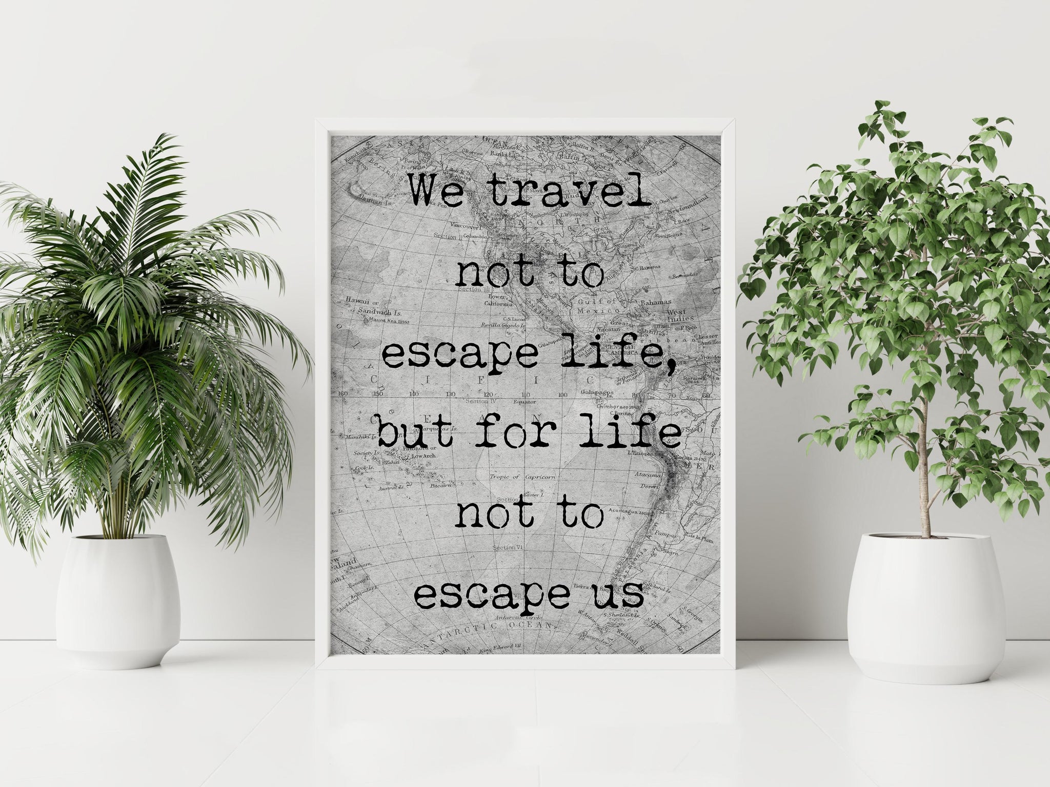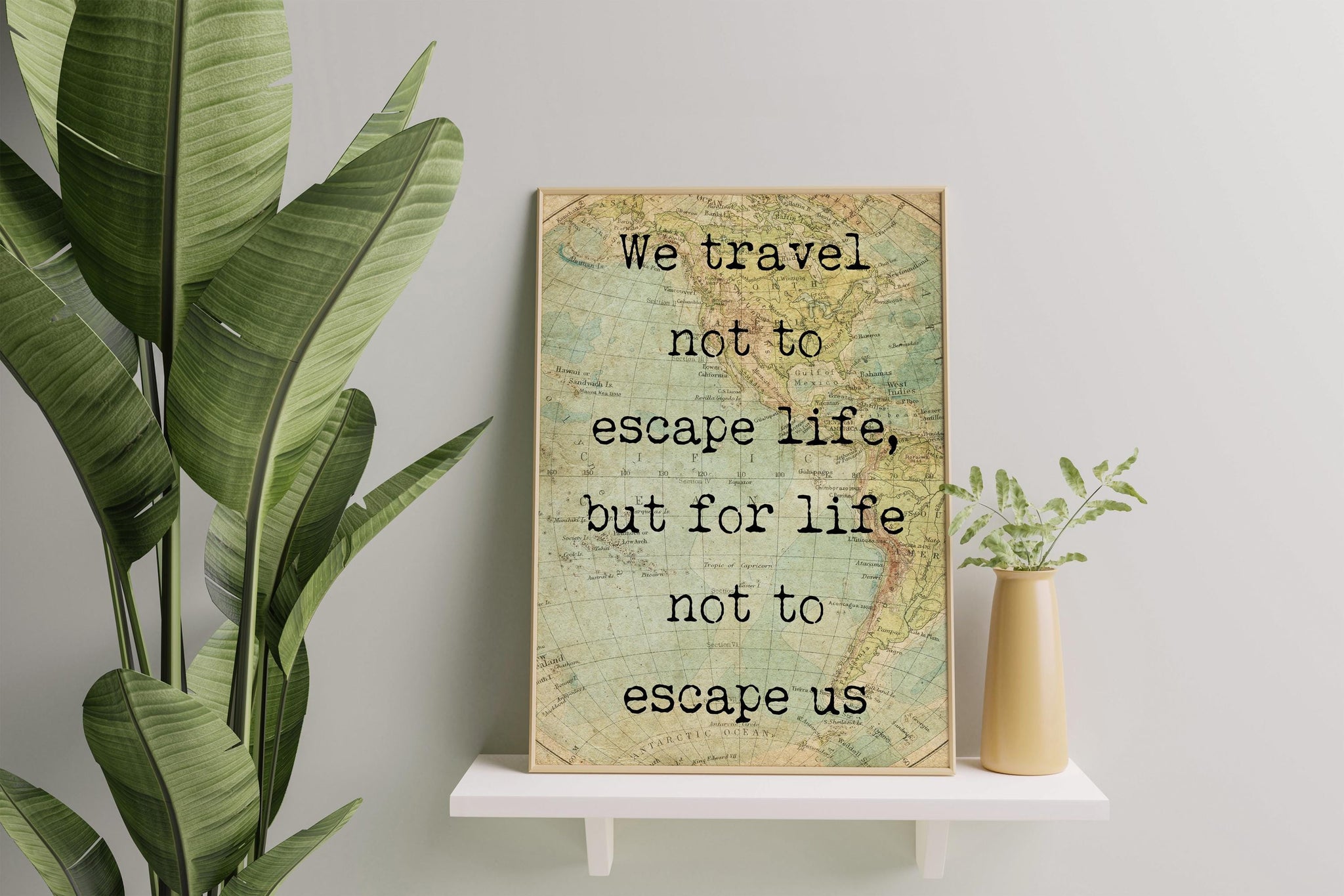 Set against an old-world map background, this piece evokes a sense of nostalgia and exploration. The typewriter-style font adds a timeless touch, making it the perfect decor for those who believe in the transformative power of travel.